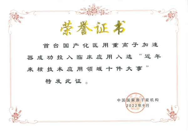 中国科学院近代物理研究所“首台国产自主知识产权医用重离子加速器成功投入临床应用”工作入选近年来核技术应用领域十件大事。近代物理所研制成功我国首台医用重离子加速器并投入临床应用,为重离子高端制造业、精准离子医疗等奠定了坚实的技术支撑,使我国成为全球第四个拥有自主研发重离子治疗系统和临床应用能力的国家,打破了国外垄断。