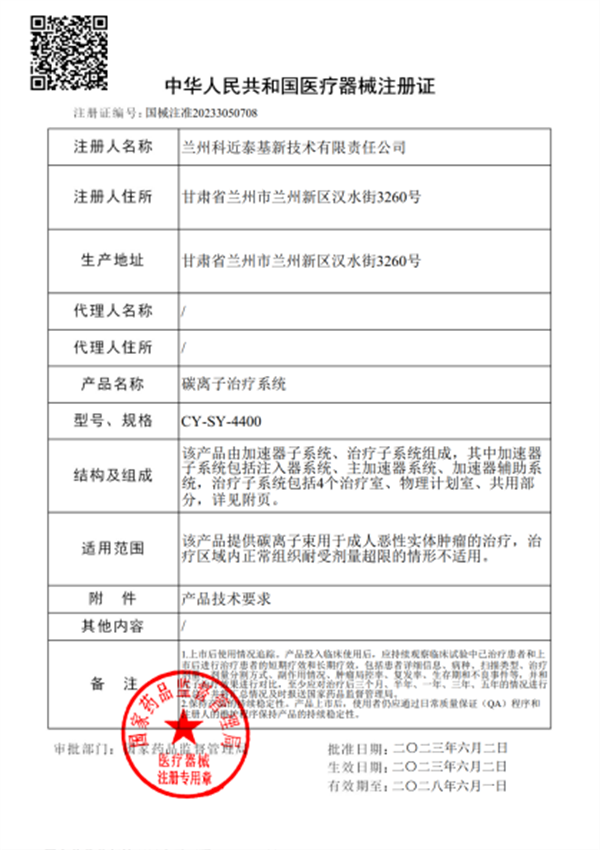 6月2日,安装于兰州重离子医院的国产医用重离子加速器——“碳离子治疗系统”获得国家药品监督管理局(NMPA)批准注册。