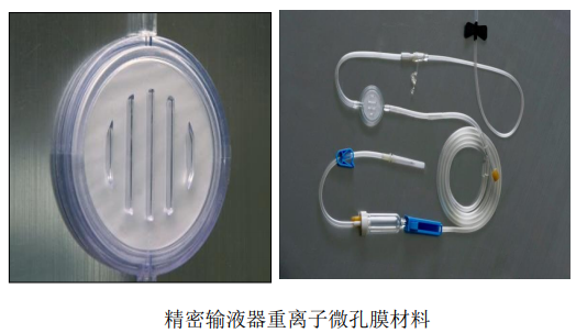 重离子微孔膜(nuclear pore membrane)又称核孔膜、径迹蚀刻膜等。它是利用高能重离子穿透聚合物薄膜后,经过化学蚀刻放大孔径,从而形成的多孔过滤材料。重离子微孔膜具有孔密度可控、孔径大小均匀可控、孔道形状规则、膜面光滑无纤维脱落等特点,被认为是世界上最精密的微孔膜材料。