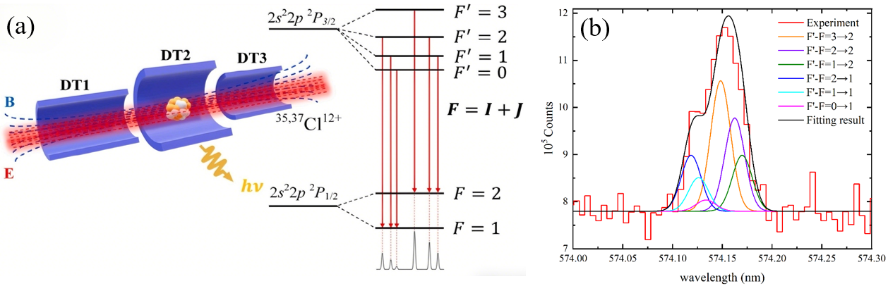 图1. (a) SH-HtscEBIT中Cl12+离子的束缚态和发射态的能级图,包括1𝑠22𝑠22𝑝2P价态的超精细结构。超精细能级用总角动量F=I+J标记,核自旋𝐼= 3∕2; (b) 类硼Cl12+离子的发射光谱,显示基态1s22s22p 2P精细结构能级间的M1跃迁(含超精细结构)。黑色实线为拟合结果,彩色实线和虚线分别代表35Cl和37Cl的超精细结构谱线。