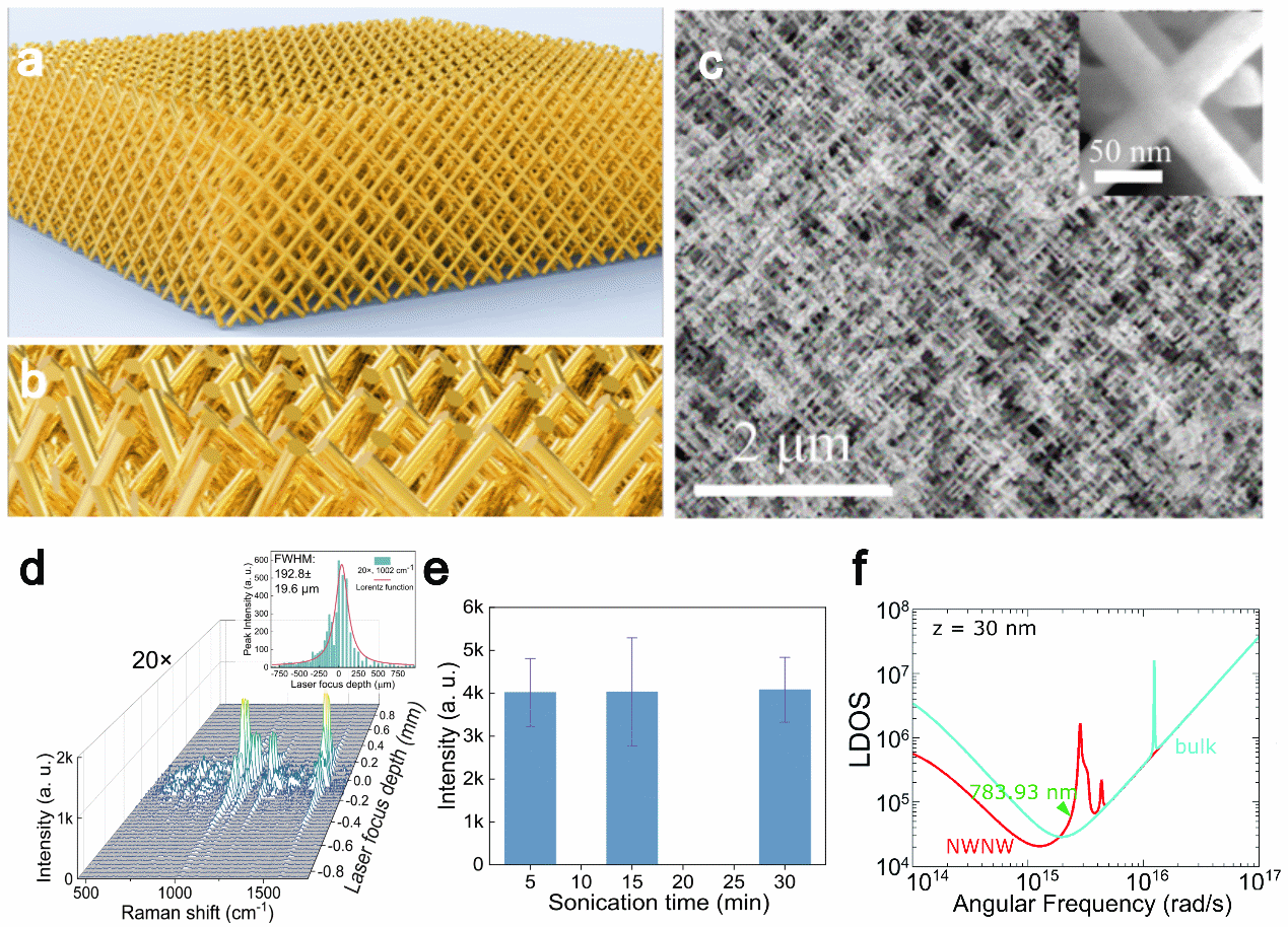 具有聚焦容忍性和结构稳定性的三维金纳米网格SERS衬底:a-b基于离子径迹技术制备的三维金纳米线网格模型;c金纳米线网格实物的扫描电镜照片,纳米线直径为35 nmd 三维衬底在20倍物镜下能够在离焦范围192.8±19.6 μm内保持50%SERS信号;e 超声水应力环境SERS稳定性测试,在30分钟超声后仍能保持信号稳定;f 有效介质模型反映出纳米线网格结构在激发光附近的高局域态密度。