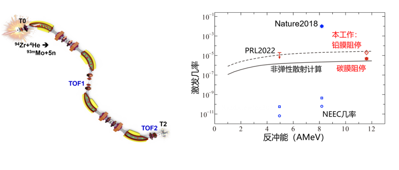 为了深入研究钼-93m的能量释放机制,研究团队基于兰州重离子研究装置(HIRFL)的放射性束流线(RIBLL1),进一步发展了低本底、高灵敏度的实验方法,成功实现了高纯度钼-93m束流的制备与测量。经过精密纯化后,钼-93m离子被注入到覆盖有铅箔或碳箔的探测器中。团队通过捕捉特征伽马射线,精确测量了钼-93m离子在穿透铅与碳材料减速过程中的能量释放几率,分别约为十万分之二与百万分之五。