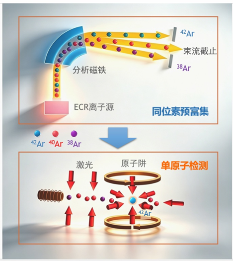 图1 :大气42Ar的测量。来自大气的氩气样品先经过预富集处理,除去大部分40Ar。富集后的氩样品被送入原子阱系统,进行42Ar同位素的单原子探测