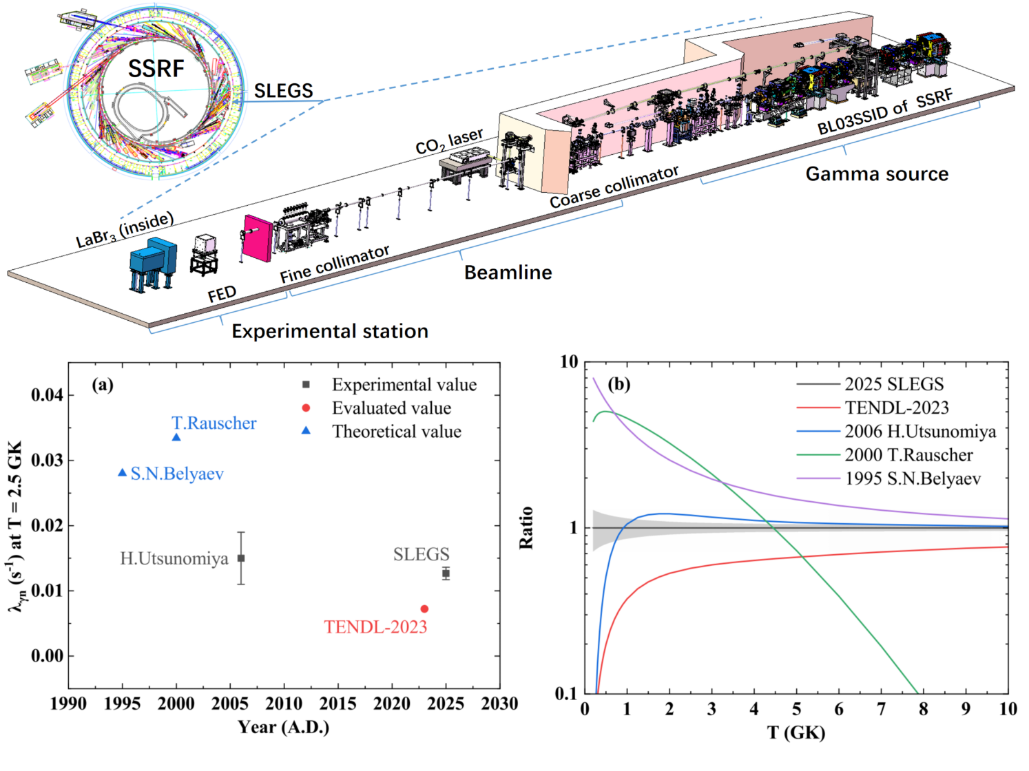 近日,中国科学院近代物理研究所高功率靶室研究团队在镧系核素镨-141光中子反应截面与热核反应率高精度测量研究中取得新进展。研究成果以“Direct determination of the astrophysical reaction rate of 141Pr(γ,n)140Pr at the SSRF-SLEGS”为题发表在《天文学与天体物理学》(Astronomy & Astrophysics)上