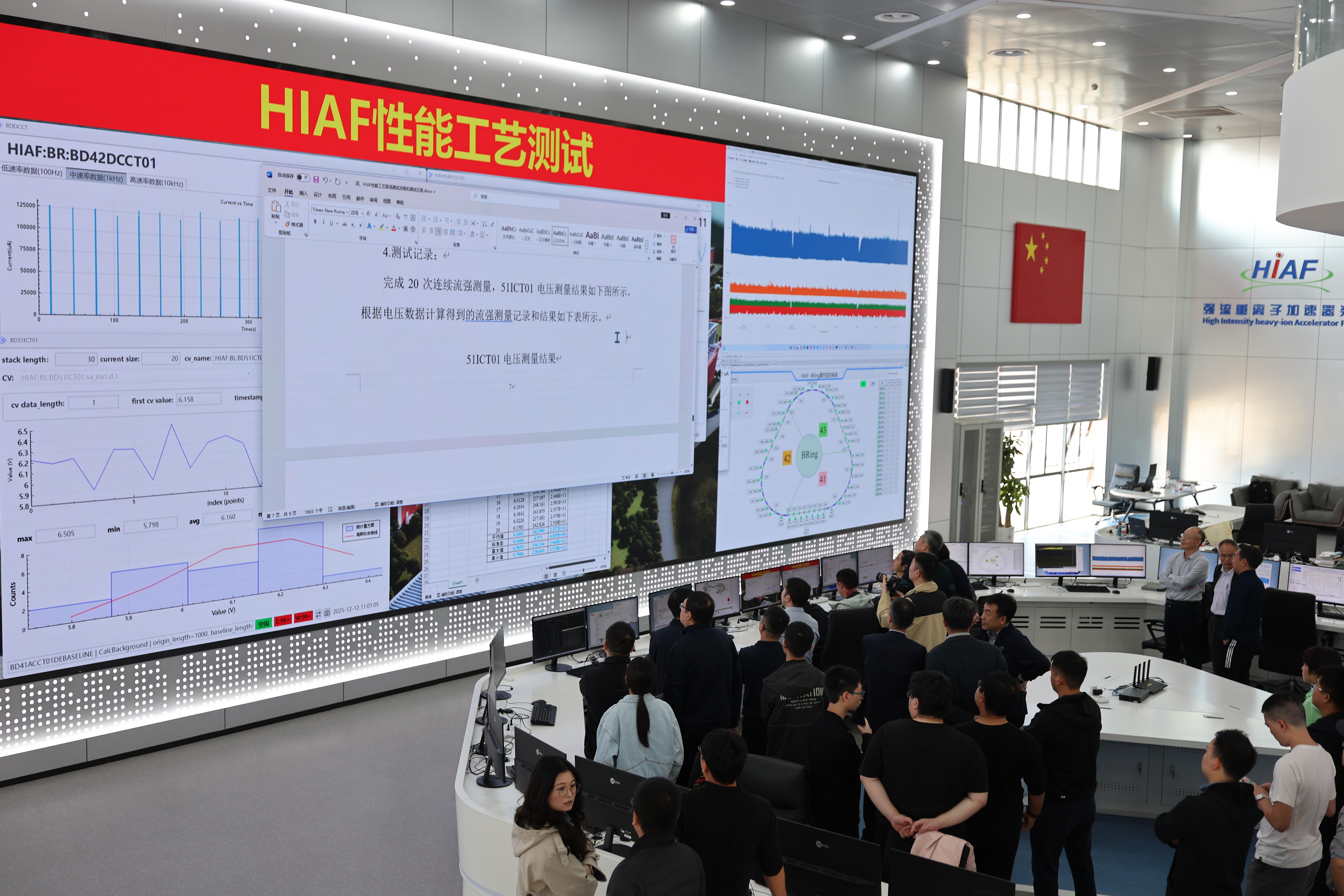 HIAF于10月27日启动首轮全面调试,24小时全线贯通,创造了大型加速器束流调试速度新纪录。11月22日,HIAF启动第二轮调试。项目团队攻克了相空间精准测量、双向涂抹注入、动态真空效应等一系列技术难题,在典型非金属元素束流调试中取得重要进展,超过了由德国重离子研究中心(GSI)保持10余年的国际流强记录(1×1011粒子数每脉冲)。