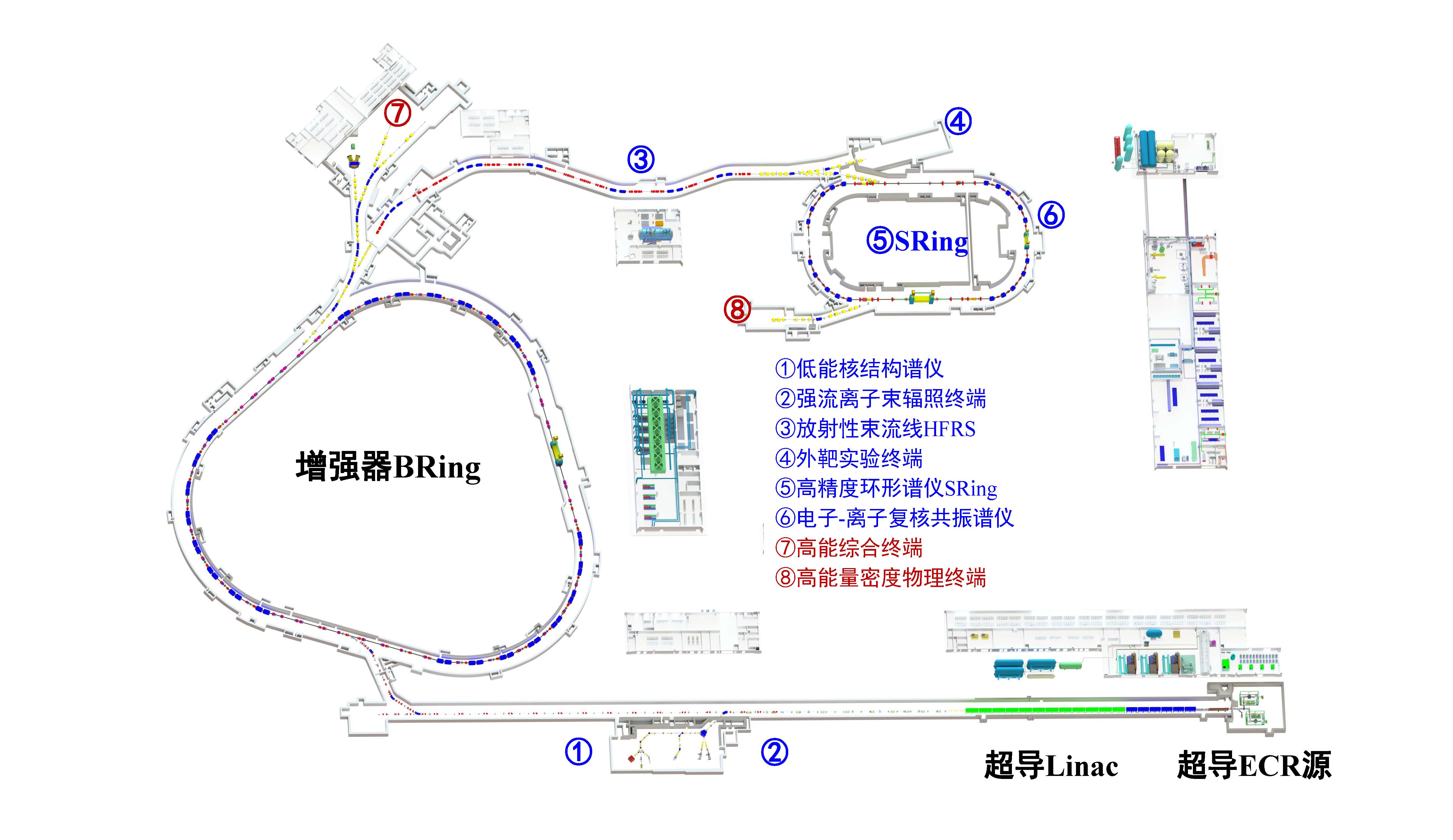 强流重离子加速器装置将建设一台具有国际领先水平的下一代强流重离子加速器装置,具备产生极端远离稳定线核素的能力,可提供国际上峰值流强最高的低能重离子束流、最高能量达4.25吉电子伏每核子(GeV/u)的脉冲重离子束流和国际上测量精度最高的原子核质量测量谱仪,为鉴别新核素、扩展核素版图、研究弱束缚核结构和反应机制、特别是精确测量远离稳定线短寿命原子核质量提供国际领先的研究条件。