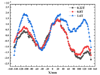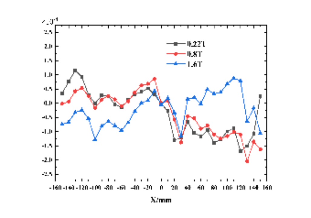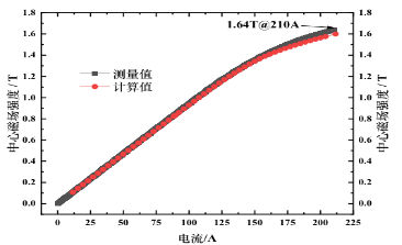 该超导二极磁体是HIAF放射性次级束流分离器关键组件之一,采用室温铁芯和超导线圈结构(温铁超导),有效长度2.74 m,好场区宽度300 mm,气隙高度140 mm,总重量约50吨,是目前国际加速器工程中结构尺寸最大的束线超导二极磁体。经过与低温阀箱集成、降温、励磁及磁场测量等测试过程,该磁体励磁测试时一次达到设计电流210A且未发生失超,中心磁场强度1.64T,好场区内均匀度优于±3×10-4的物理要求,结构与热学稳定性满足工程要求。