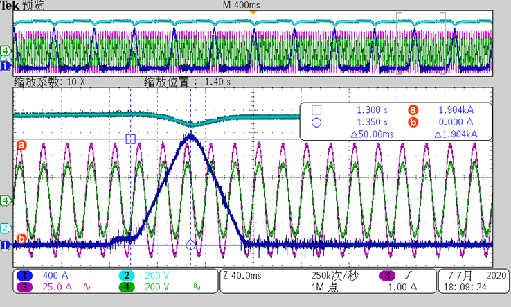 图1为功率单元1000V/1900A,40000A/s,1Hz拷机。