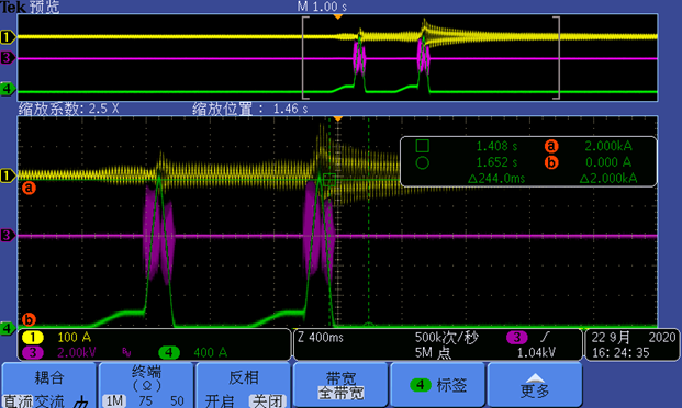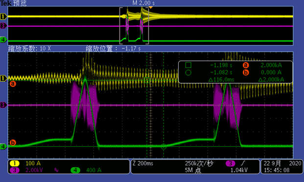 图4为4高压1低压串联负载43mΩ,10mH脉冲输出2000A。