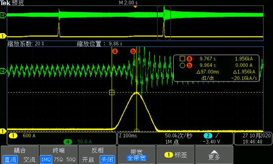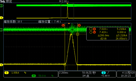 近期,项目组完成了支路一二极管整流1950A单脉冲测试,实现支路一1950A脉冲输出。完成了三厂家3支路并联5100A脉冲输出调试,完成整机12个高压源,3个低压源,前级二极管整流,5200A单脉冲输出测试,负载为17.2mΩ/4mH,输出电流超过设计值5100A,上升速率52000A/s。