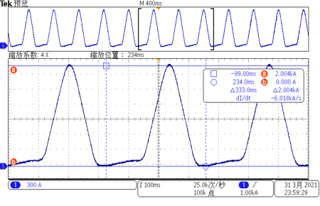 图片3为拷机电流波形:周期3Hz,333ms,平顶电流:2000A,满功率;
