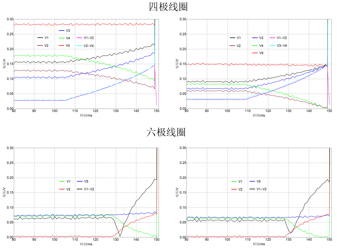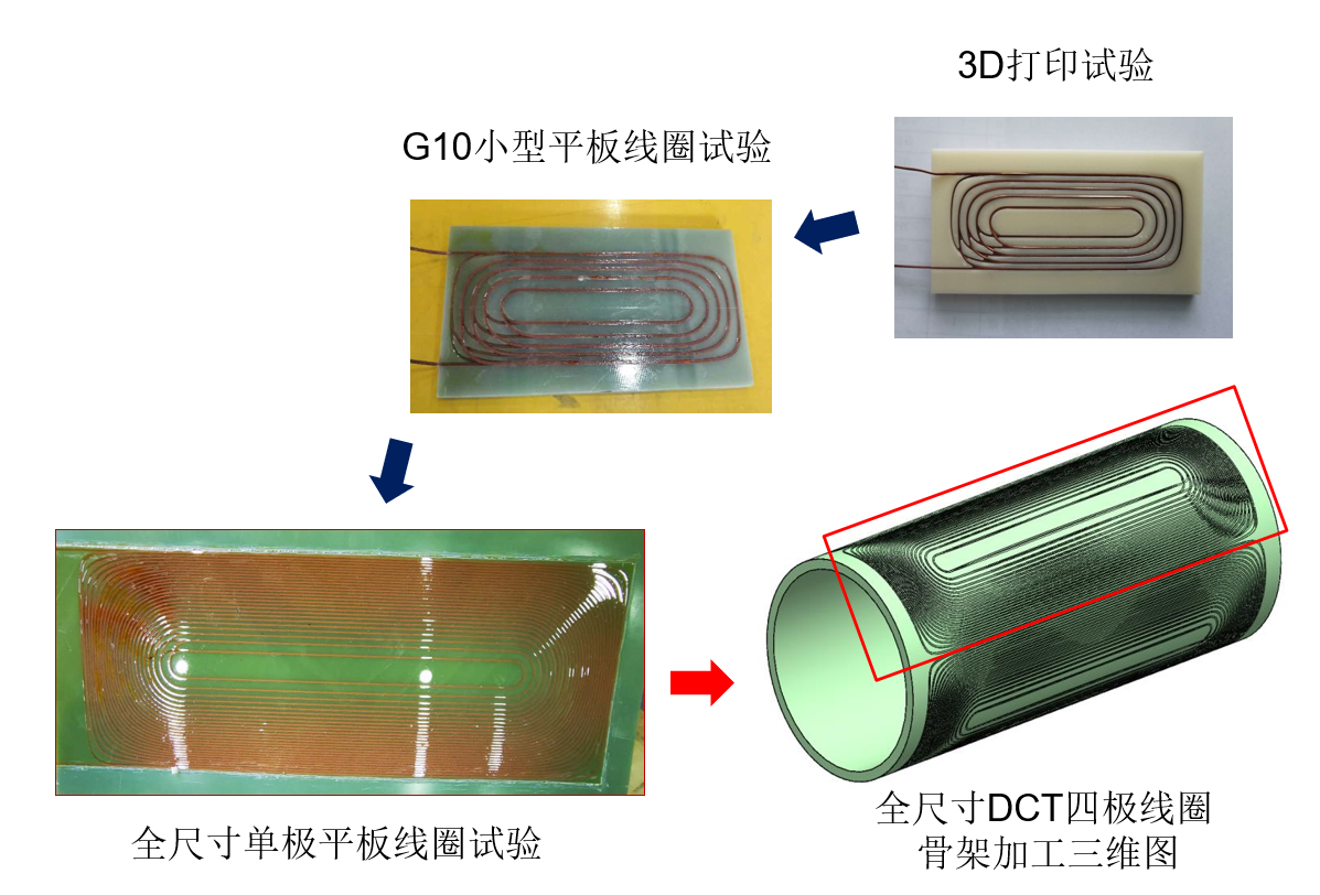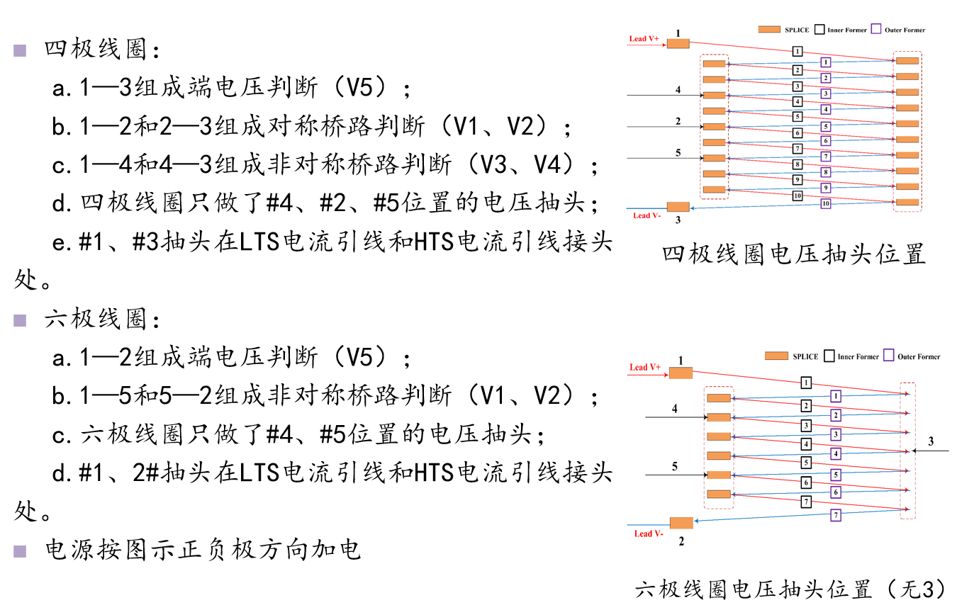 图1为L800全尺寸DCT四极和CCT六极组合磁体设计方案;图2为系列DCT单极平板线圈制作试验;图3为全尺寸单极平板试验线圈的加工过程;图4为CCT四六极线圈测试现场;图5为CCT四六极组合磁体电压抽头及超导接头接线图;图6为对CCT四六极线圈在失超过程中各电压信号变化的检测。