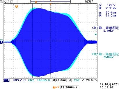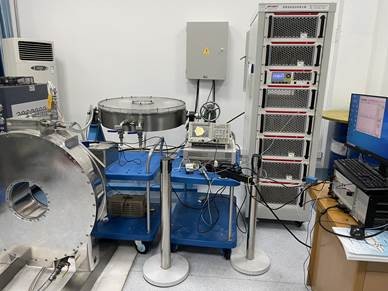 2021年10月,完成磁合金样腔整腔加工,经过9.6公斤打压、24小时保压测试,未发现漏水漏压现象。目前,腔体各部件打包完成,准备发货;完成低电平系统扫频模式测试,在全尺寸φ820mm单Tank腔上测试得到的腔体电压波形与给定波形符合度较好,说明腔体具有较好的宽频带特性及快响应特性;完成样机60kW油冷机加工及调试,准备发货。