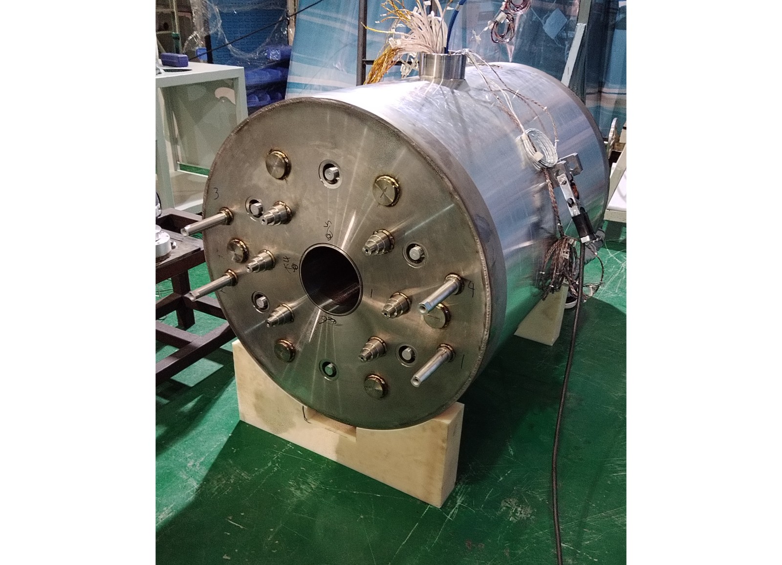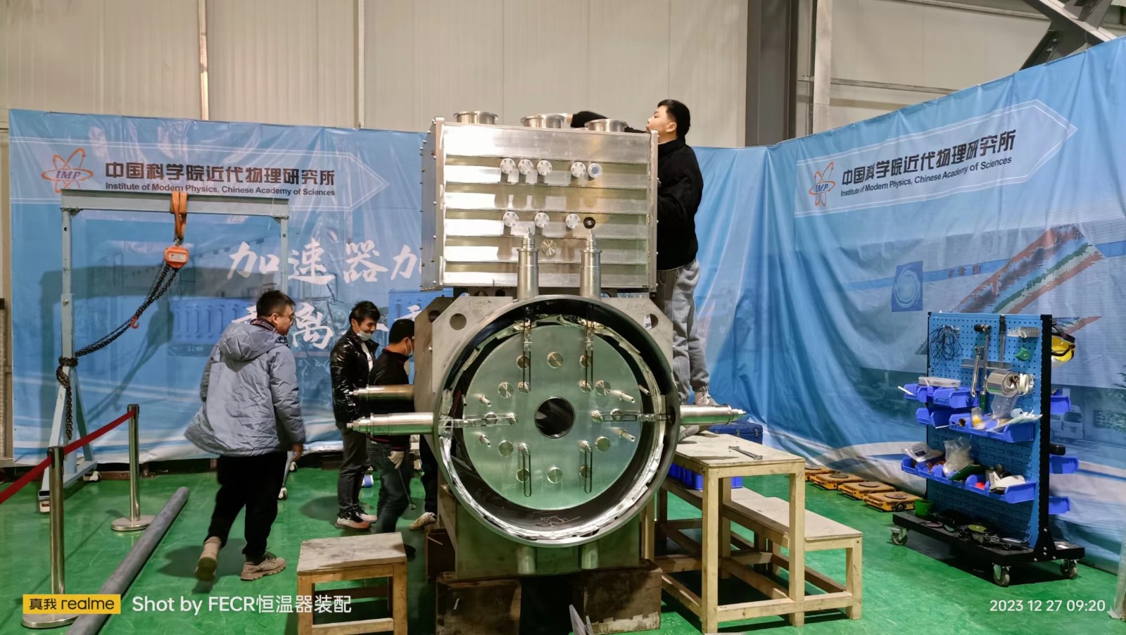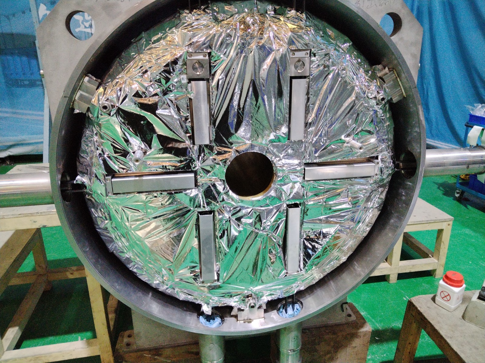FECR超导磁体励磁达到预期目标(设计值93%),本轮垂直测试完成。随后超导磁体回温,与此同时超导磁体低温恒温器厂家进行相应的准备工作,开始低温恒温器集成。10月23日,FECR超导磁体从北面滩测试现场顺利运抵厂家。同时,开展低温保持器关键组件依次进行检漏等集成前的工作。将超导磁体转移出运输工装后并翻转至水平,开始氦槽集成。接下来氦槽注入端端板、引出端端板及筒体的安装、就位和焊接。至12月底,FECR超导磁体的氦槽集成完成,并将氦槽转移进外杜瓦中,安装冷屏。焊接维护塔与外杜瓦,并安装拉杆座。增加外杜瓦筒体上部加强板等焊接工装,减少焊接过程中出现的筒体形变。