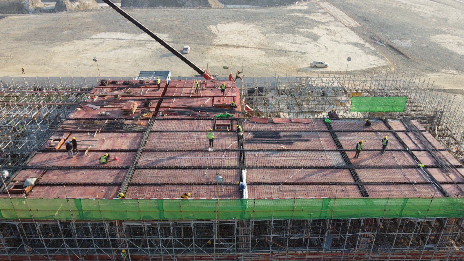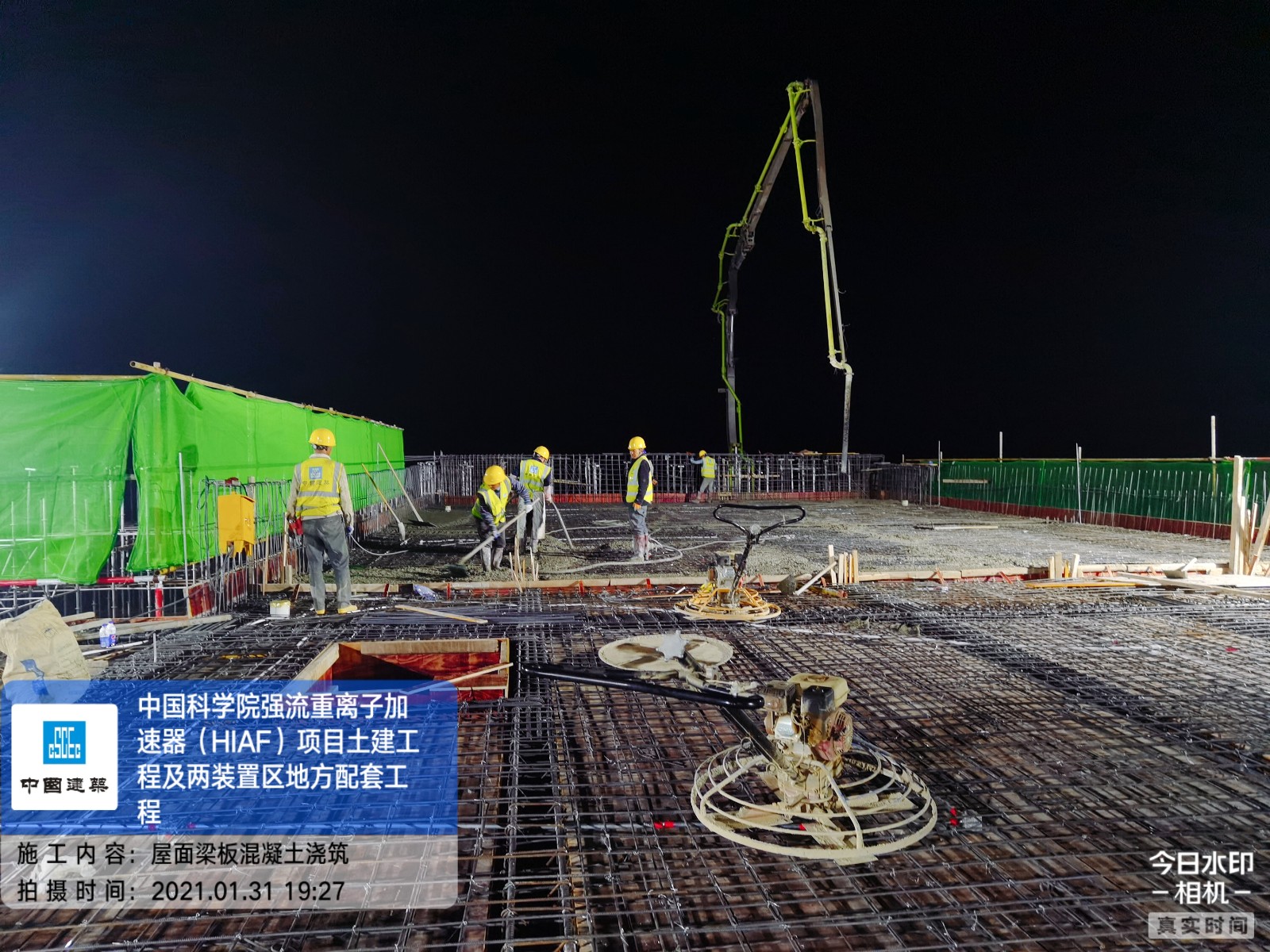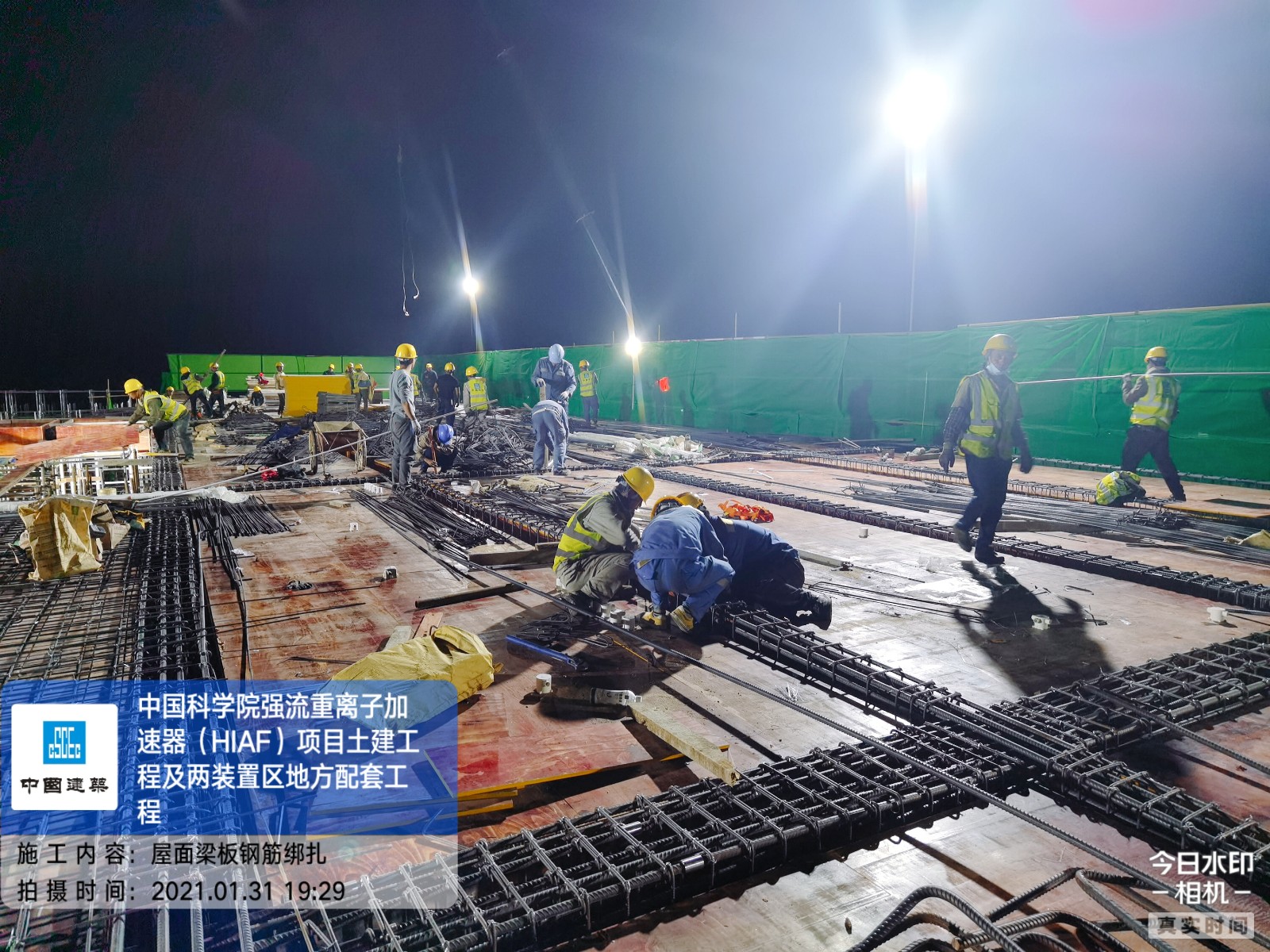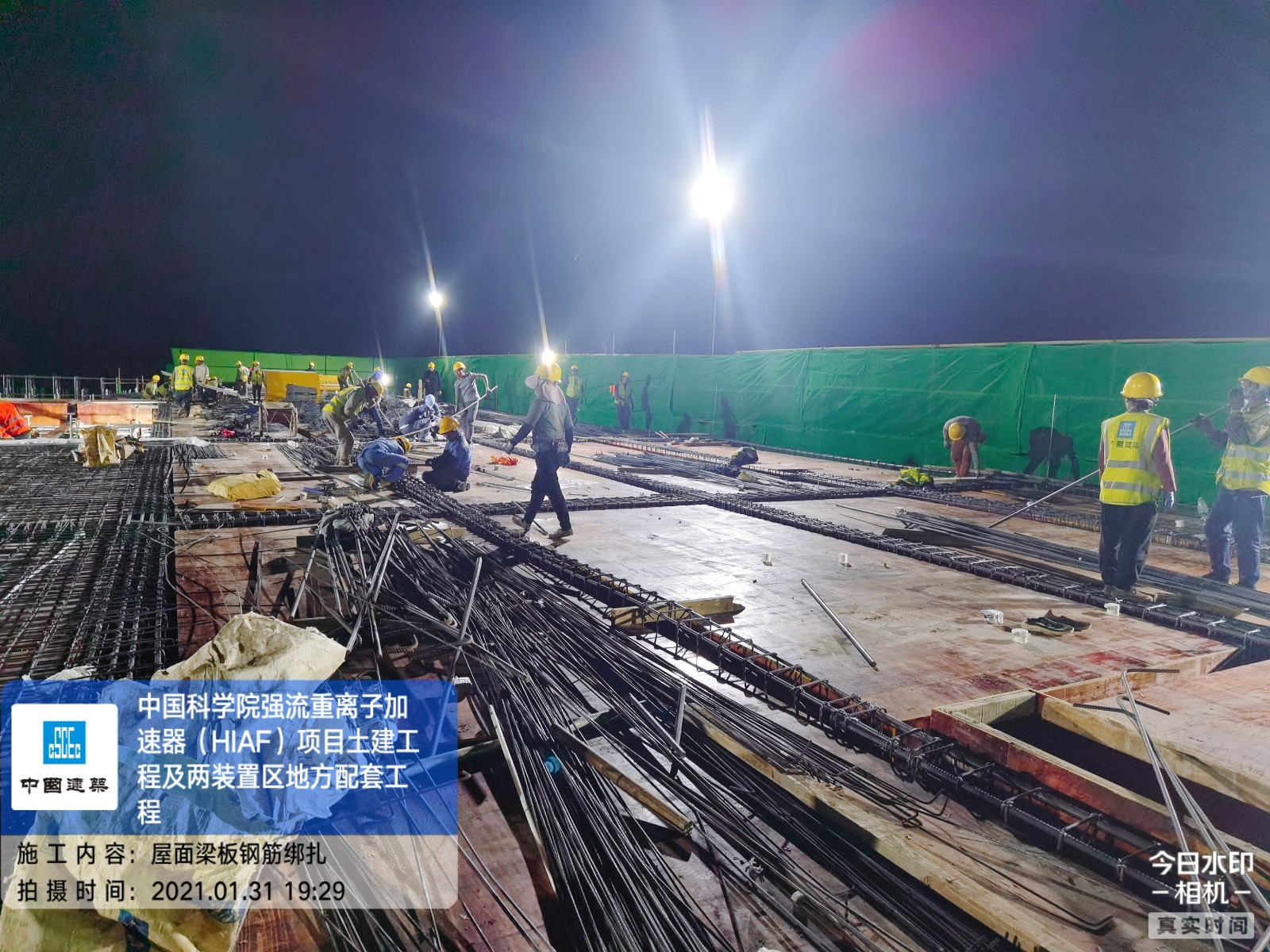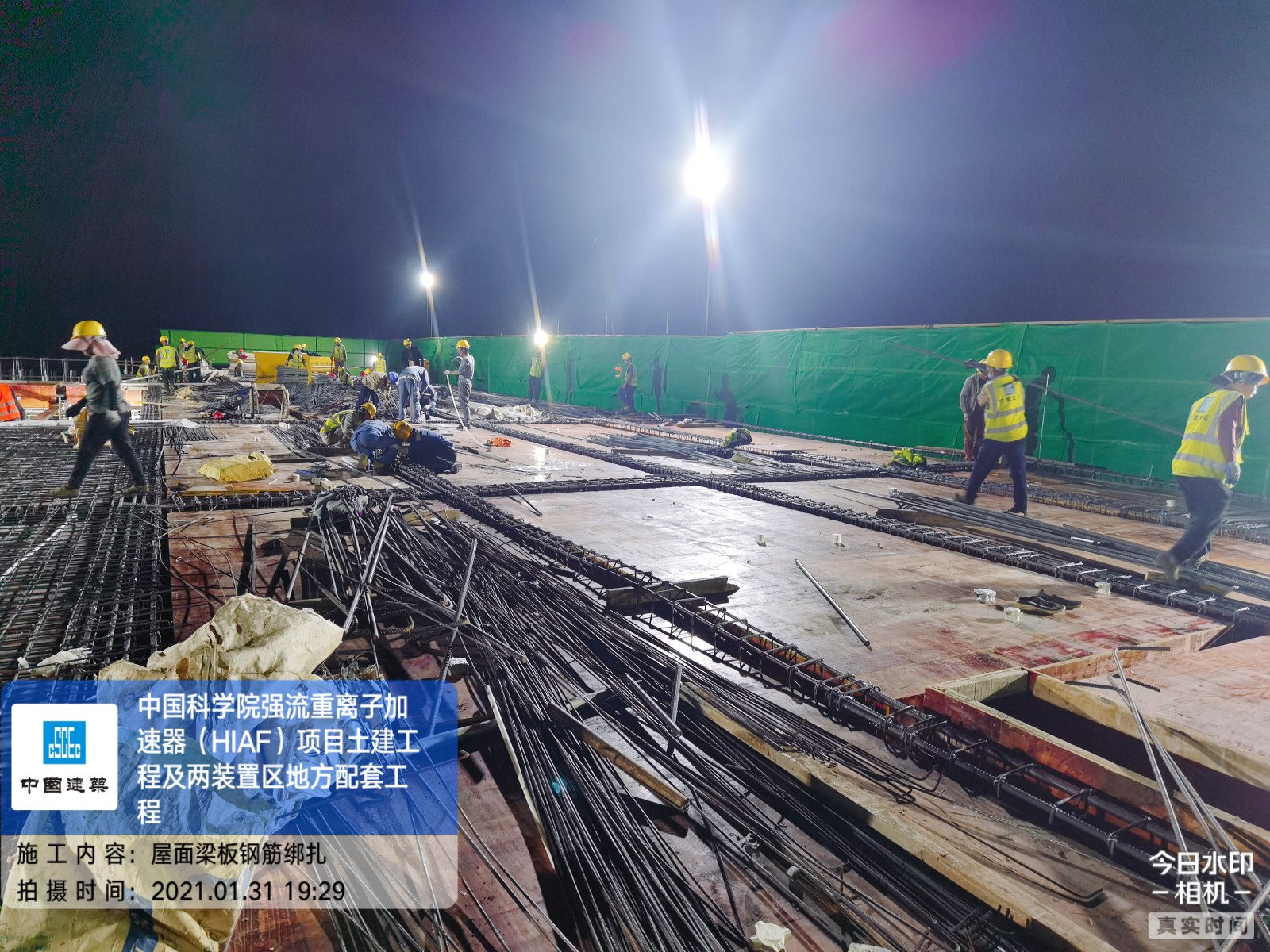 截至2021年1月31日,HIAF运行楼施工已完成混凝土浇筑、梁钢筋绑扎、屋面层脚手架搭设、1-5/A-E轴花架梁内架搭设、1-5/A-E轴二层梁板模板铺设、5-12轴A-E轴屋面层梁板模板铺设、二层柱钢筋绑扎。