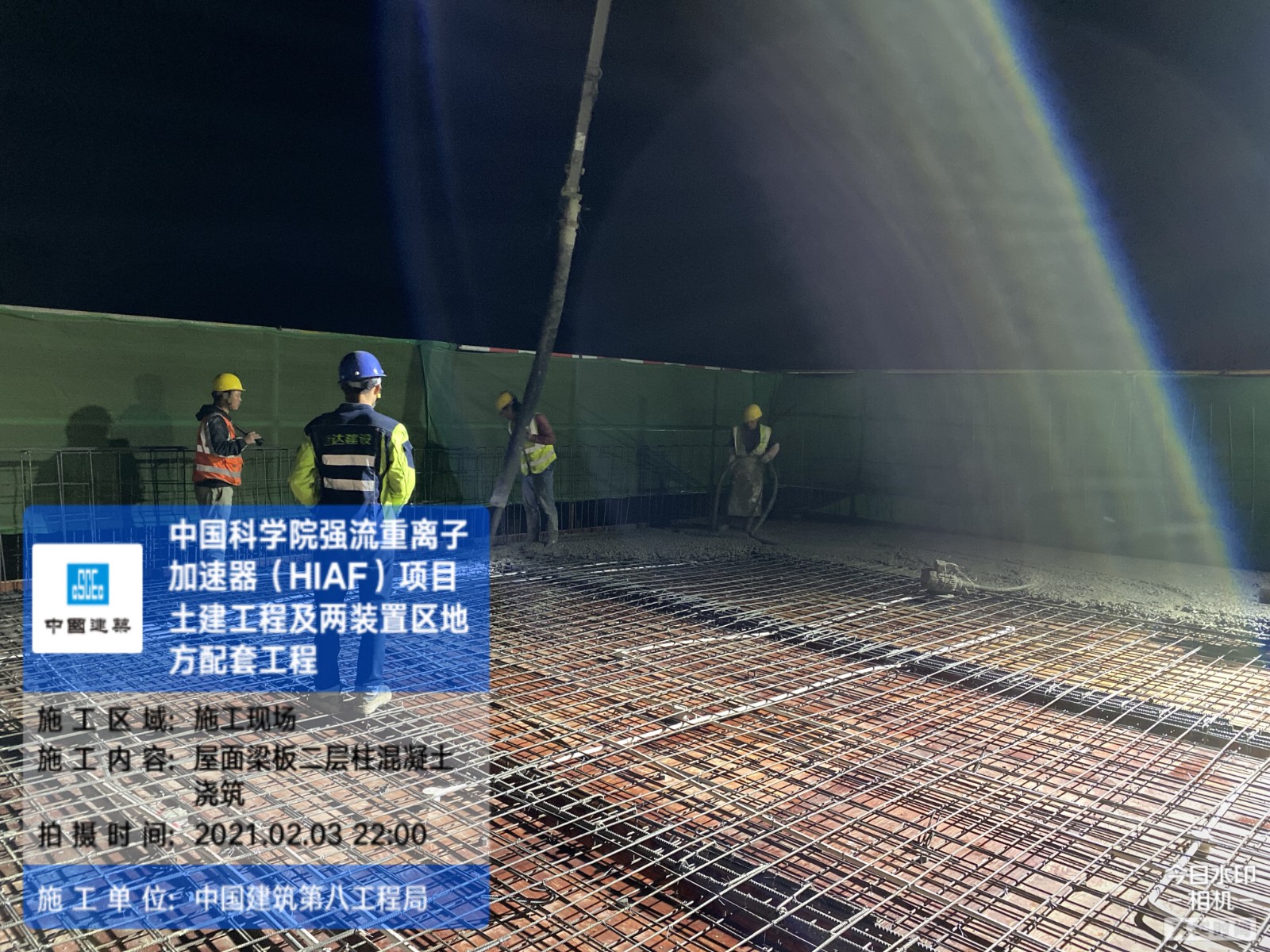 HIAF运行楼完成了线管、板面钢筋及屋面层板面底盒预埋,5-12轴交A-C轴已完成二层柱防雷焊接、屋面层梁板模板加固、屋面梁钢筋,7-9轴交A-E轴已完成混凝土浇筑,4-12轴交A-C轴已完成屋面层梁板模板加固、屋面层梁板模板安装加固、屋面梁钢筋,4-7轴交A-E轴已完成混凝土浇筑;并于2021年2月3日顺利完成结构封顶,接着进行了高支模验收、电气弱电材料样板收集及封样确认、全员安全教育、现场材料整理、现场围闭、现场及生活区安全检查、现场安全文明施工清理等工作。春节期间安排了专人值班。