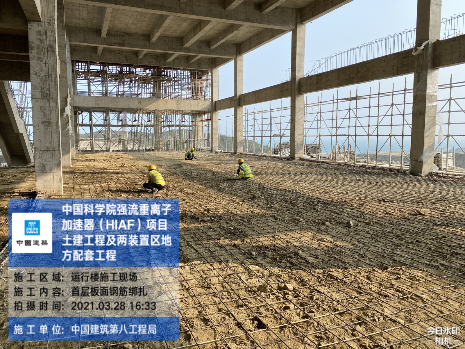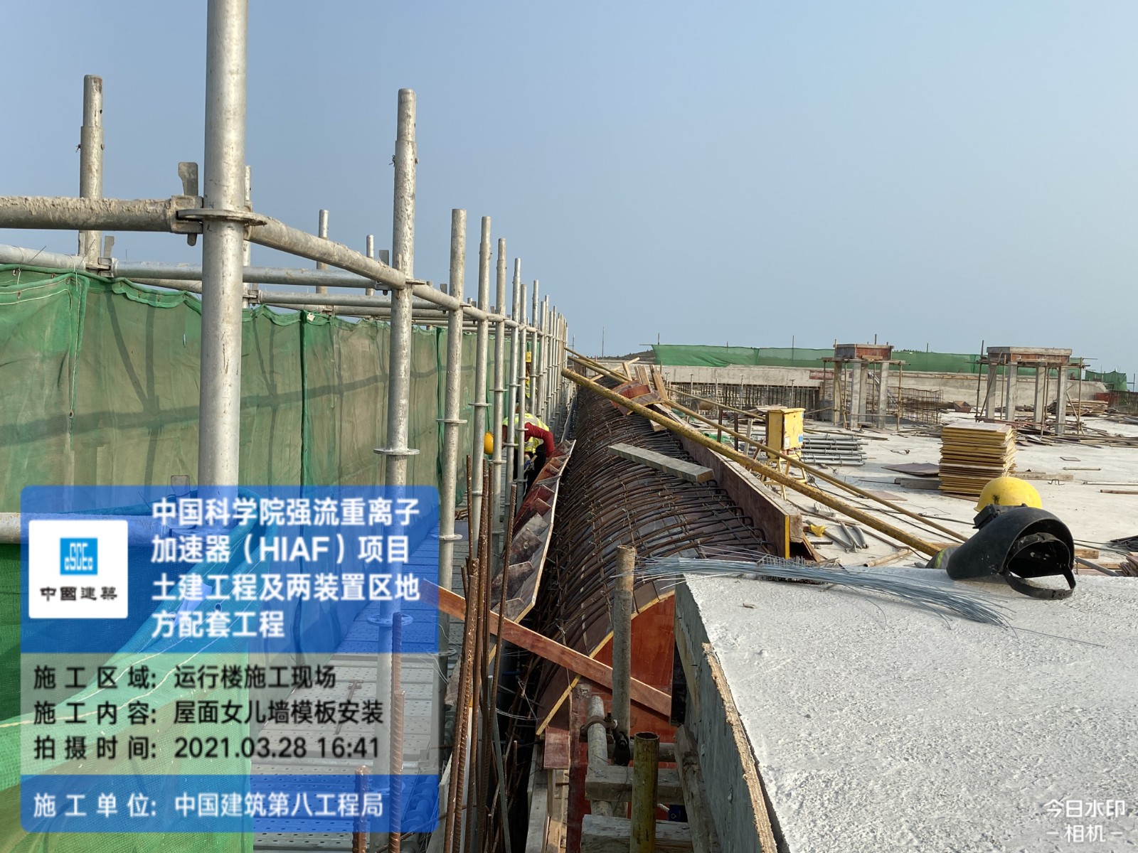 截至2021年3月28日,HIAF运行楼施工二层砌筑完成75%,首层结构板钢筋完成30%,屋面女儿墙模板完成20%。