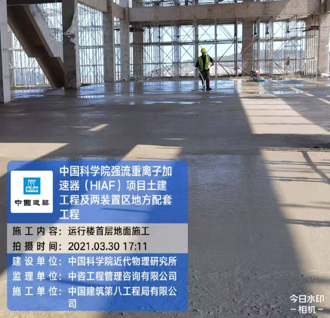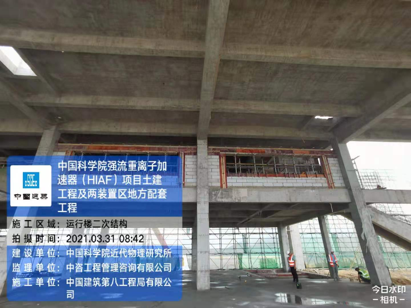 截至2021年4月2日,HIAF运行楼施工首层植筋完成约90,首层结构板浇筑完成85%,屋面女儿墙浇筑完成35%,二层构造柱、层间梁浇筑完成80%。