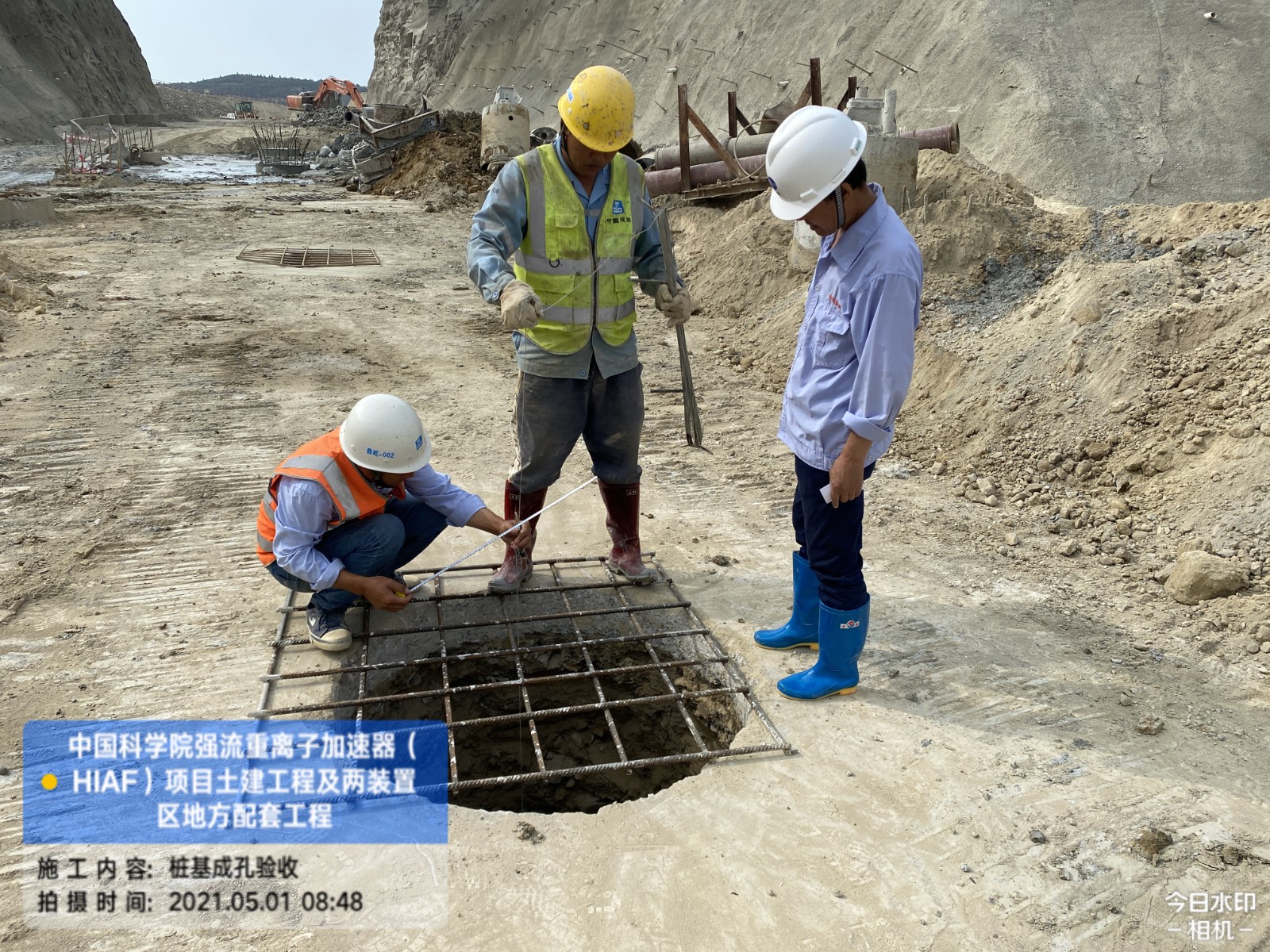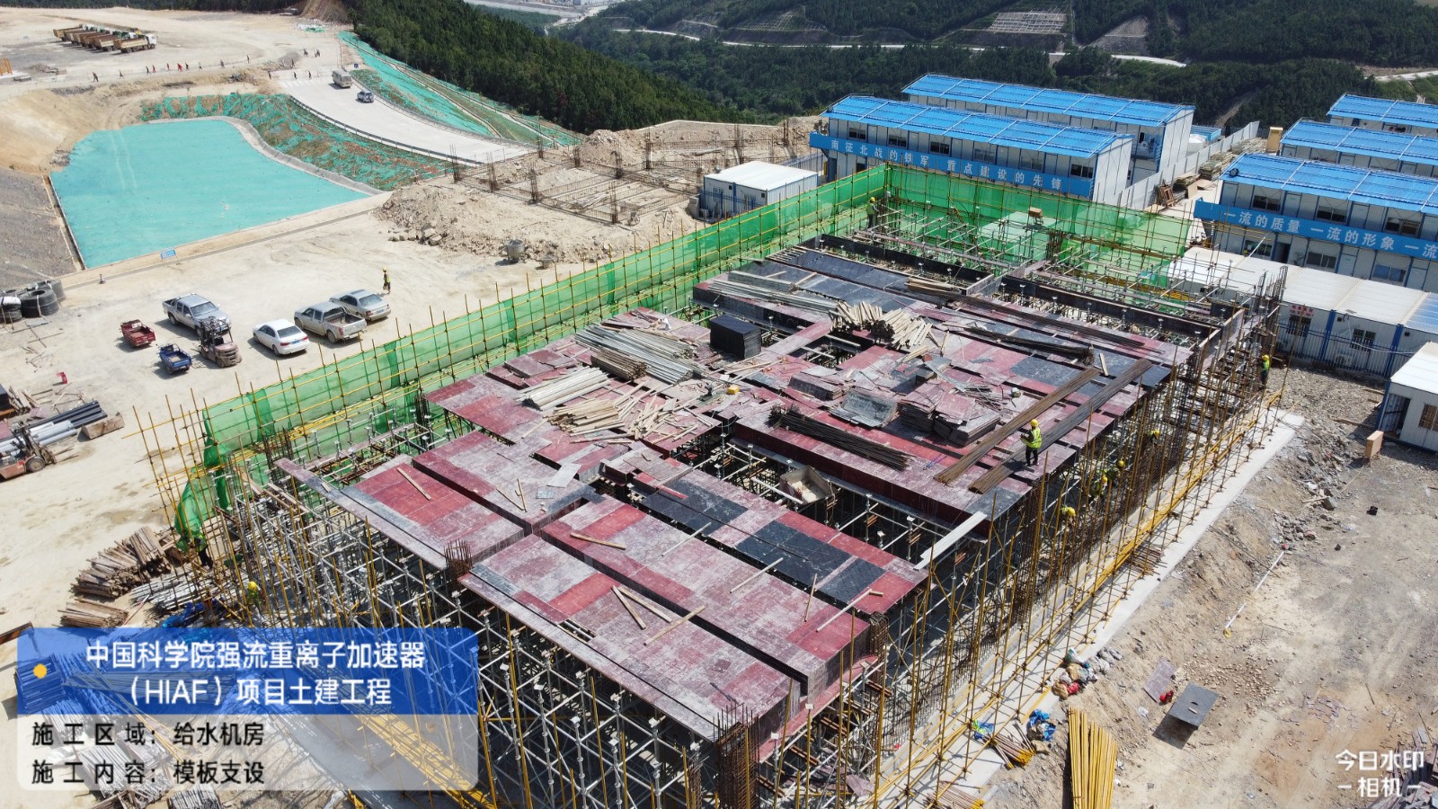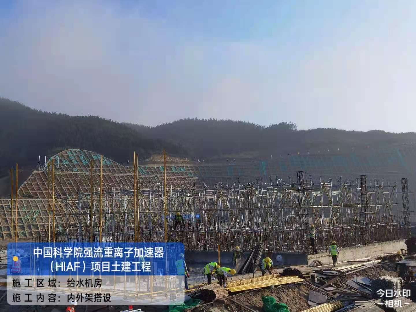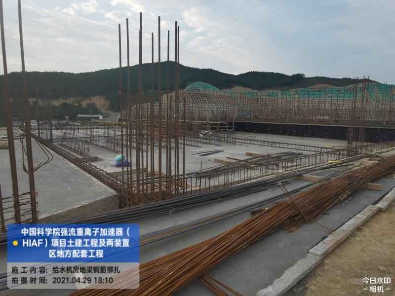 截至2021年5月10日,HIAF主体工程桩施工方面,已完成加速器隧道工程桩施工,三号综合站房工程桩已完成3根,综合测试大厅工程桩已完成2根,科学之门已工程桩完成6根。给水机房施工方面,已完成给水机房内架搭设,外架搭设已完成80%,屋面层梁板模板安装已完成30%。