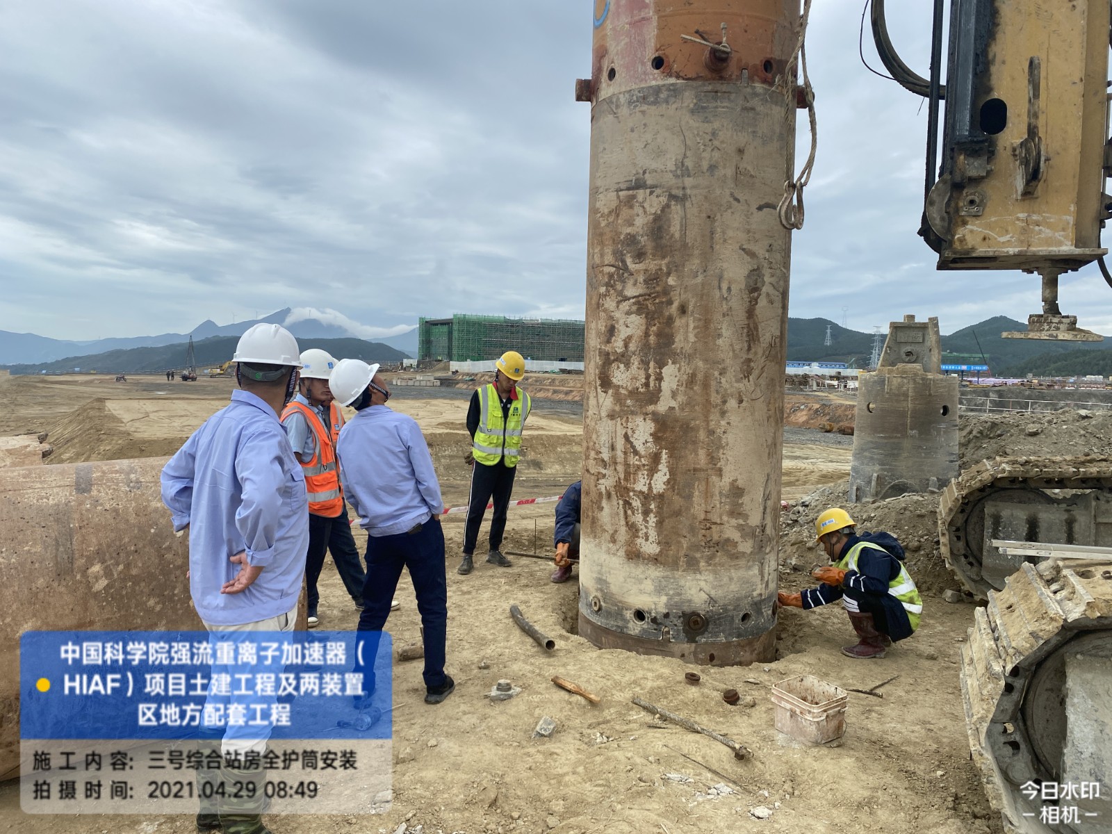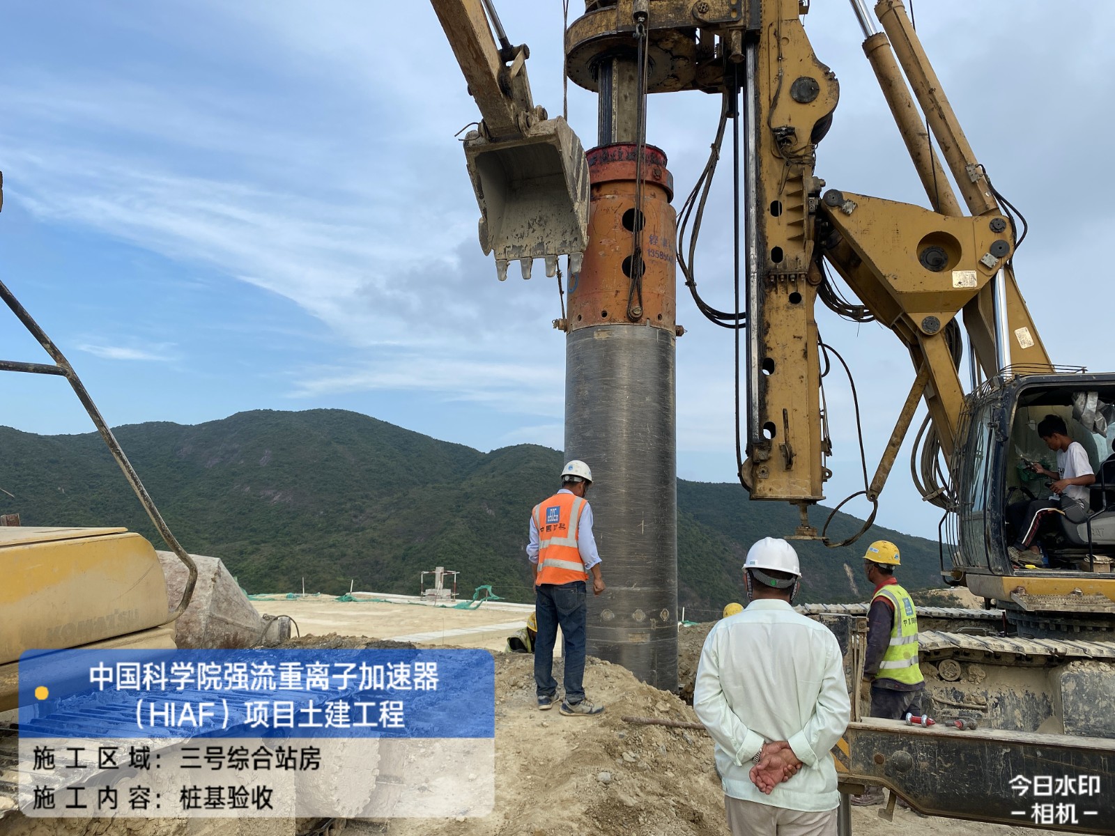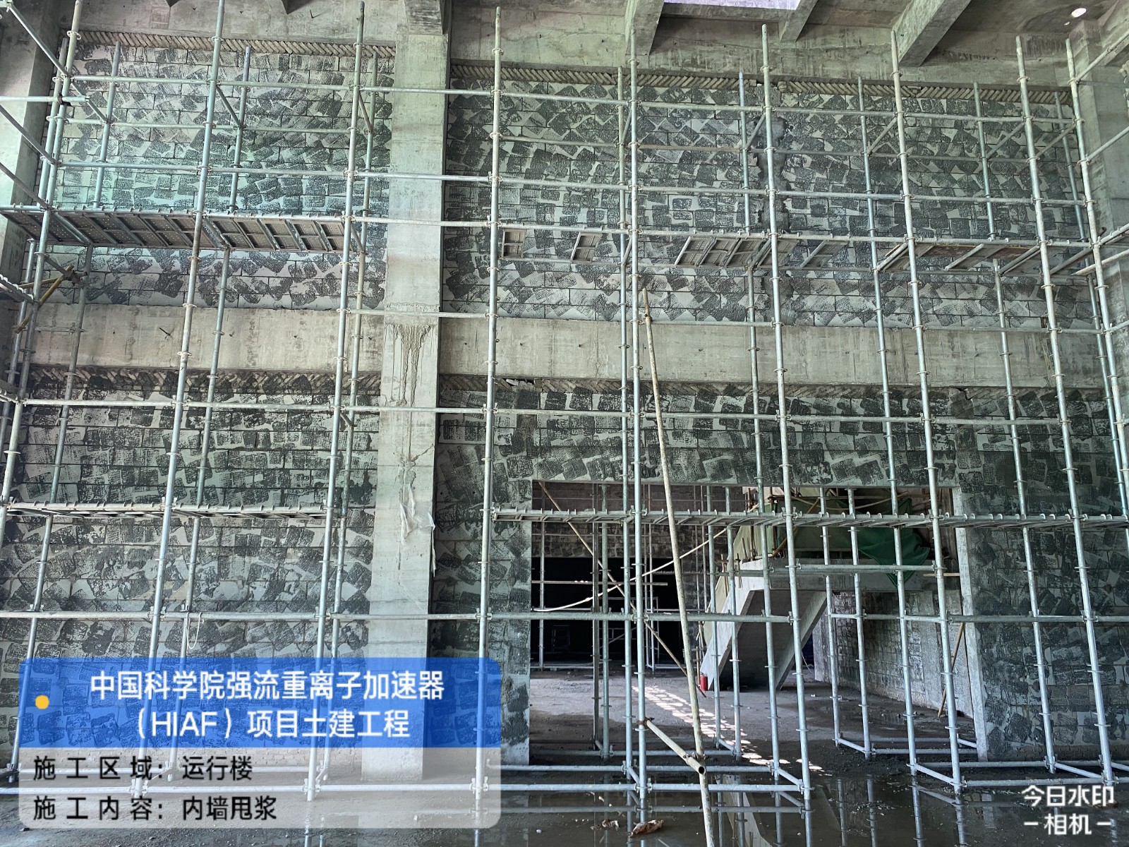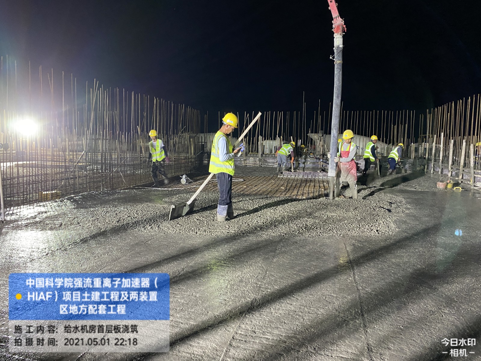 截至2021年5月10日,HIAF主体工程桩施工方面,已完成加速器隧道工程桩施工,三号综合站房工程桩已完成3根,综合测试大厅工程桩已完成2根,科学之门已工程桩完成6根。给水机房施工方面,已完成给水机房内架搭设,外架搭设已完成80%,屋面层梁板模板安装已完成30%。