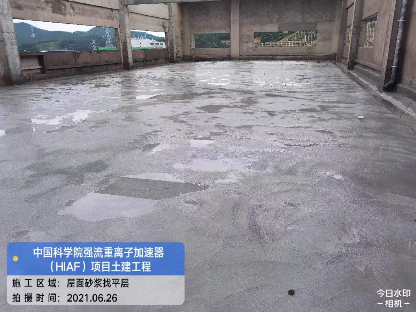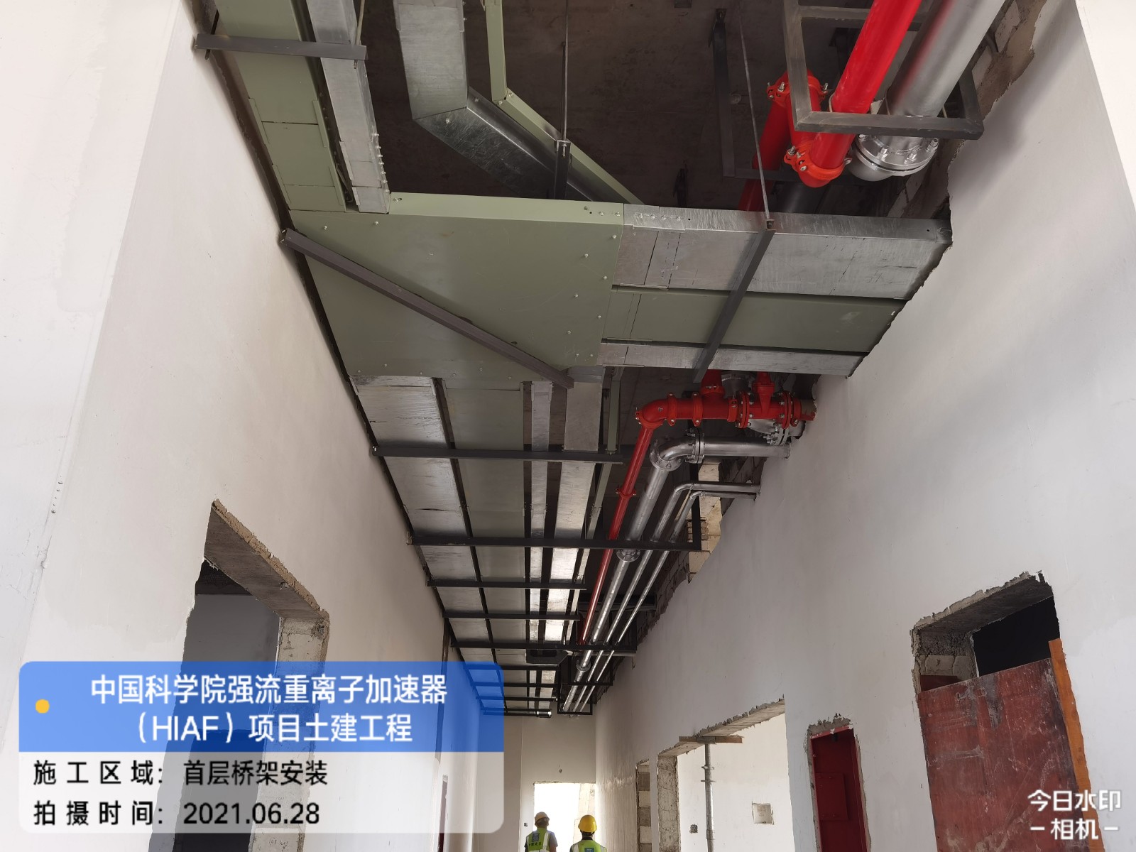 截至2021年6月28日,运行楼1层气体灭火管道安装完成约95%;1-2层卫生间管道完成约80%;屋面层消火栓管道安装完成约90%;运行1-2层明配管完成约90%,屋面砂浆找平层完成约70%,防水材料进场。