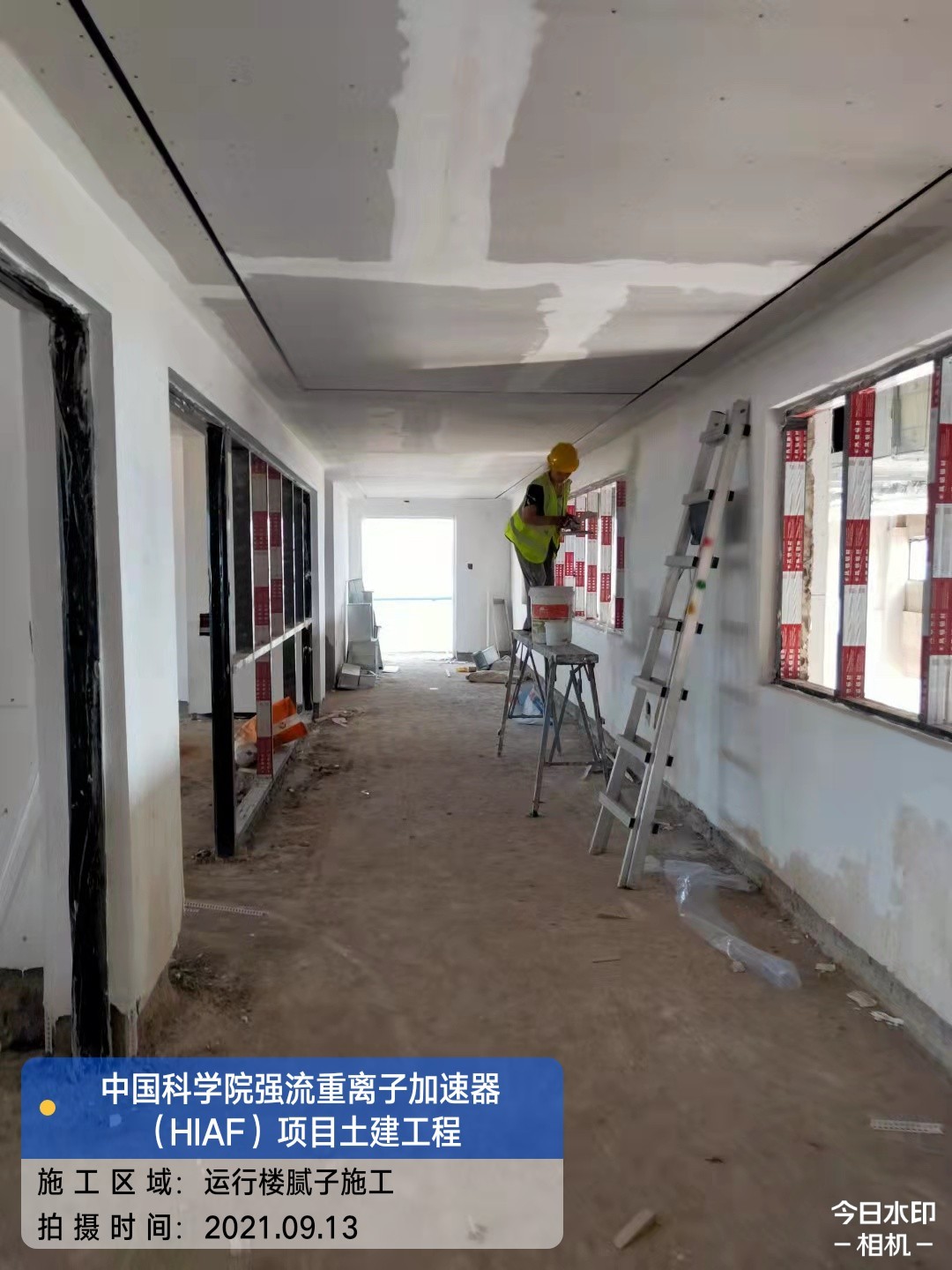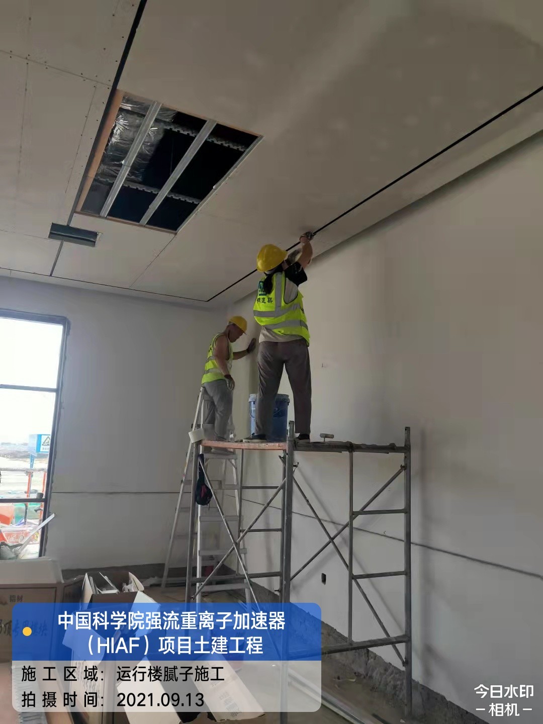截至2021年9月13日,运行楼休息厅灯线敷设完成,中控室风管安装完成约75%,中控室风管保温完成约65%,室内气体灭火管道安装完成约60%,屋面砖完成约80%,室内吊顶完成约70%;给水机房屋面防雷焊接完成,外架拆除完成。