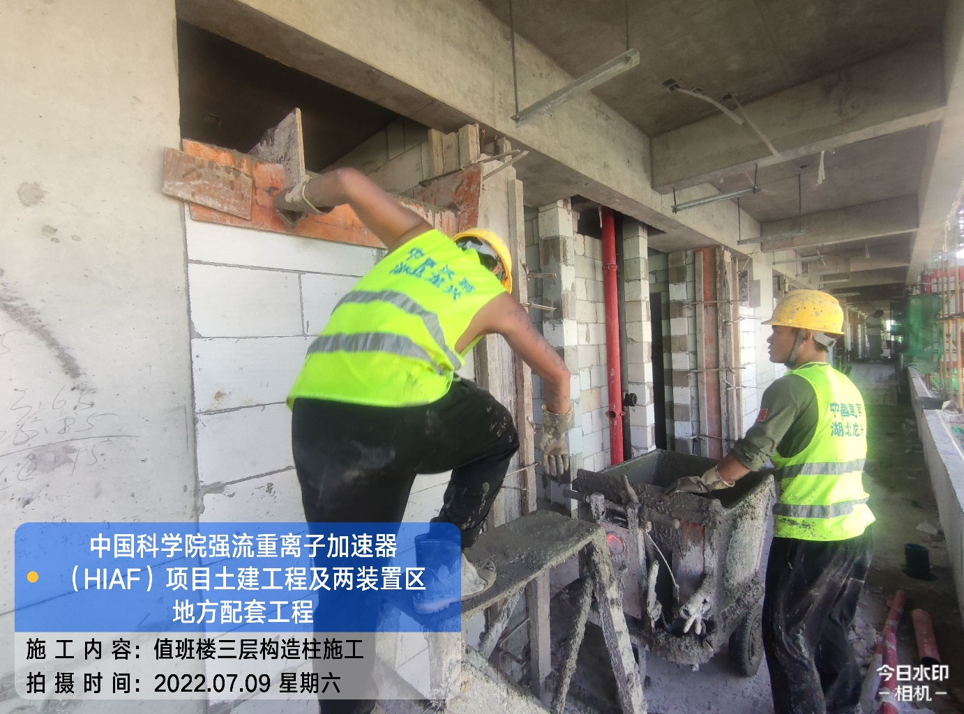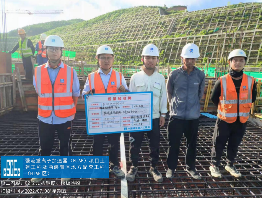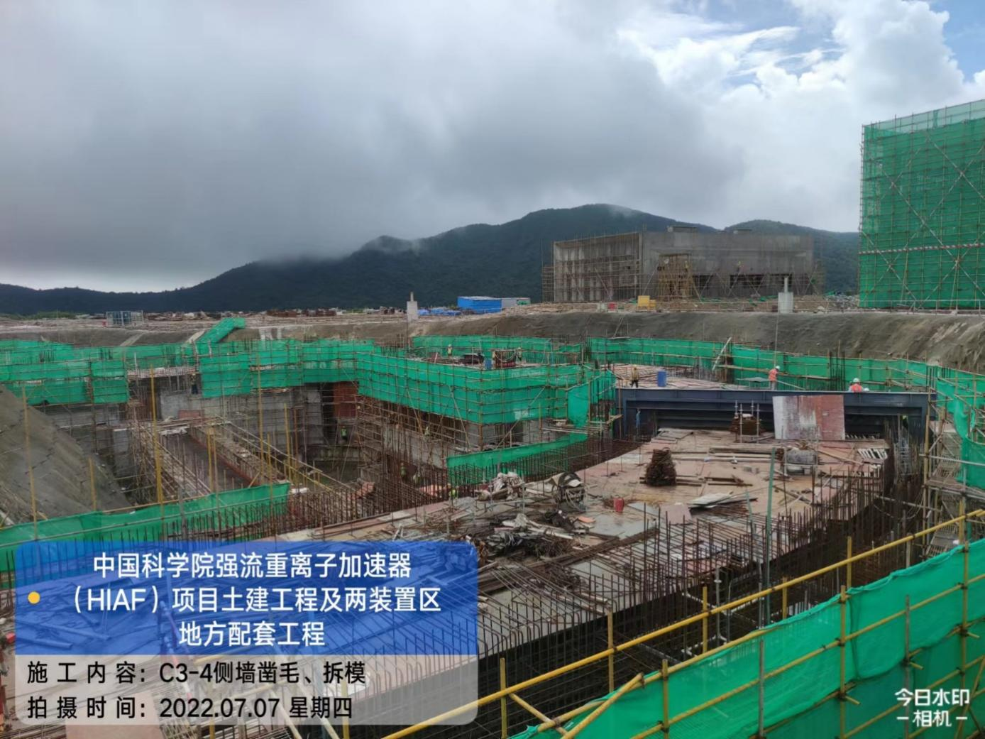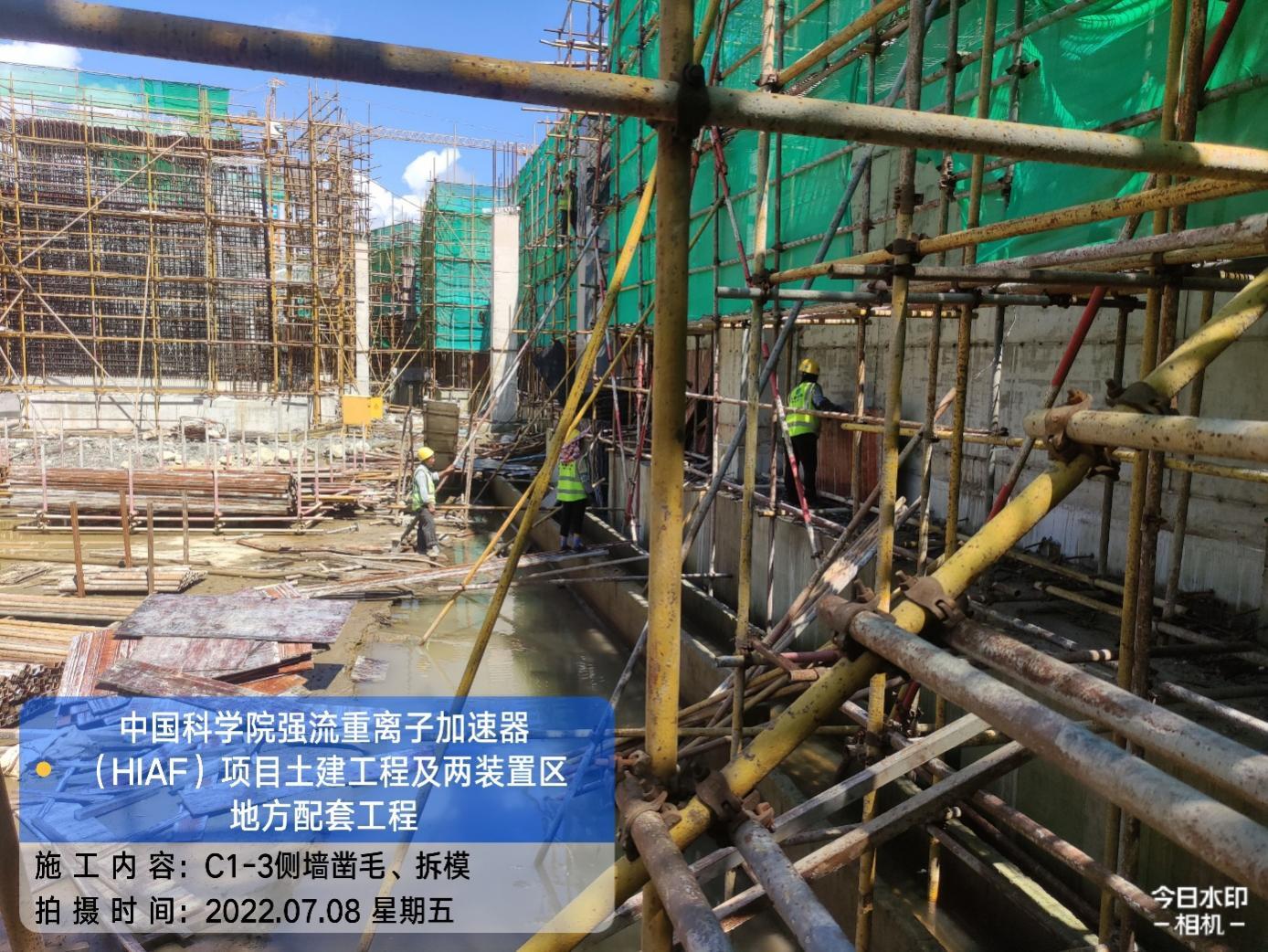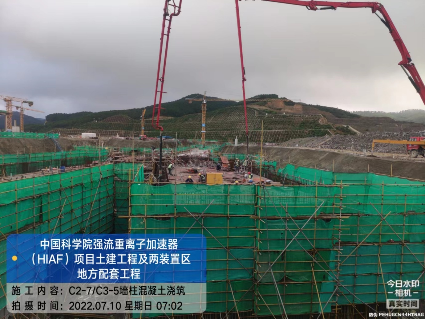 一、加速器隧道:B环B1-8/9/10墙柱模板完成;B1-14剩余50%墙柱模板完成;B1-7墙柱模板完成60%。S环C3-4/C3-5墙柱混凝土浇筑完成。高能综合终端C1-1墙柱模板完成;C1-2/C1-3墙柱混凝土浇筑完成。H隧道C2-1墙柱钢筋绑扎完成;C2-2顶板混凝土浇筑完成。外靶终端C2-7墙柱混凝土浇筑完成。直线隧道A1-8底板混凝土浇筑完成;A1-6/A1-7环氧树脂滑动层完成60%。