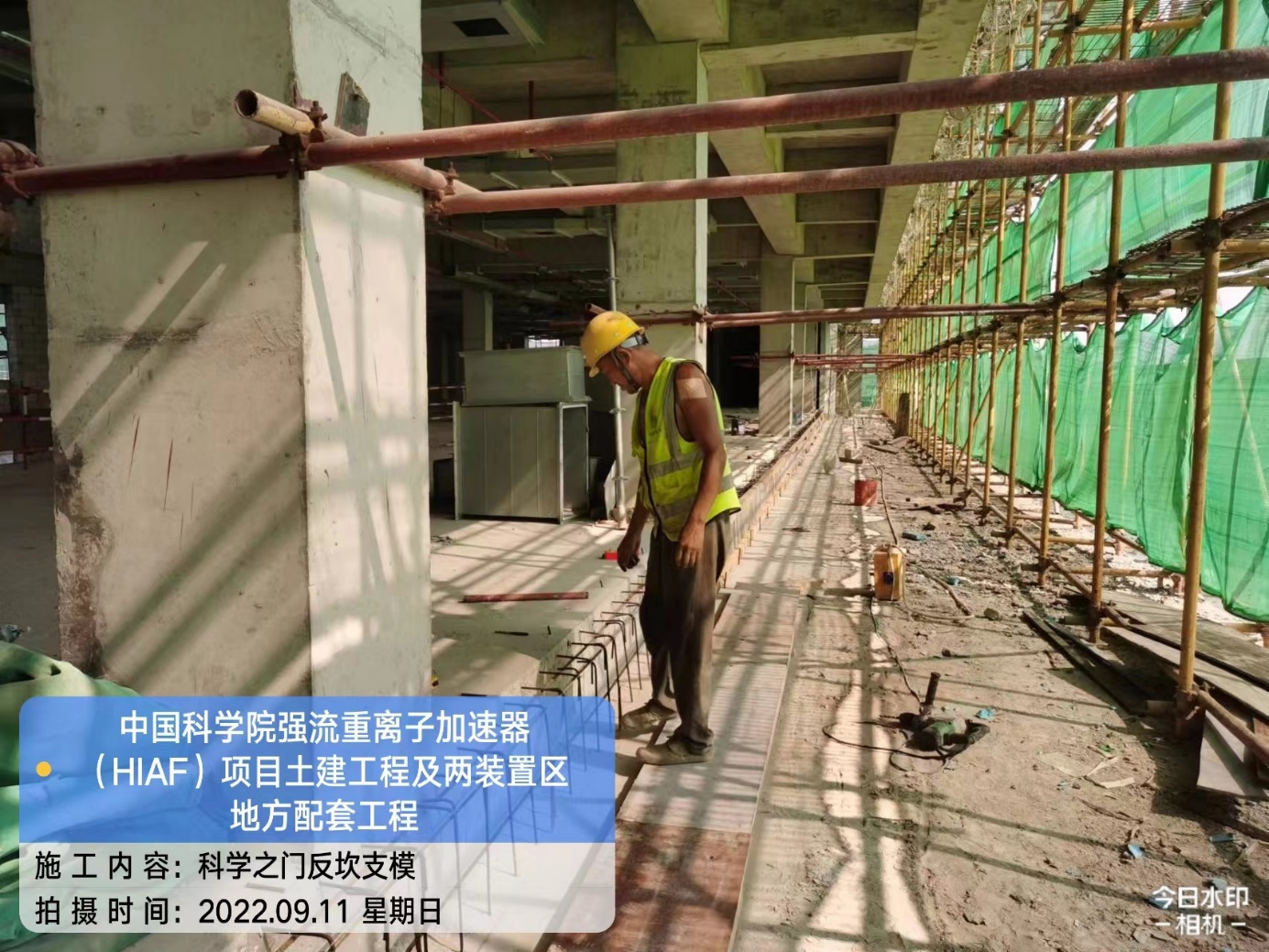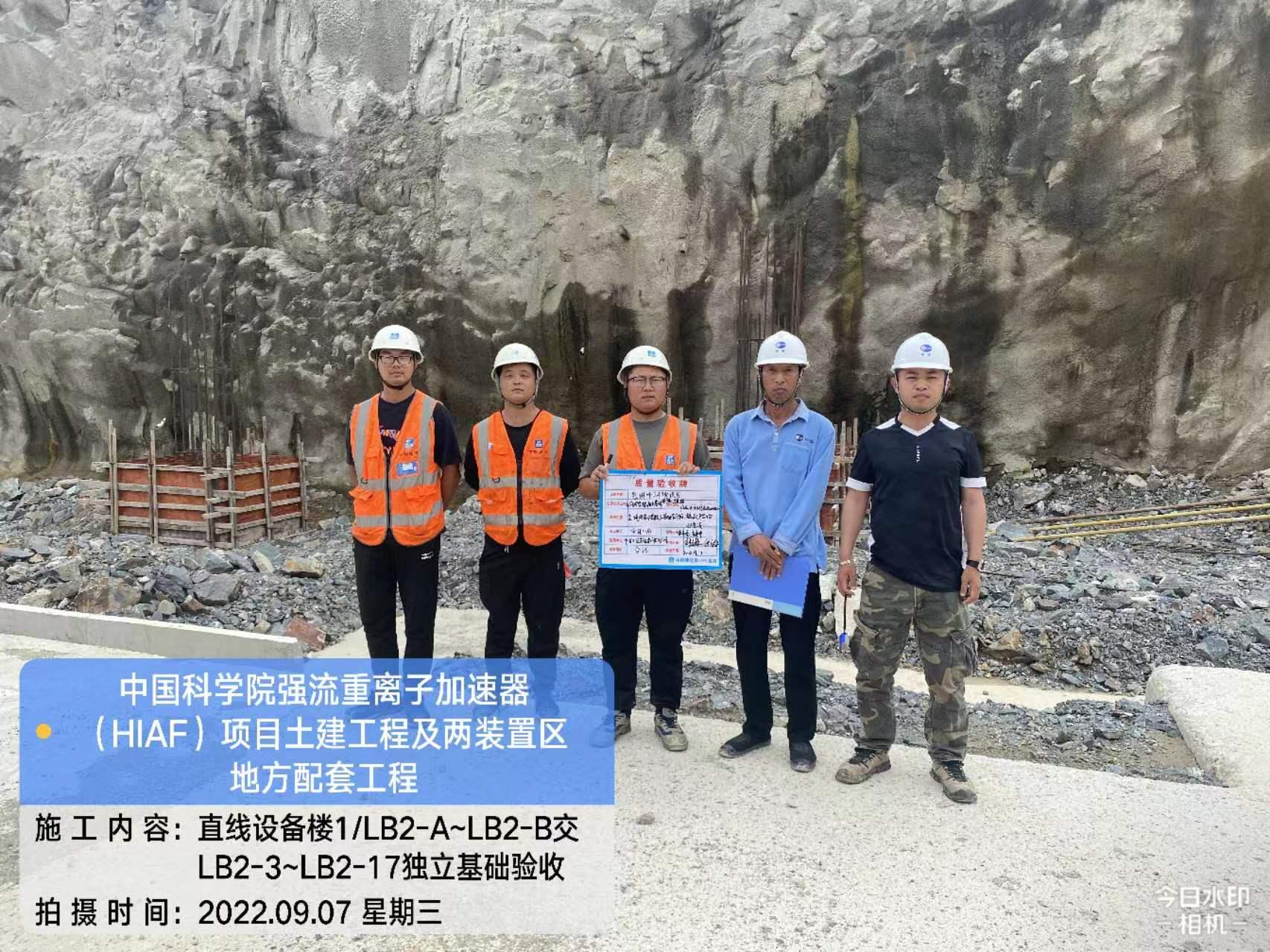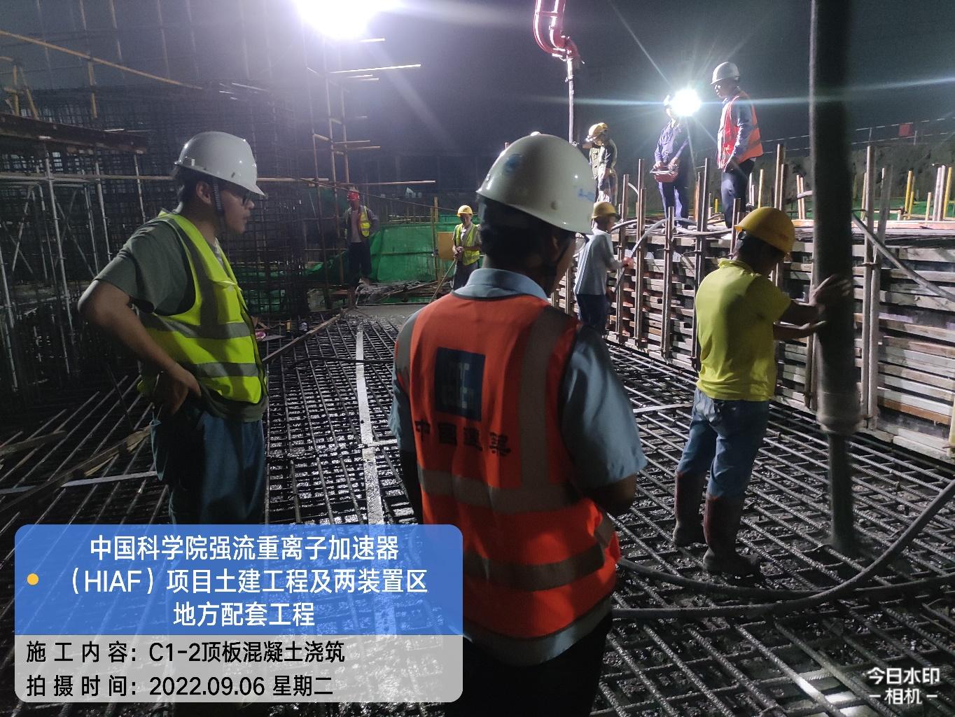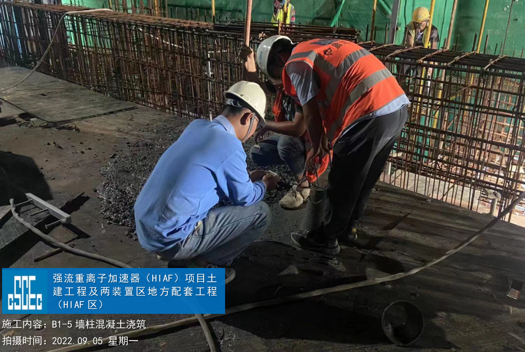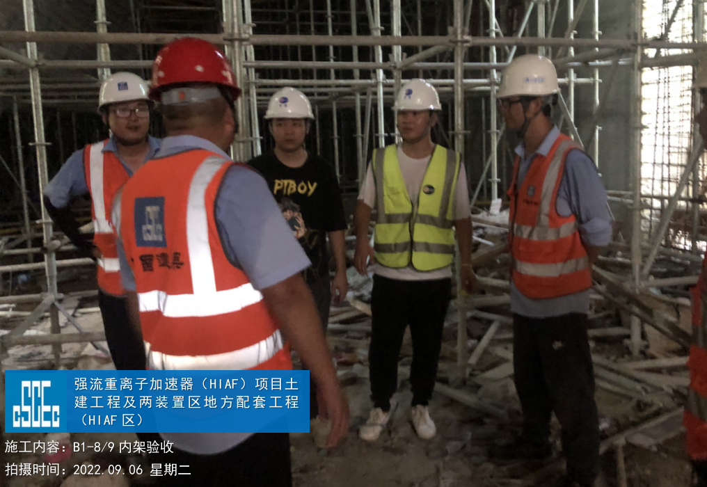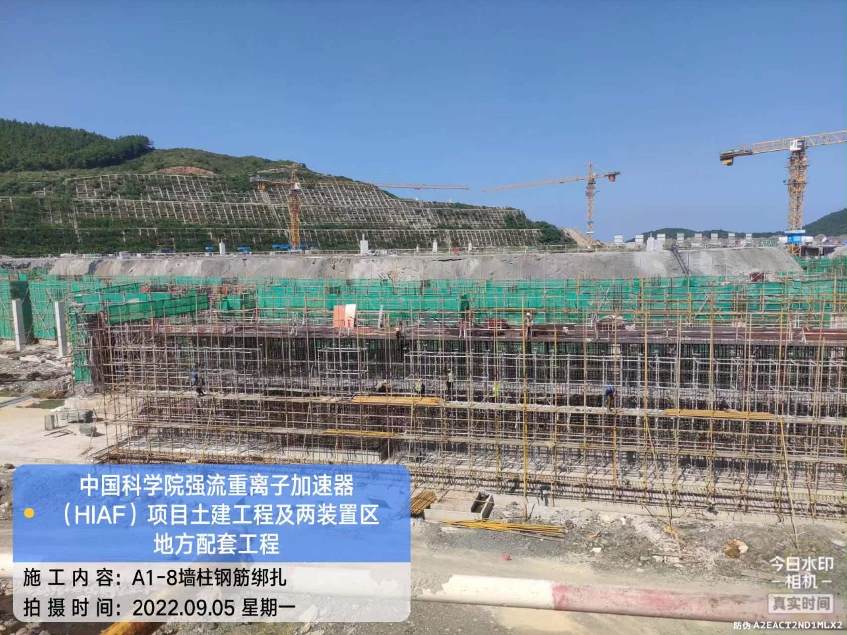 一、加速器隧道:B环B1-1墙柱模板安装完成60%;B1-4/5墙柱混凝土浇筑完成;B1-8/9顶板混凝土浇筑完成;B1-10顶板钢筋绑扎完成。S环C3-5顶板混凝土浇筑完成;C3-4侧墙基层通过验收,为防水工作做准备。H隧道C2-1侧墙模板安装完成50%。直线隧道A1-8墙柱钢筋绑扎完成;A1-7墙柱钢筋绑扎完成40%;A1-6内架搭设完成60%。外靶终端C2-6顶板混凝土浇筑完成。