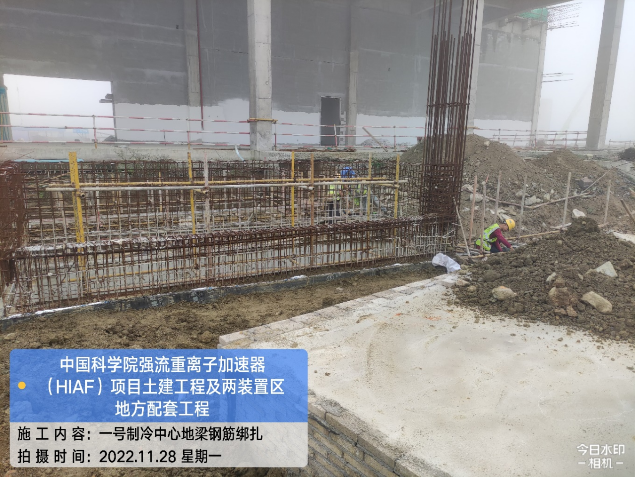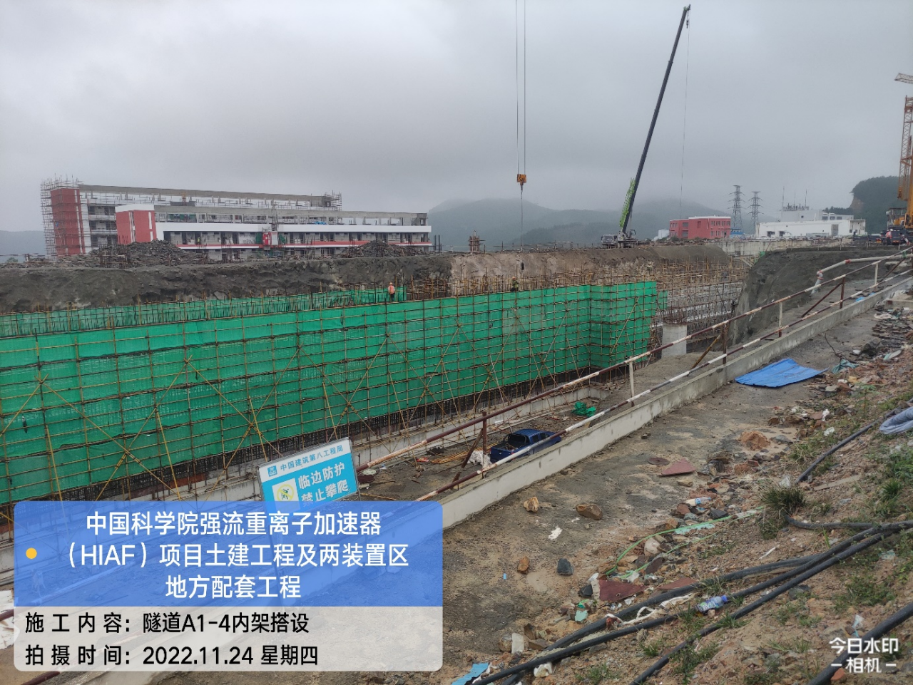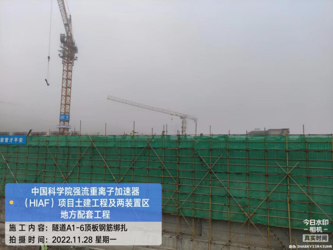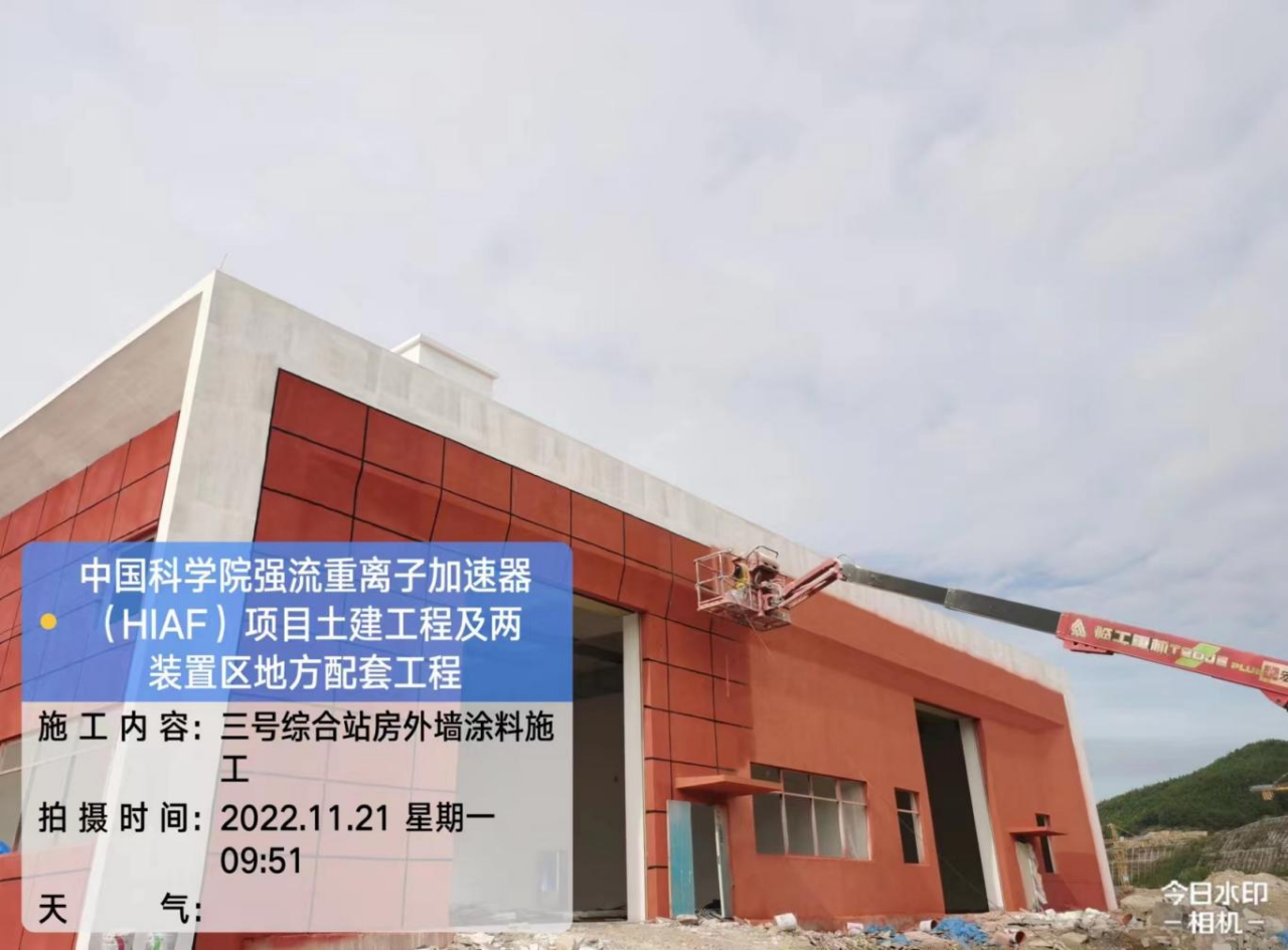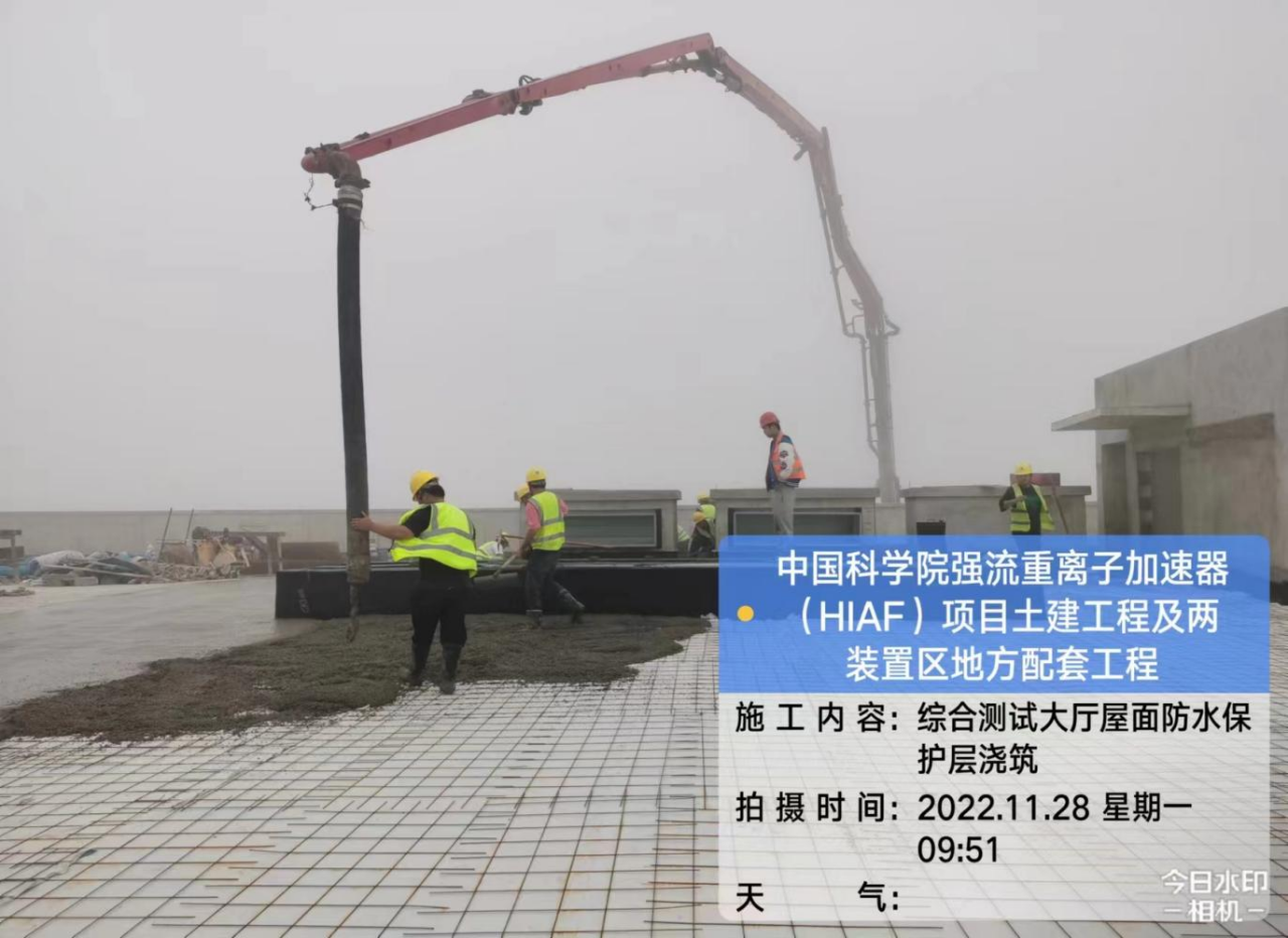 二、HIAF区其它单体:综合测试大厅屋面防水保护层完成20%;卫生间防水及找坡层完成;窗框安装完成60%。室外综合管廊L3-L5垫层浇筑完成。三号综合站房内墙无机涂料完成。一号制冷中心地梁施工准备工作完成。
