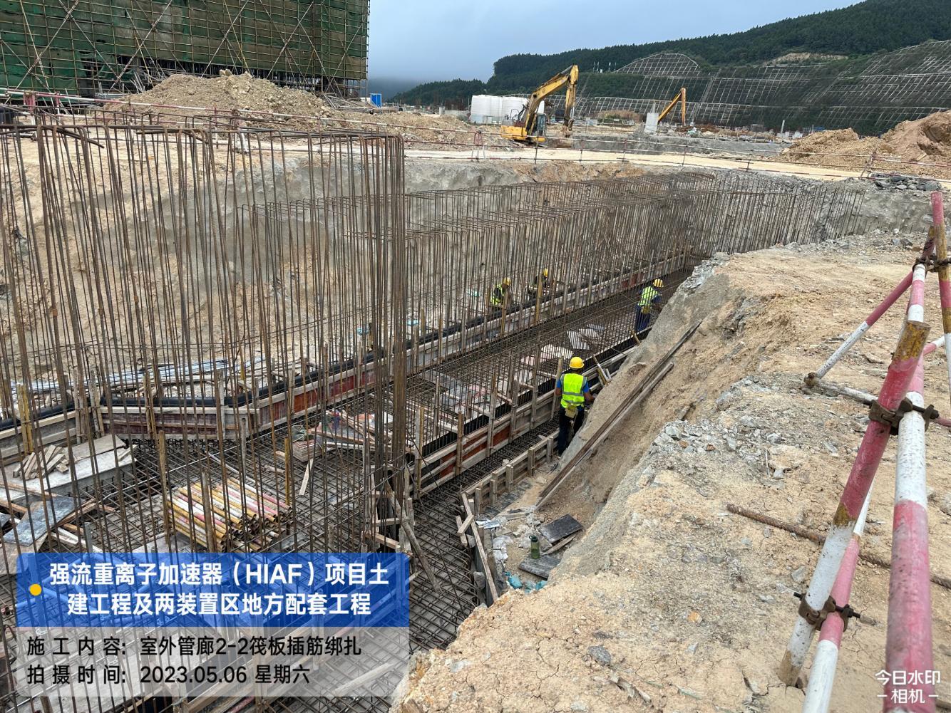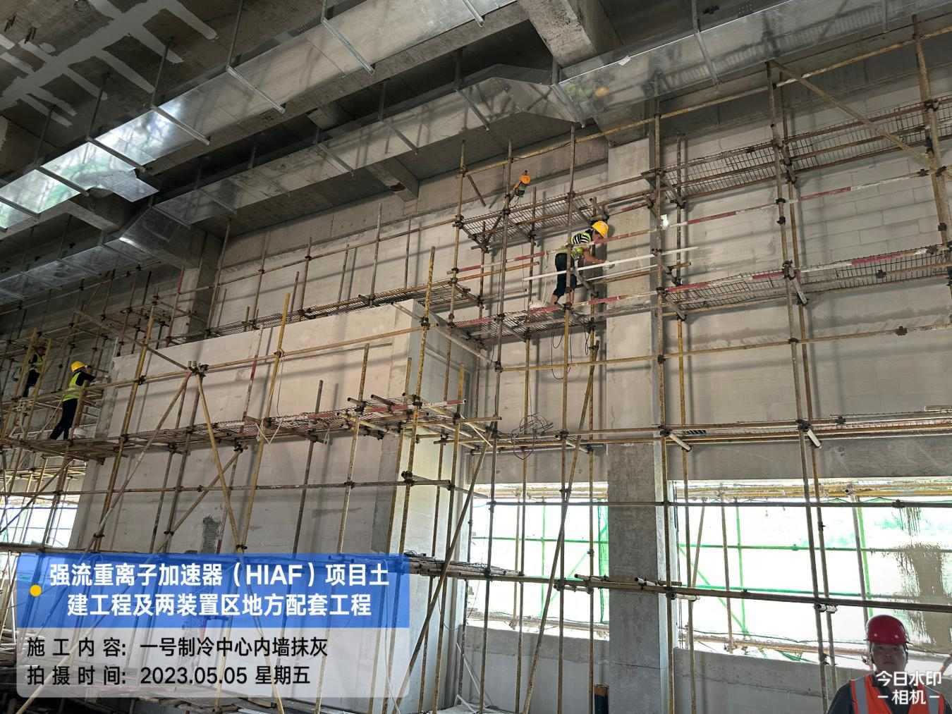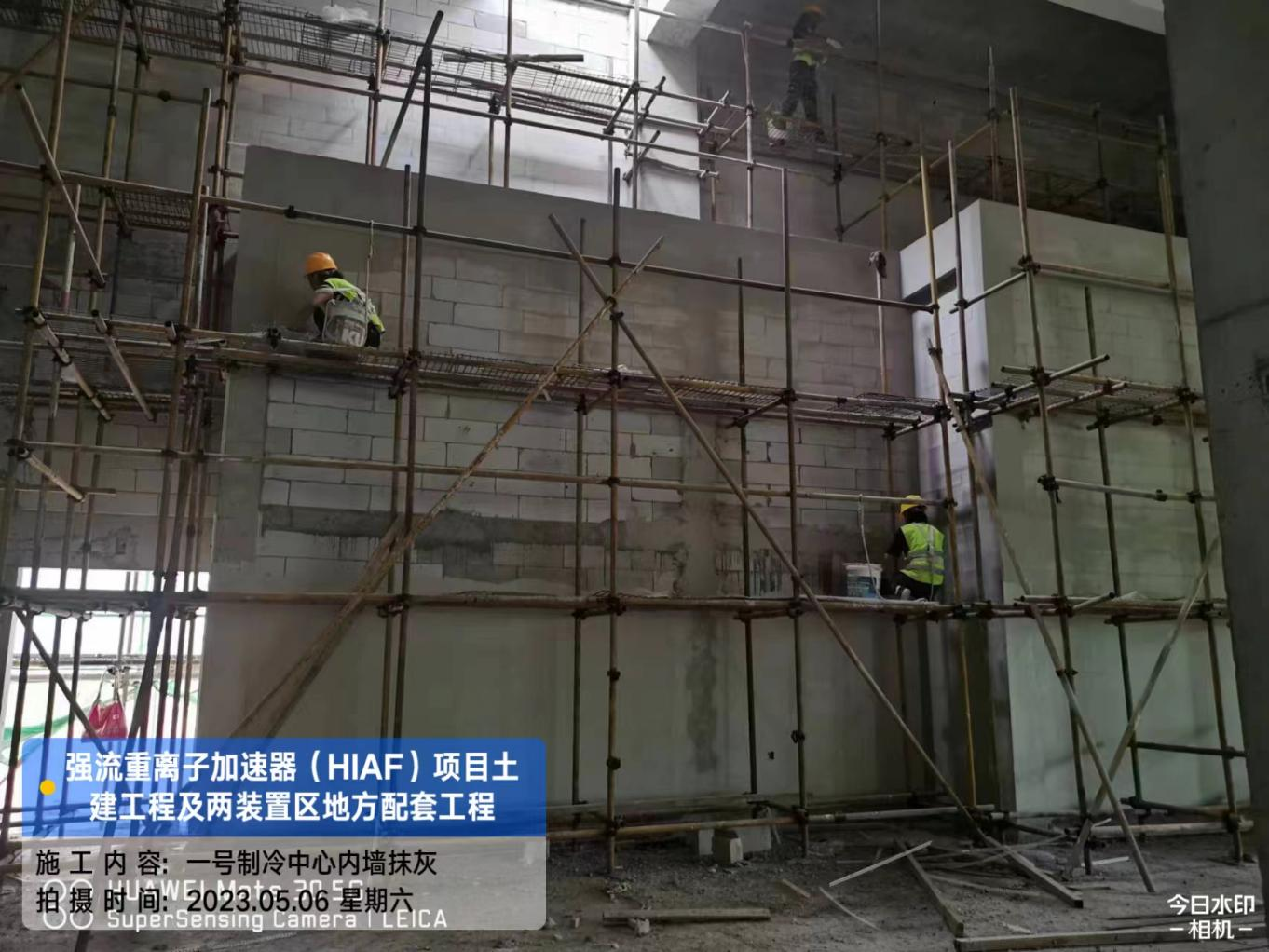 二、HIAF区其它单体:室外综合管廊GL-AD至GL-Y底板钢筋完成。一号制冷中心RC-1/3轴首层砌体完成70%,内墙粗骨料完成30%,屋面防水基层处理完成,剩余屋面女儿墙浇筑完成。综合测试大厅二层天花腻子完成。直线设备楼2#楼设备夹层墙(A1-2段)混凝土浇筑完成。