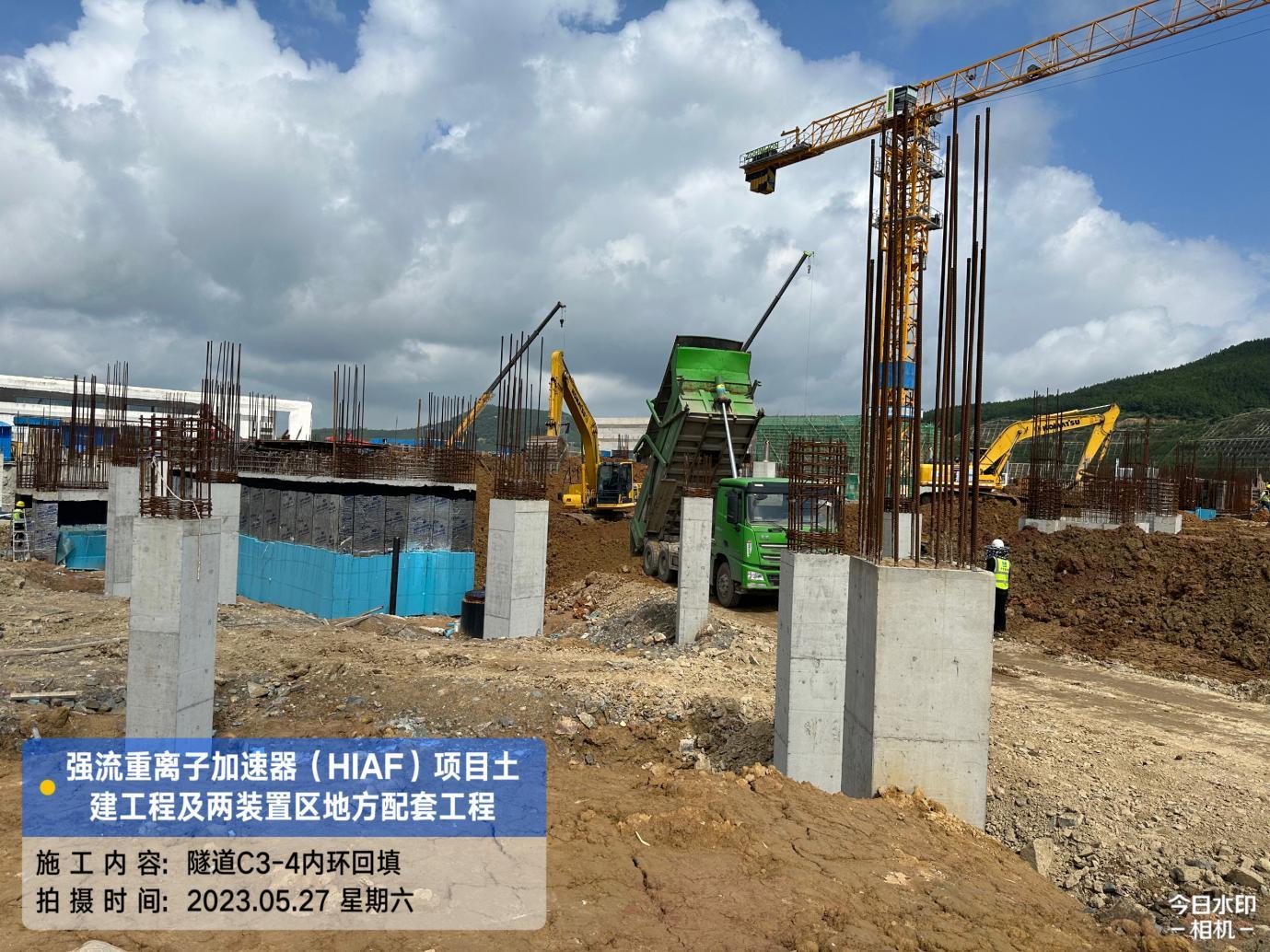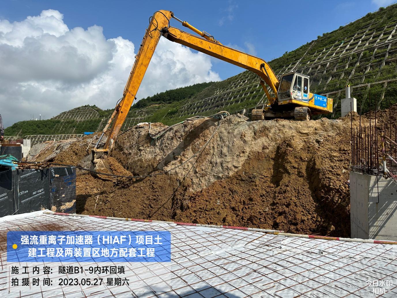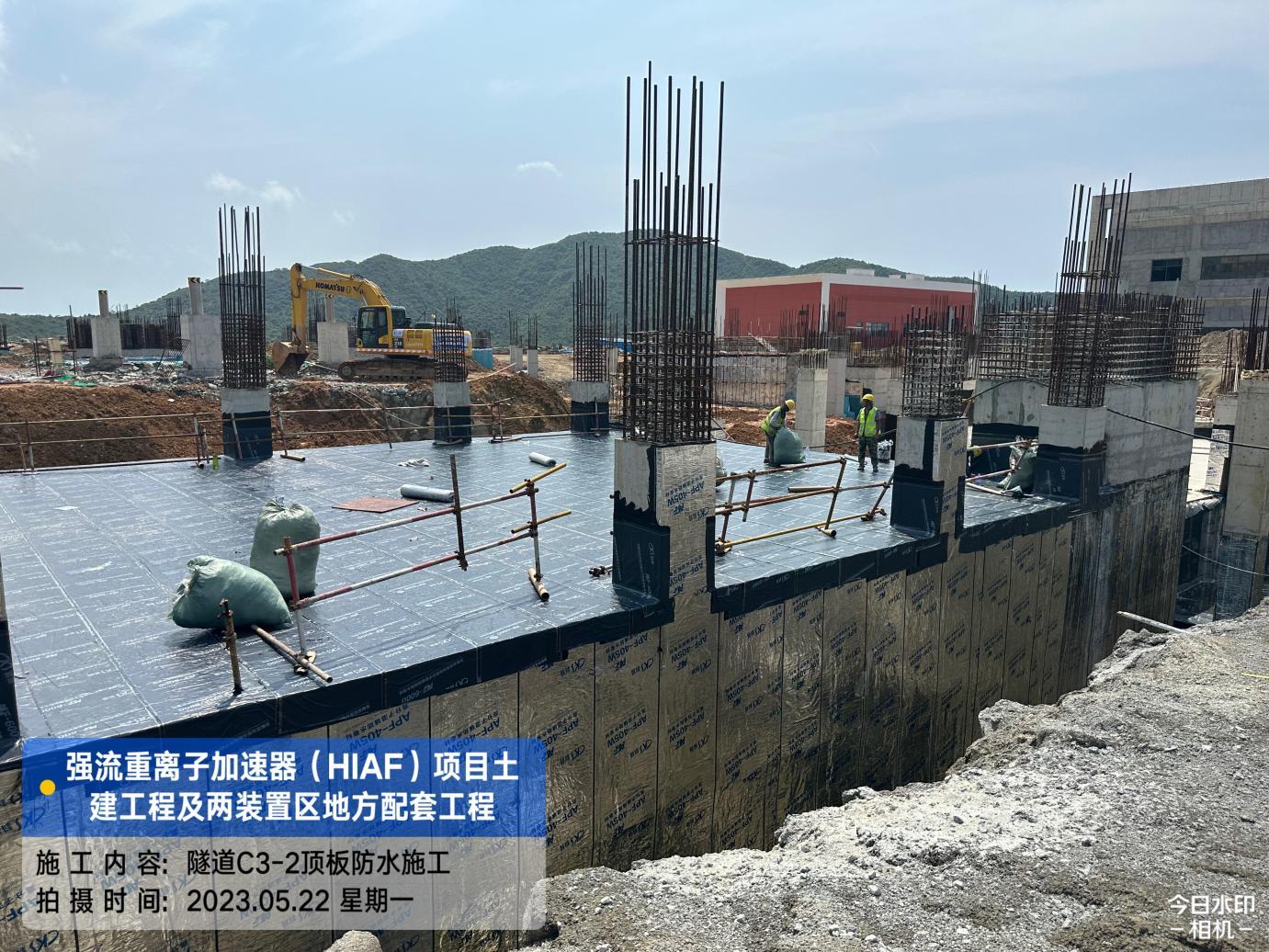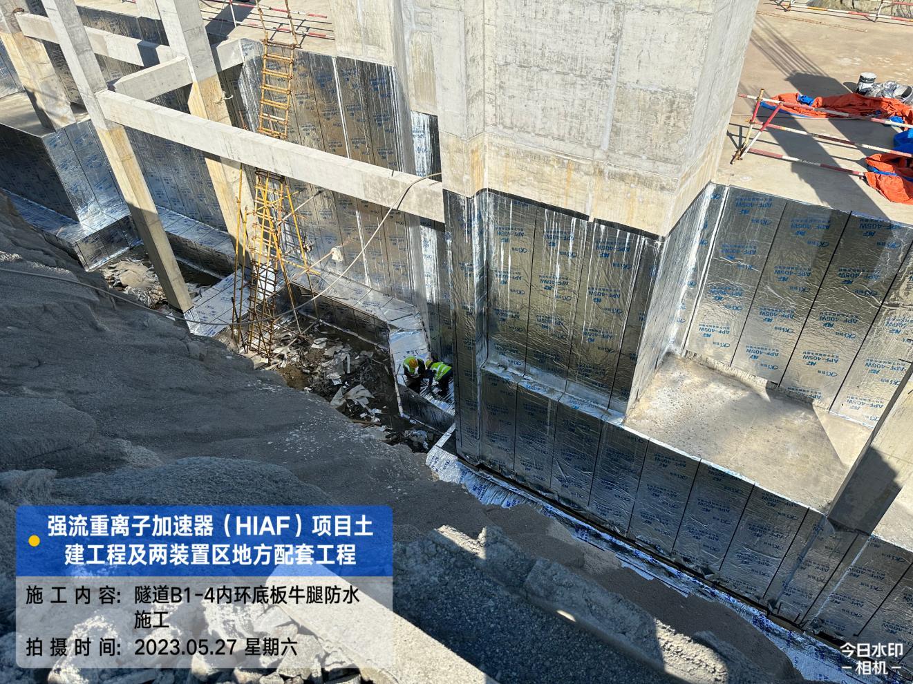一、加速器隧道:B环B1-3/4内环牛腿防水完成60%;B1-11内环牛腿防水完成;B1-9/10外环侧墙排水板和土工布完成60%,回填完成60%。S环C3-2内环侧墙排水板铺贴完成70%,回填完成70%;C3-2预留洞口顶板防水保护层完成。H隧道C2-1顶板排水板土工布完成70%,C2-1内环侧墙贴排水板、土工布完成60%,回填完成60%。直线隧道A1-2/3内环侧墙防水完成50%;A1-8/9内环防水完成;A1-1顶板梁板混凝土浇筑完成。高能综合终端C1-1/2/3侧墙排水板、土工布铺贴完成40%,回填完成40%;C1-1/2/3顶板排水板土工布完成,内墙粗骨料完成。