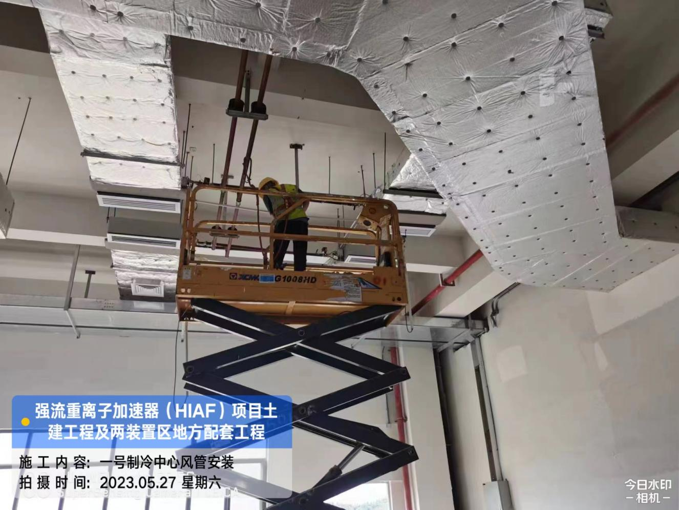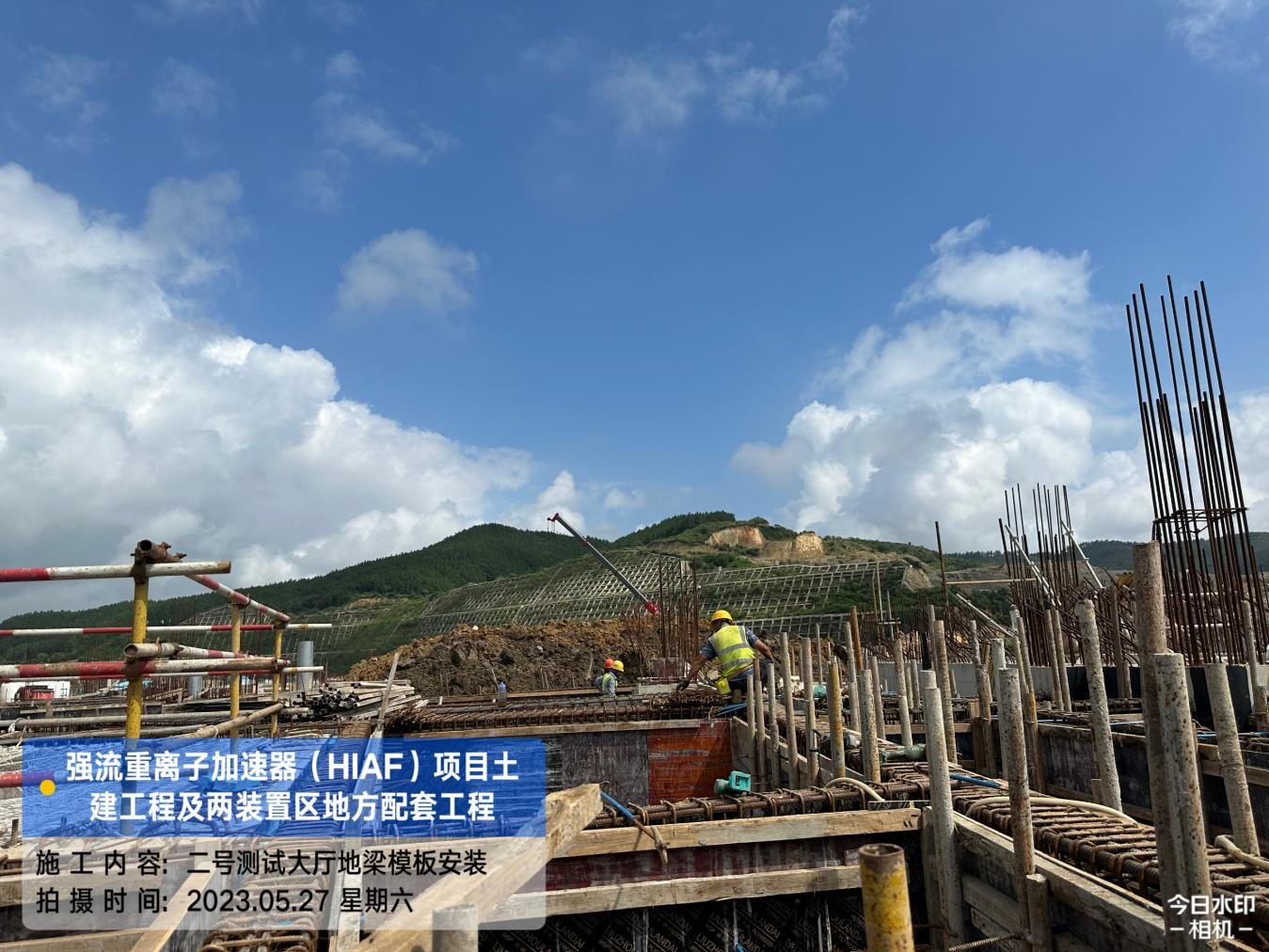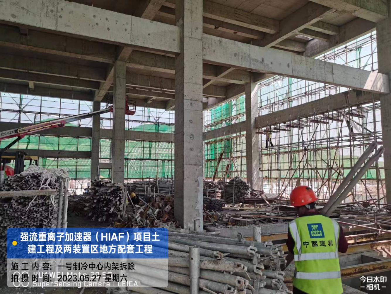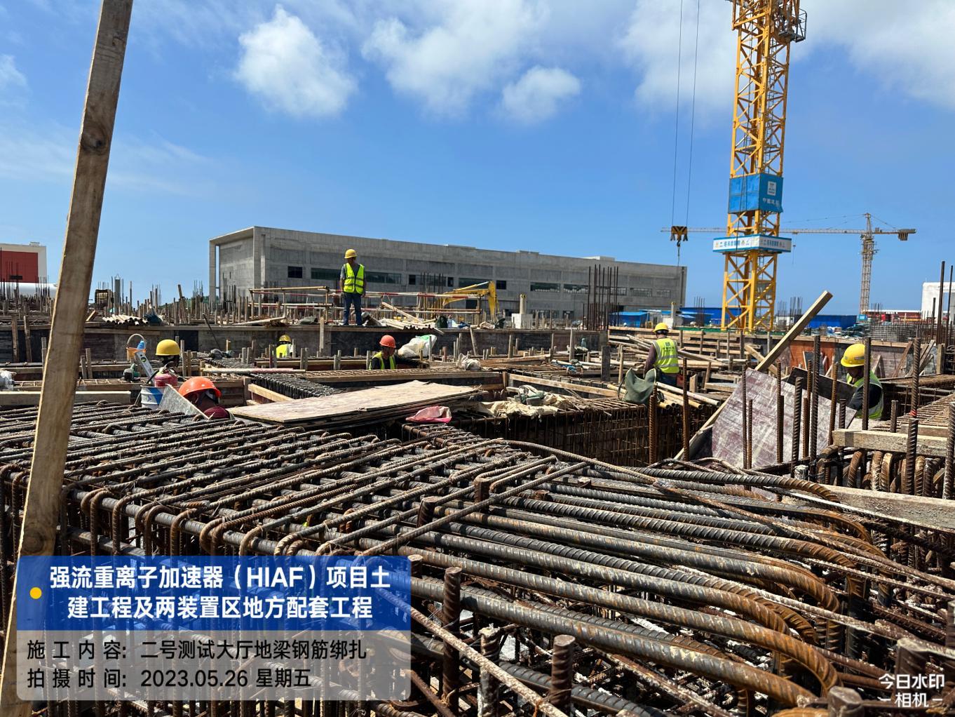 二、HIAF区其它单体:室外综合管廊GL-AD至GL-Y侧墙顶板钢筋模板完成;GLW至GLV交GL8至GL15底板钢筋绑扎完成60%。一号制冷中心RC-F/H轴首层内架拆除清理完成;RC-1/3轴外墙抹灰完成80%,屋面防水完成20%;RC-A/F轴窗框安装完成。综合测试大厅常温测磁间钢骨架安装完成。直线设备楼2#楼设备夹层墙(A1-4段)混凝土浇筑完成。二号测试大厅CB1-1段地梁钢筋绑扎完成,模板完成60%。