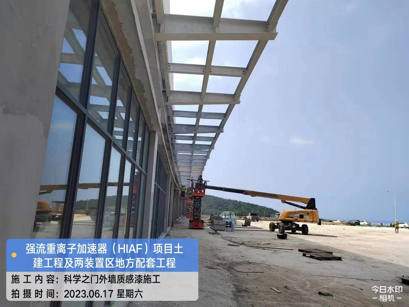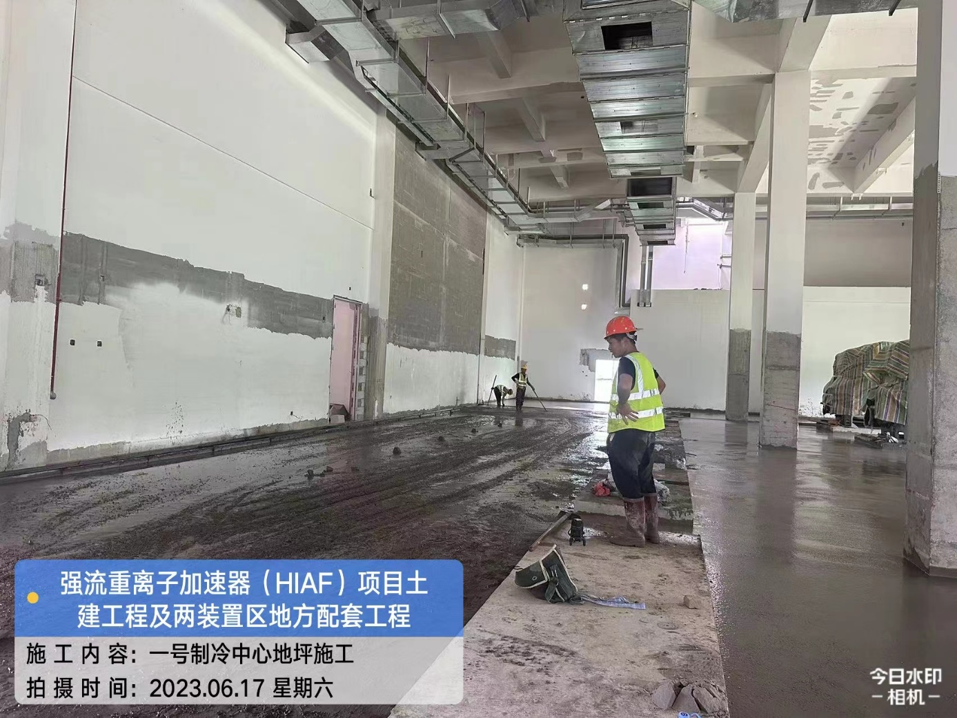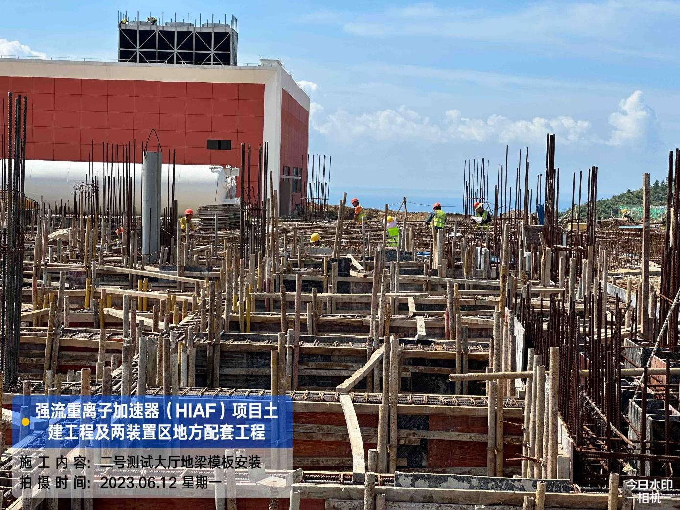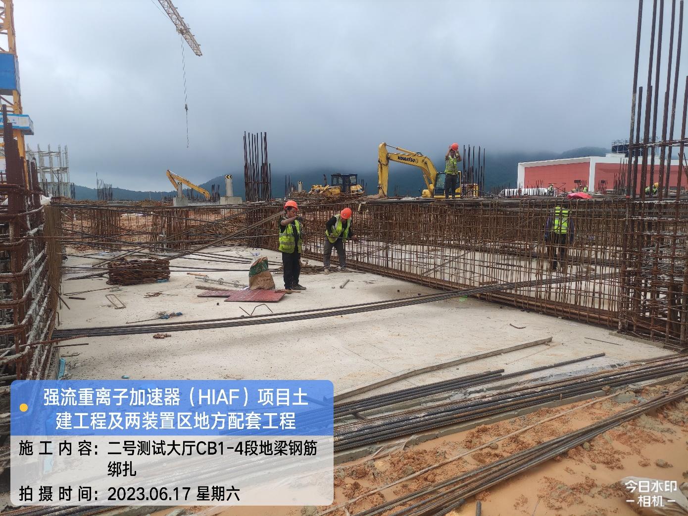 二、HIAF区其它单体:室外综合管廊L2-2段侧墙模板安装完成65%;L2-1段侧墙防水完成。一号制冷中心RC-F/H砌体及圈梁构造柱完成80%,顶棚腻子中涂完成70%;RC-A/D混凝土地面施工完成。综合测试大厅首层大厅环氧中涂完成90%,常温测磁间洁净板安装完成60%,二层房间玻璃窗扇安装完成40%。二号测试大厅CB1-1段首层板浇筑完成;CB1-2段地梁混凝土浇筑完成;CB1-3段地梁钢筋绑扎完成65%。