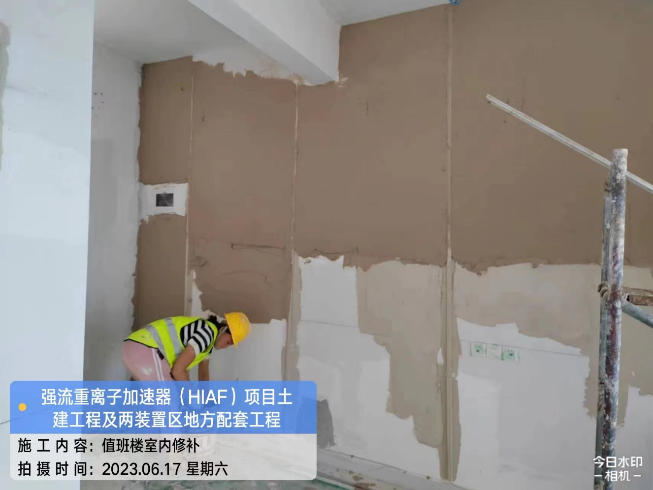三、后勤区:科学之门钢结构雨棚玻璃安装完成20%,台阶挡土墙完成30%。值班楼走廊女儿墙外墙涂料完成70%,首层内墙维修完成50%。
