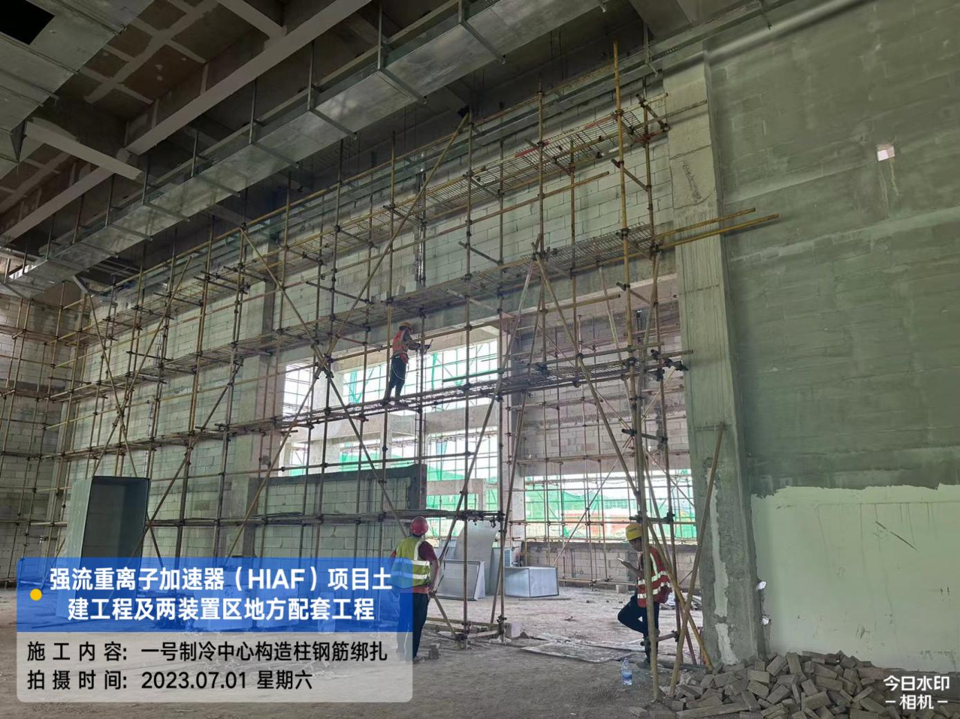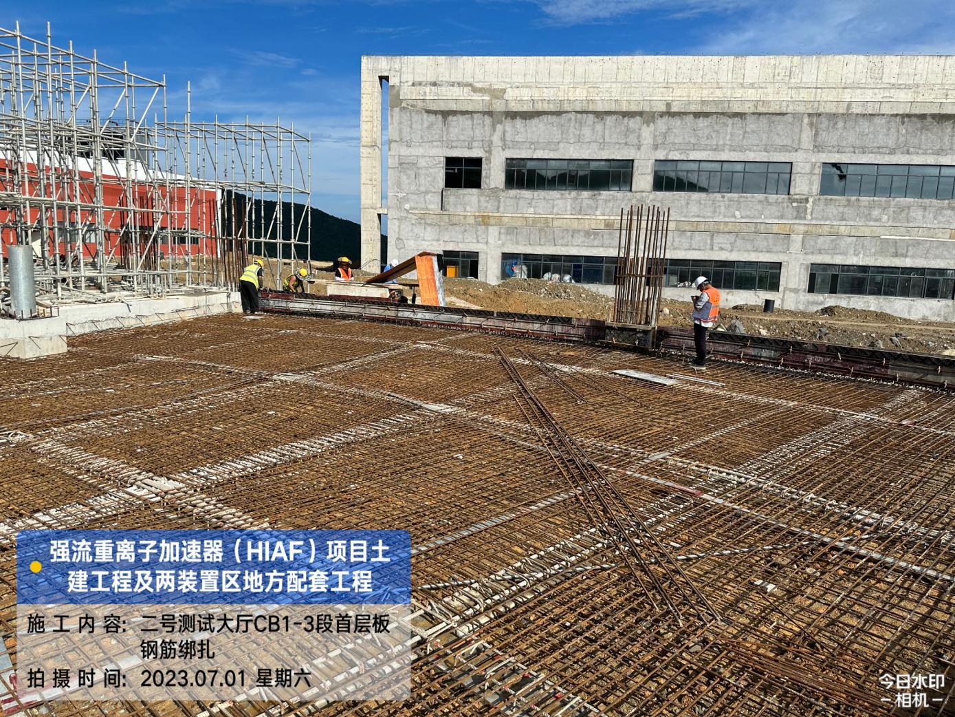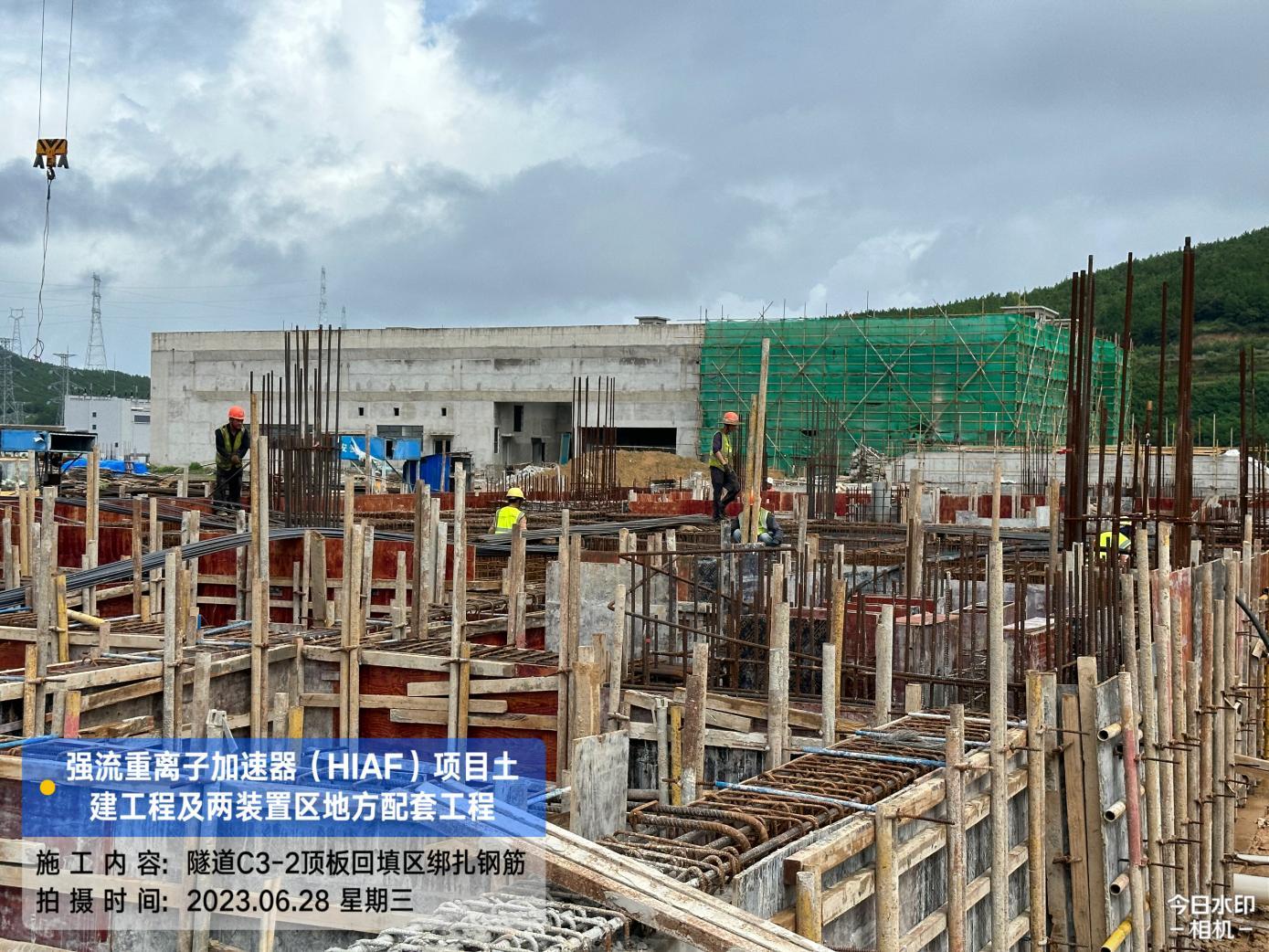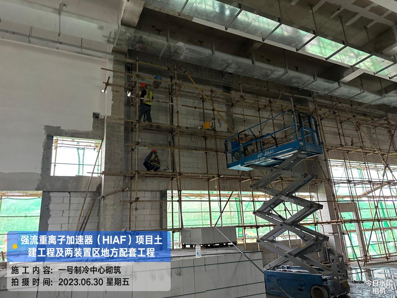 二、HIAF区其它单体:室外综合管廊L2-2段侧墙防水基层修补完成50%;L2-1段顶板第二层防水及保护层完成,回填完成70%。一号制冷中心RC-F/H砌体及圈梁构造柱完成93%。综合测试大厅常温测磁间洁净板安装完成90%,二层房间玻璃窗扇安装完成90%。二号测试大厅CB1-1段首层柱模板完成;CB1-2段首层内架搭设完成,首层柱完成钢筋绑扎完成;CB1-3段首层板混凝土浇筑完成,内架搭设完成30%;CB1-4地梁混凝土浇筑完成。二号综合站房首层地梁钢筋完成,模板完成40%。