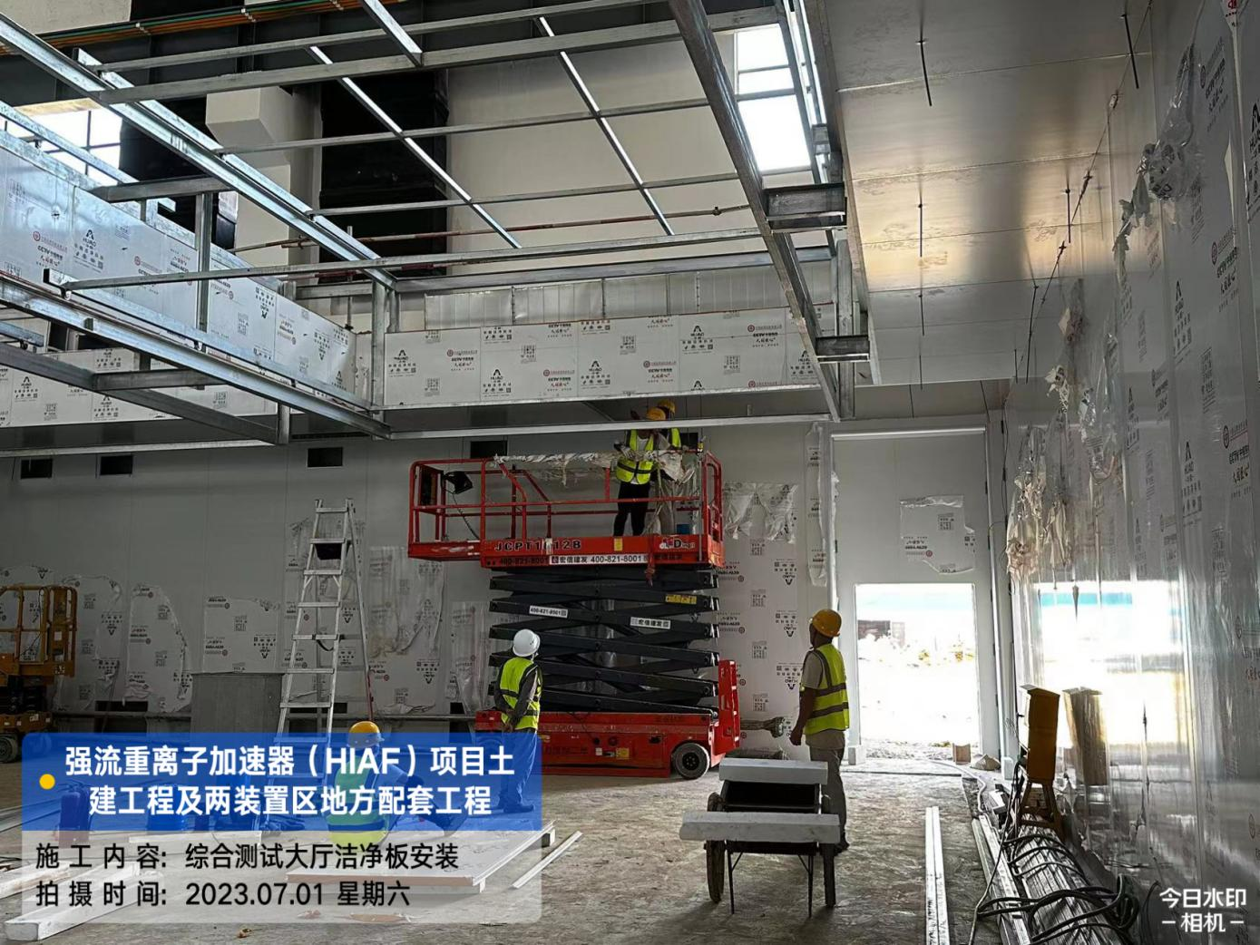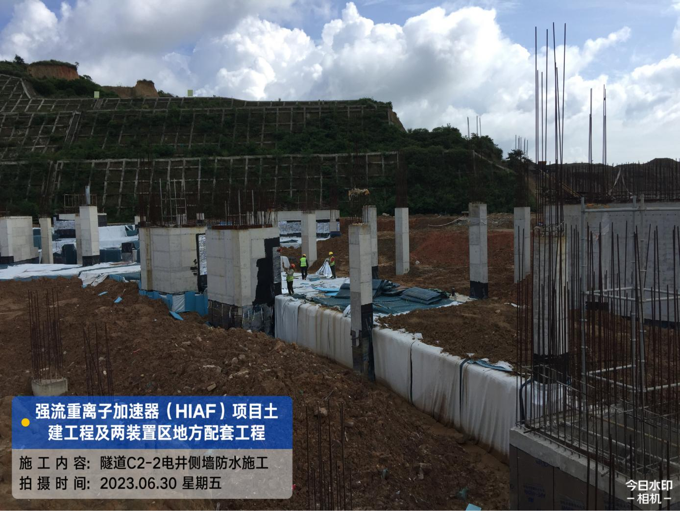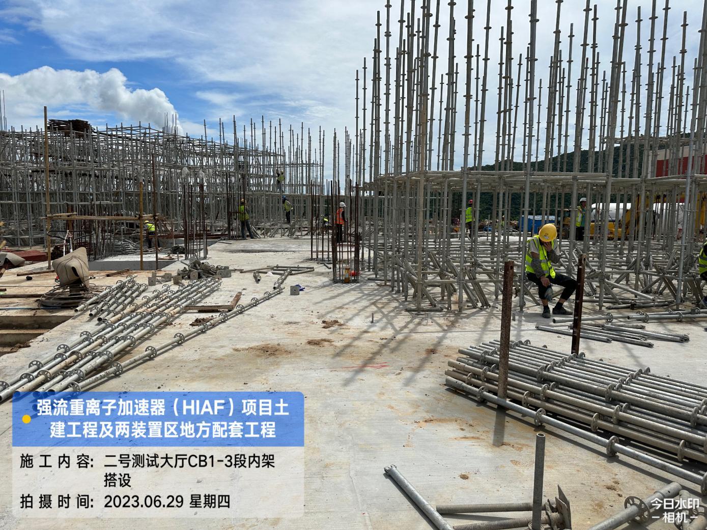 二、HIAF区其它单体:室外综合管廊L2-2段侧墙防水基层修补完成50%;L2-1段顶板第二层防水及保护层完成,回填完成70%。一号制冷中心RC-F/H砌体及圈梁构造柱完成93%。综合测试大厅常温测磁间洁净板安装完成90%,二层房间玻璃窗扇安装完成90%。二号测试大厅CB1-1段首层柱模板完成;CB1-2段首层内架搭设完成,首层柱完成钢筋绑扎完成;CB1-3段首层板混凝土浇筑完成,内架搭设完成30%;CB1-4地梁混凝土浇筑完成。二号综合站房首层地梁钢筋完成,模板完成40%。