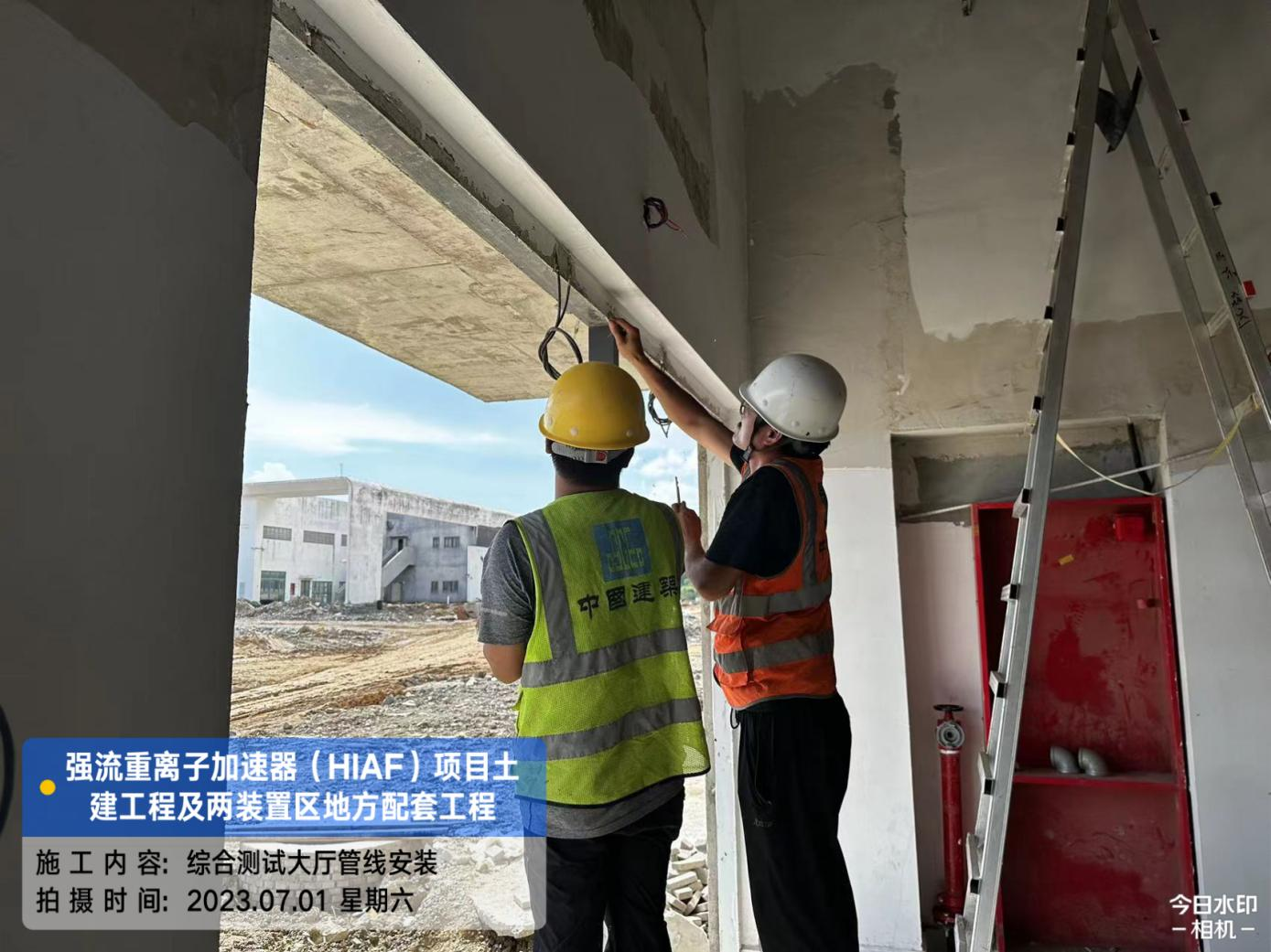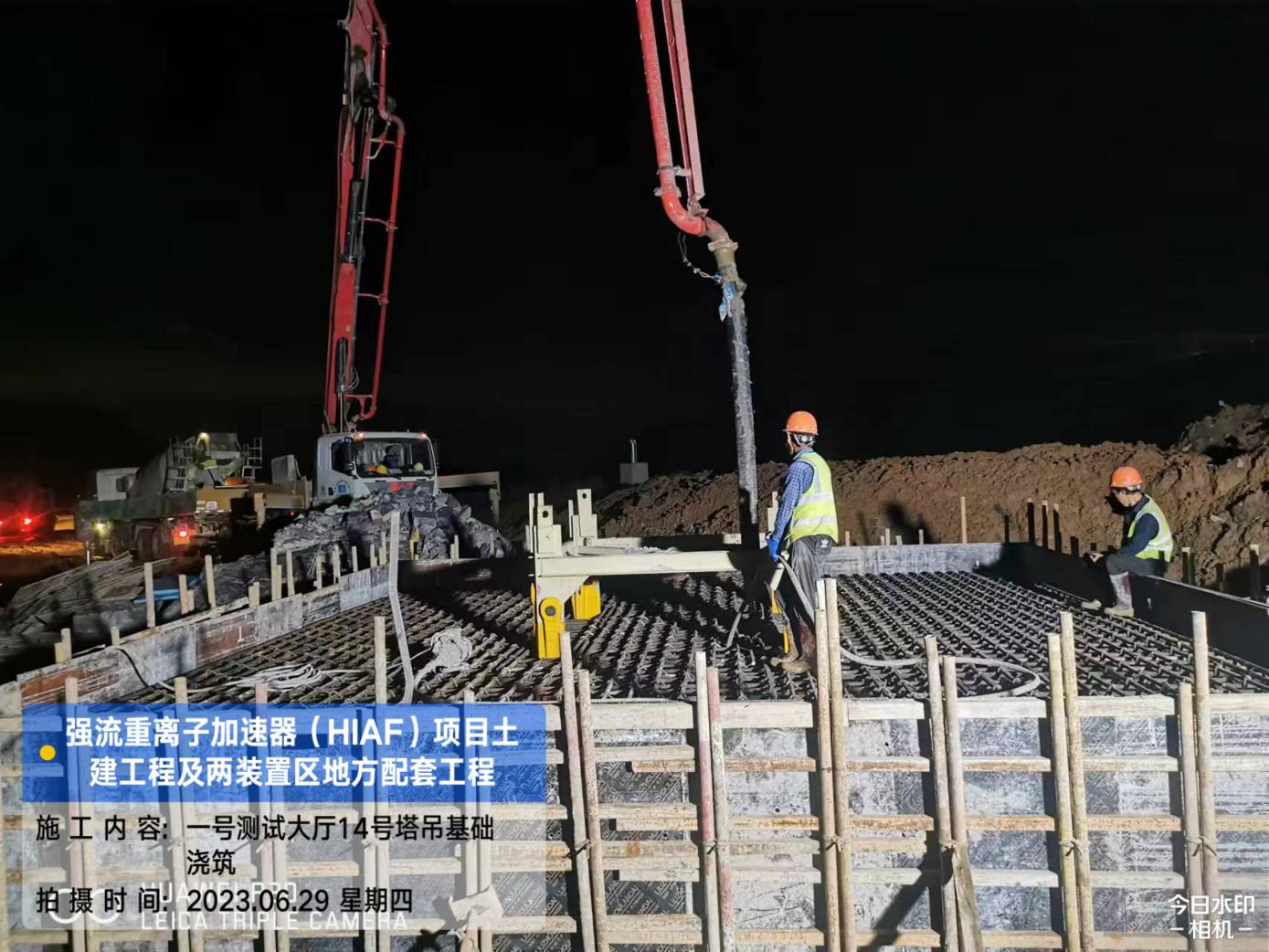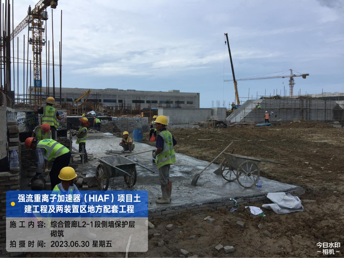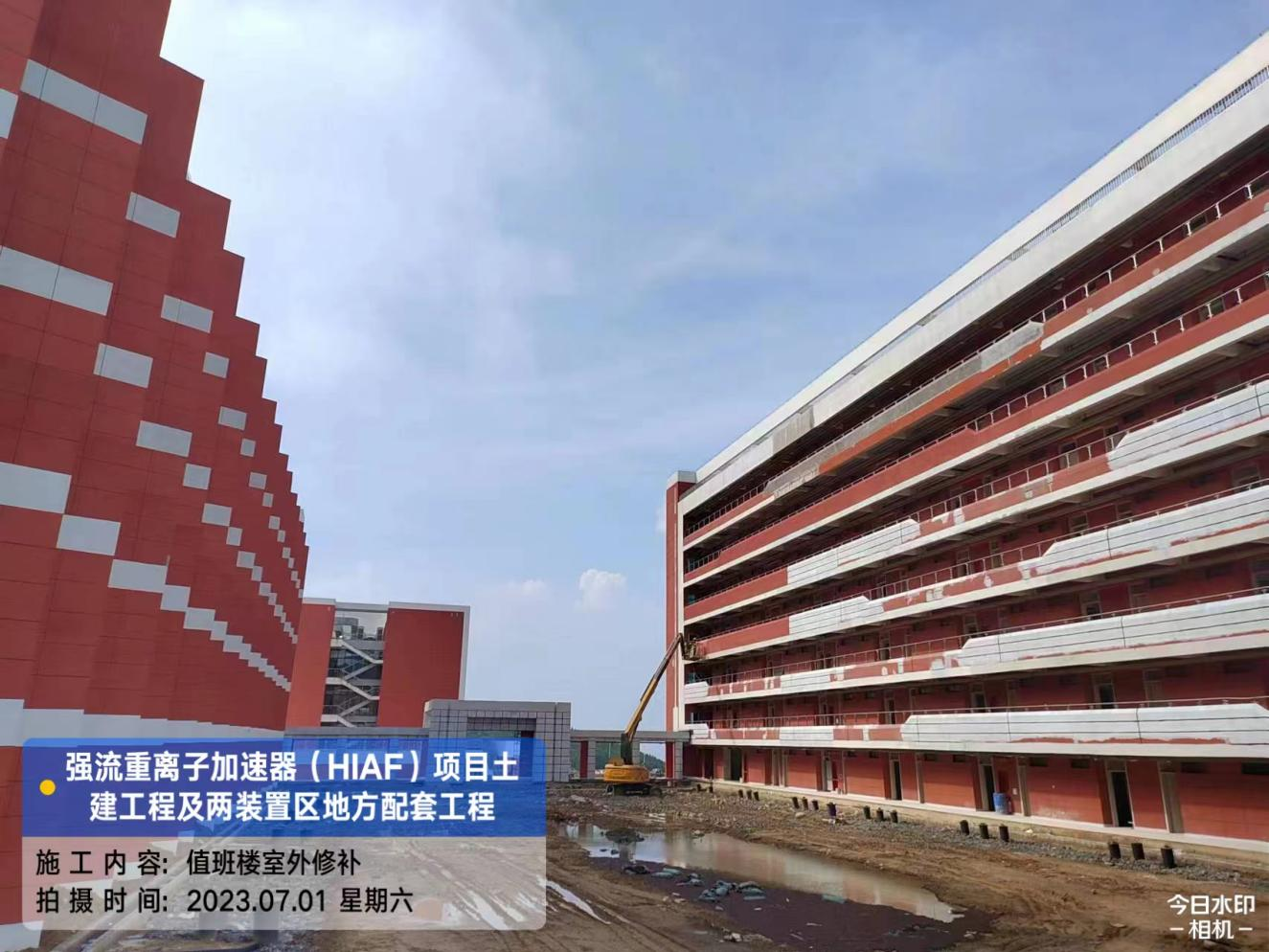 二、HIAF区其它单体:室外综合管廊L2-2段侧墙防水基层修补完成50%;L2-1段顶板第二层防水及保护层完成,回填完成70%。一号制冷中心RC-F/H砌体及圈梁构造柱完成93%。综合测试大厅常温测磁间洁净板安装完成90%,二层房间玻璃窗扇安装完成90%。二号测试大厅CB1-1段首层柱模板完成;CB1-2段首层内架搭设完成,首层柱完成钢筋绑扎完成;CB1-3段首层板混凝土浇筑完成,内架搭设完成30%;CB1-4地梁混凝土浇筑完成。二号综合站房首层地梁钢筋完成,模板完成40%。