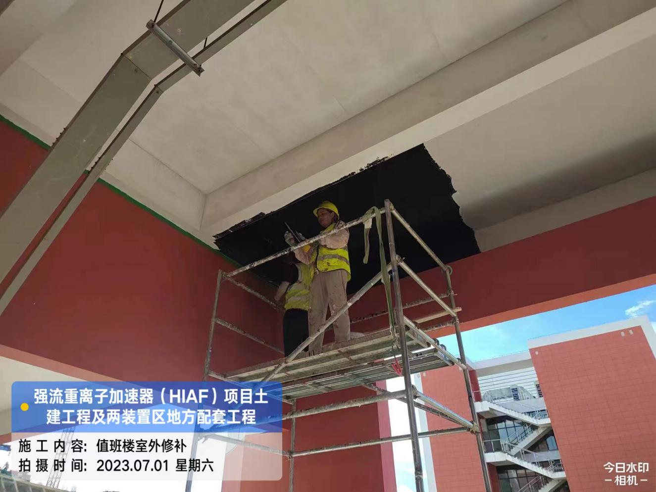 三、后勤区:科学之门钢结构雨棚玻璃安装完成。值班楼走廊女儿墙外墙涂料完成30%,首层、三层内墙维修完成50%。