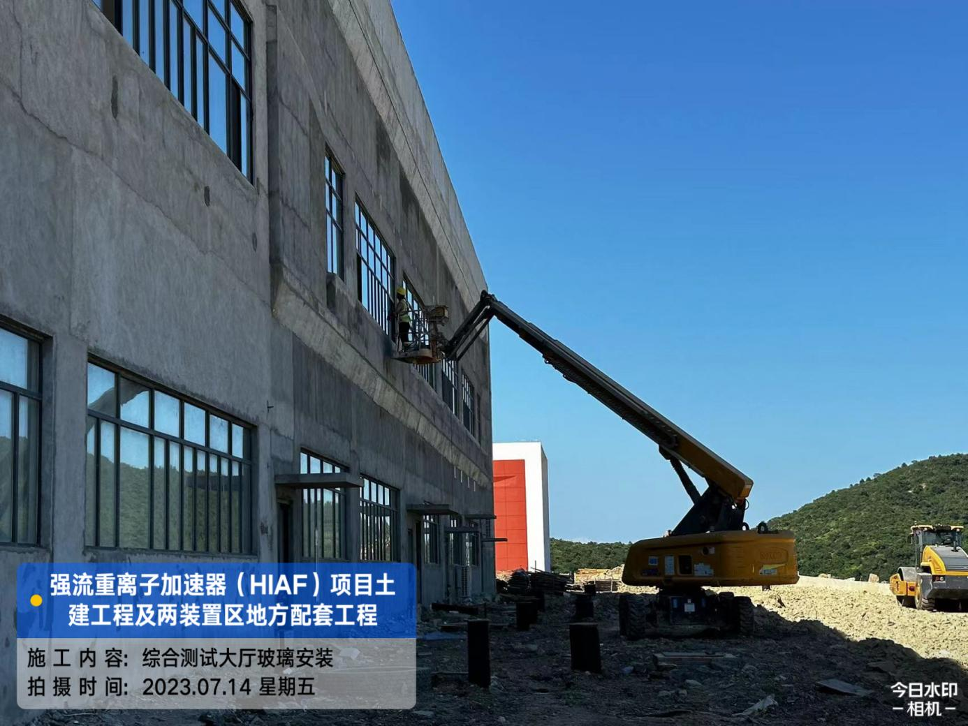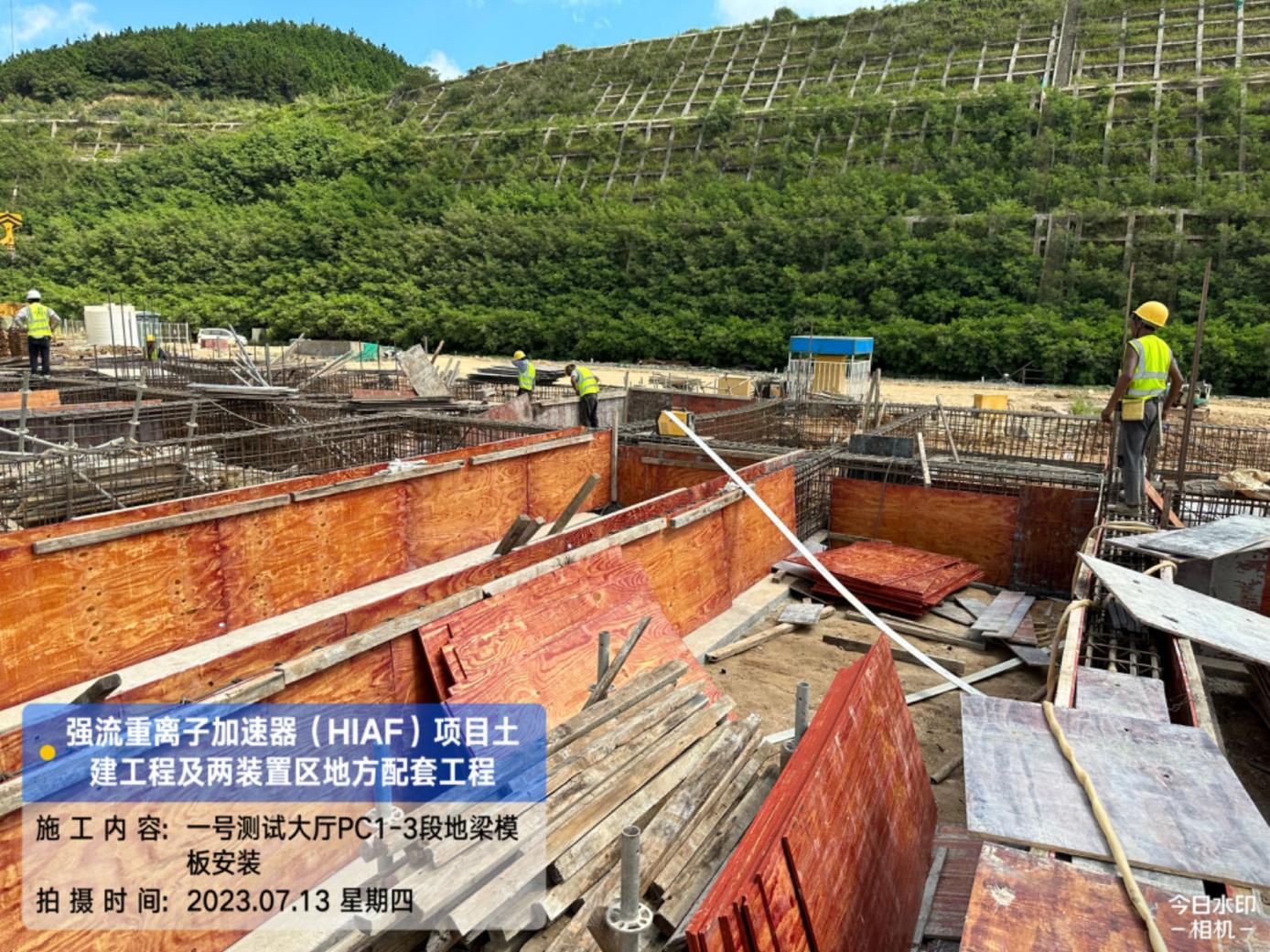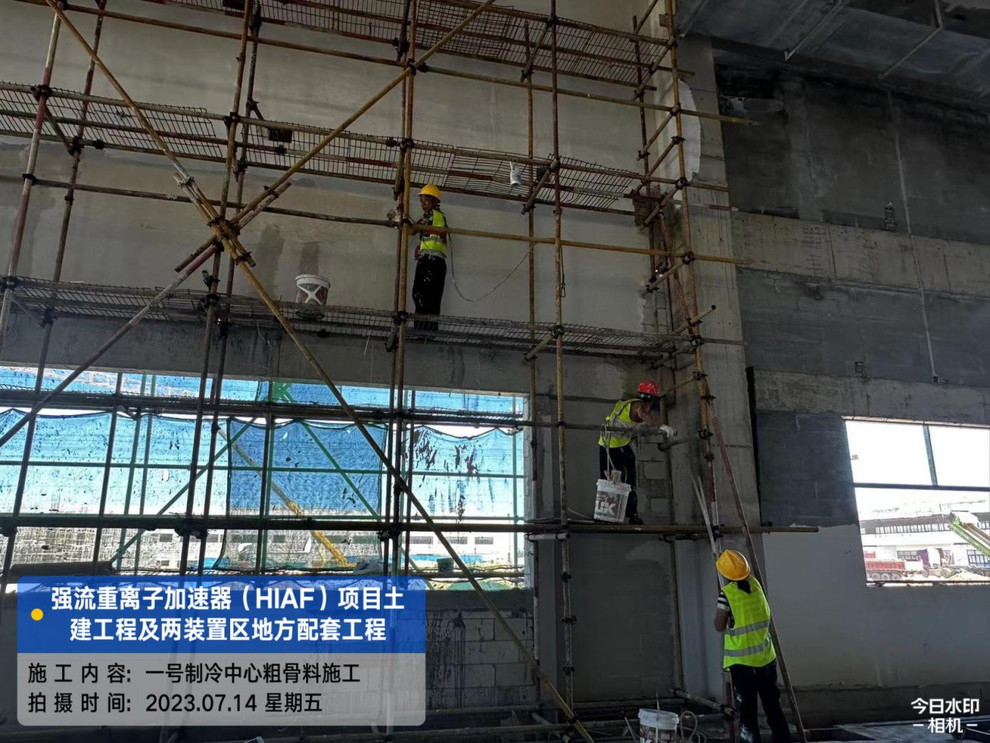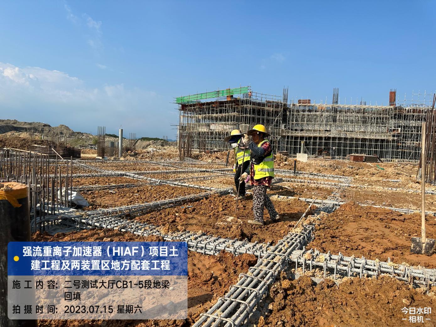 二、HIAF区其它单体:室外综合管廊L2-2段牛腿防水完成50%;L2-1段变更部位牛腿防水完成,保护砖砌筑完成50%,回填完成50%。一号制冷中心RC-F/H轴内墙粗一体化腻子完成60%,外墙甩浆挂网完成;RC-A/F轴外架拆除完成。综合测试大厅木门安装完成80%。一号测试大厅PC1-3段地梁钢筋绑扎完成,模板完成60%;PC1-2段地梁钢筋完成10%。二号测试大厅CB1-1段5.25标高至屋面内架搭设完成,结构柱钢筋完成50%;CB1-2段6.45标高至屋面结构柱钢筋完成50%;CB1-3段夹层(-0.05-6.45)梁柱混凝土浇筑完成;CB1-4首层柱钢筋绑扎完成,内架搭设完成;CB1-5地梁内回填完成50%。二号综合站房首层板混凝土浇筑完成,内架搭设完成30%。