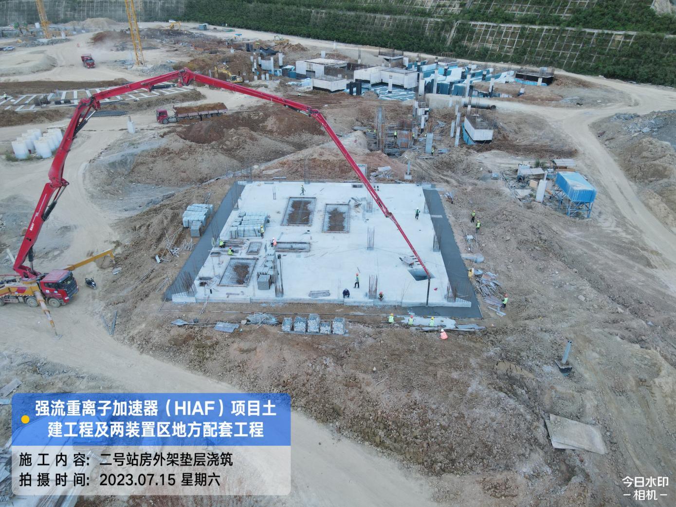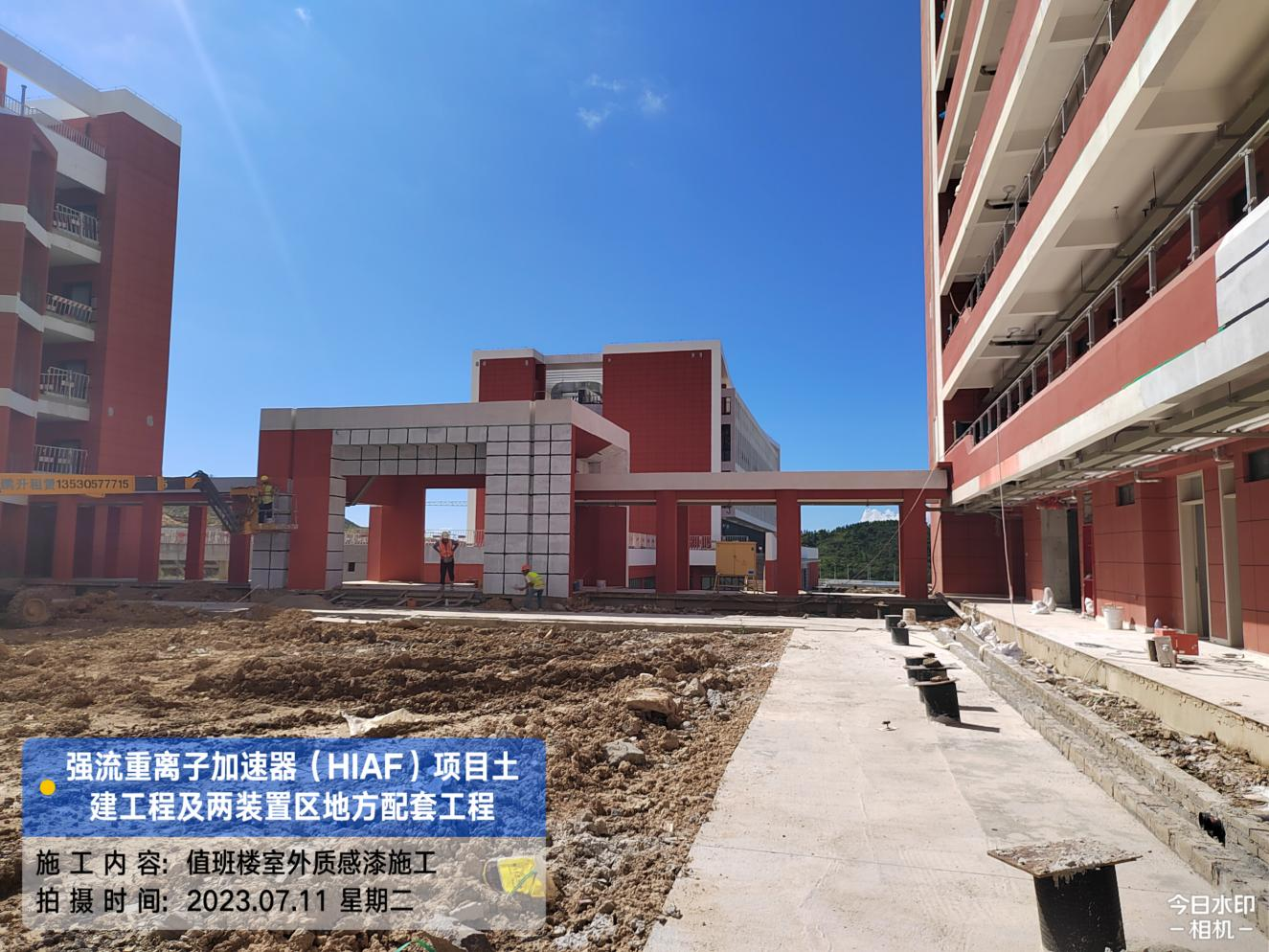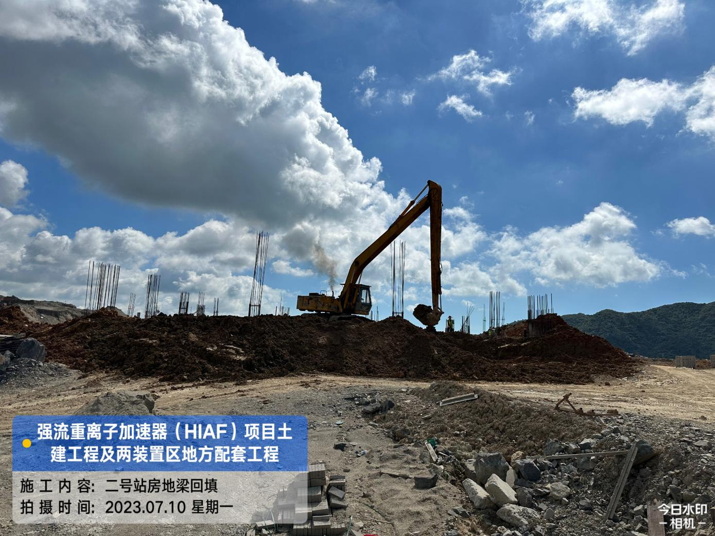 二、HIAF区其它单体:室外综合管廊L2-2段牛腿防水完成50%;L2-1段变更部位牛腿防水完成,保护砖砌筑完成50%,回填完成50%。一号制冷中心RC-F/H轴内墙粗一体化腻子完成60%,外墙甩浆挂网完成;RC-A/F轴外架拆除完成。综合测试大厅木门安装完成80%。一号测试大厅PC1-3段地梁钢筋绑扎完成,模板完成60%;PC1-2段地梁钢筋完成10%。二号测试大厅CB1-1段5.25标高至屋面内架搭设完成,结构柱钢筋完成50%;CB1-2段6.45标高至屋面结构柱钢筋完成50%;CB1-3段夹层(-0.05-6.45)梁柱混凝土浇筑完成;CB1-4首层柱钢筋绑扎完成,内架搭设完成;CB1-5地梁内回填完成50%。二号综合站房首层板混凝土浇筑完成,内架搭设完成30%。