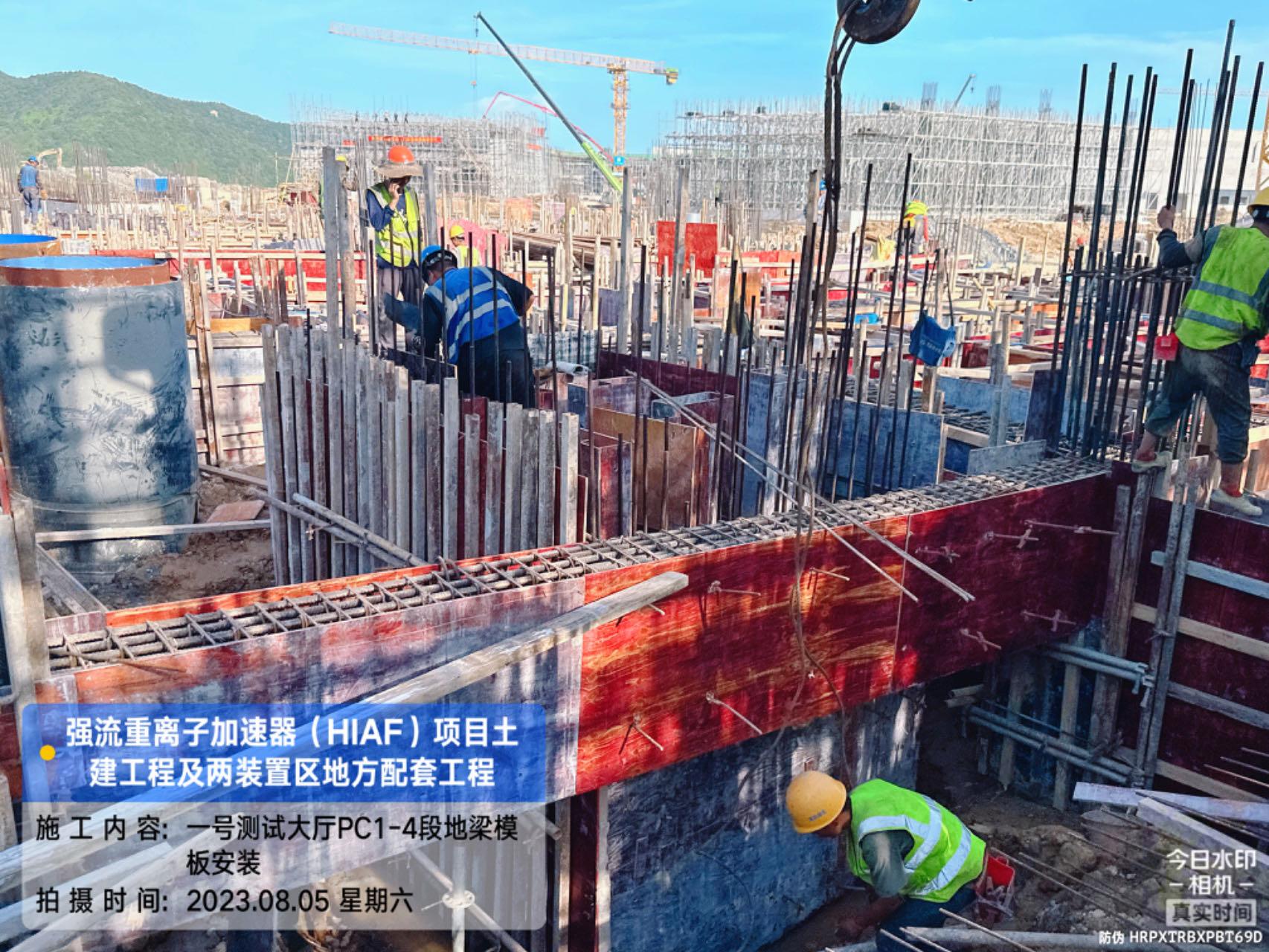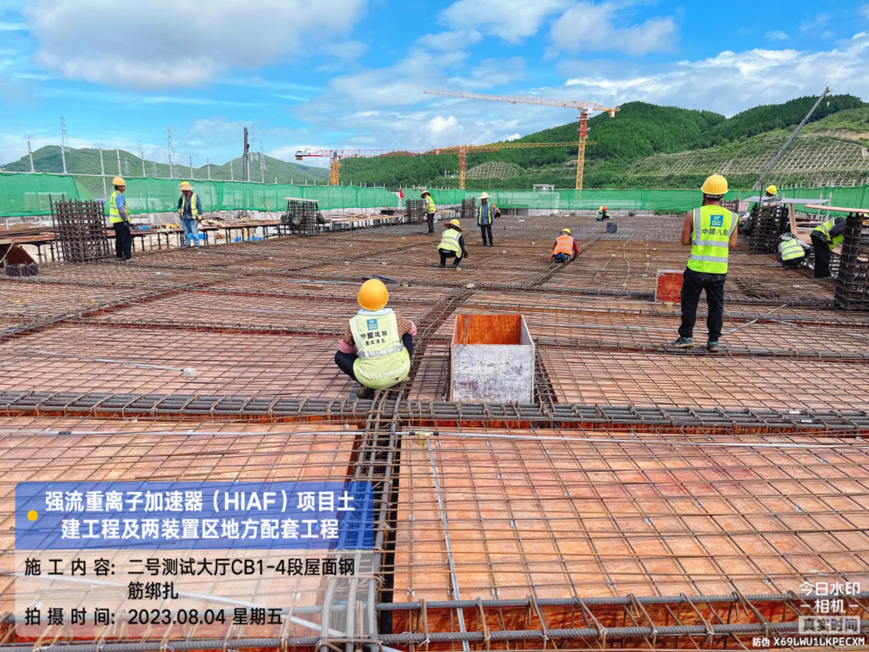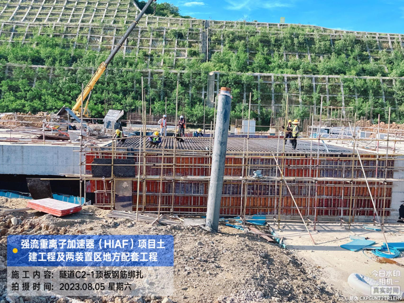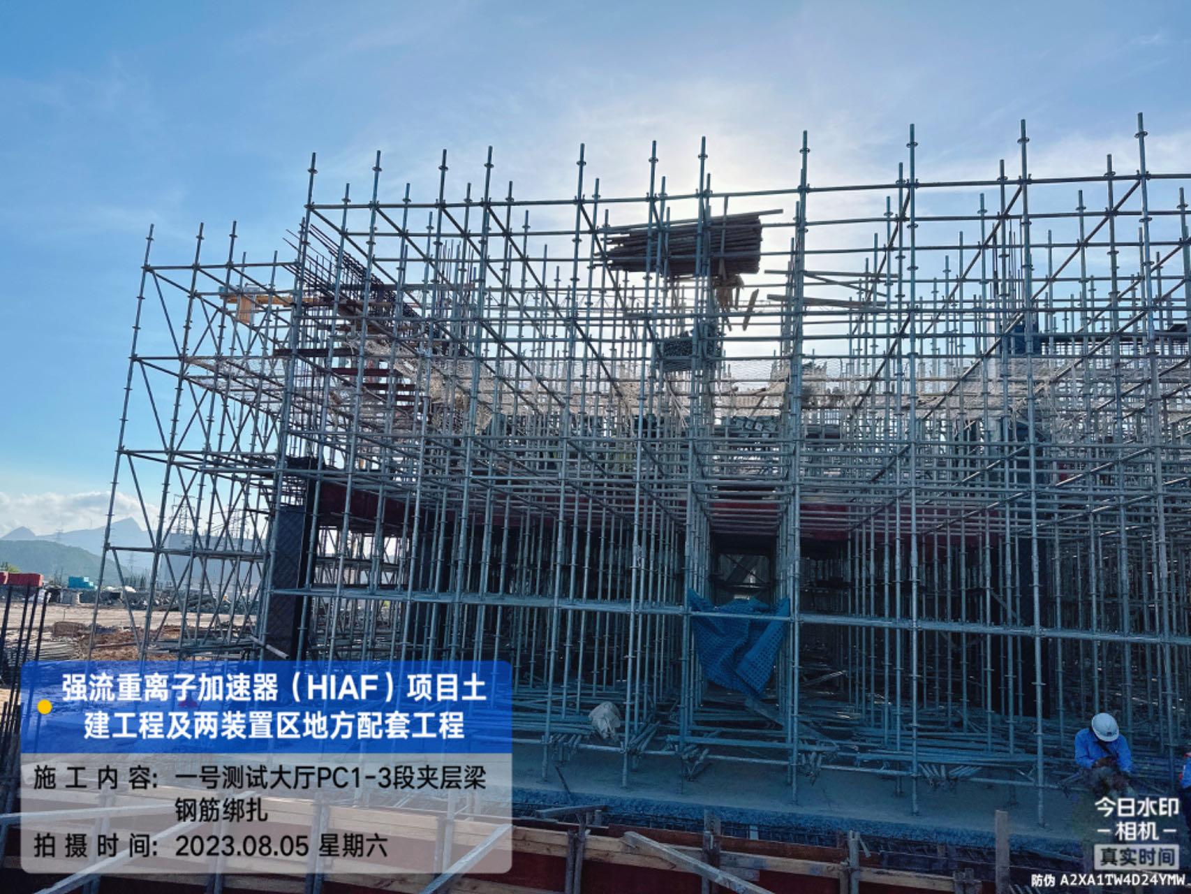 二、HIAF区其它单体:室外综合管廊GL-AC轴、GL-W轴侧墙回填完成80%。一号制冷中心RC-F/H轴地坪施工完成80%。综合测试大厅室外道路混凝土浇筑完成60%;西侧电缆沟完成20%。一号测试大厅PC1-2段首层板混凝土浇筑完成;PC1-3段柱子钢筋绑扎完成;PC1-4段地梁钢筋绑扎完成;PC9-14轴地梁混凝土浇筑完成;PC1-5段内架搭设完成70%。二号测试大厅CB1-2段屋面挑板浇筑完成;CB1-3段屋面梁板柱混凝土浇筑完成;CB1-4首层(6.45至8.6)屋面梁板柱浇筑完成;CB1-4/5首层板(CB15轴-CB18轴)内架搭设完成;CB1-5段地梁(CB12轴-CB15轴)、首层板混凝土浇筑完成。二号综合站房首层至7.4梁柱混凝土浇筑完成。