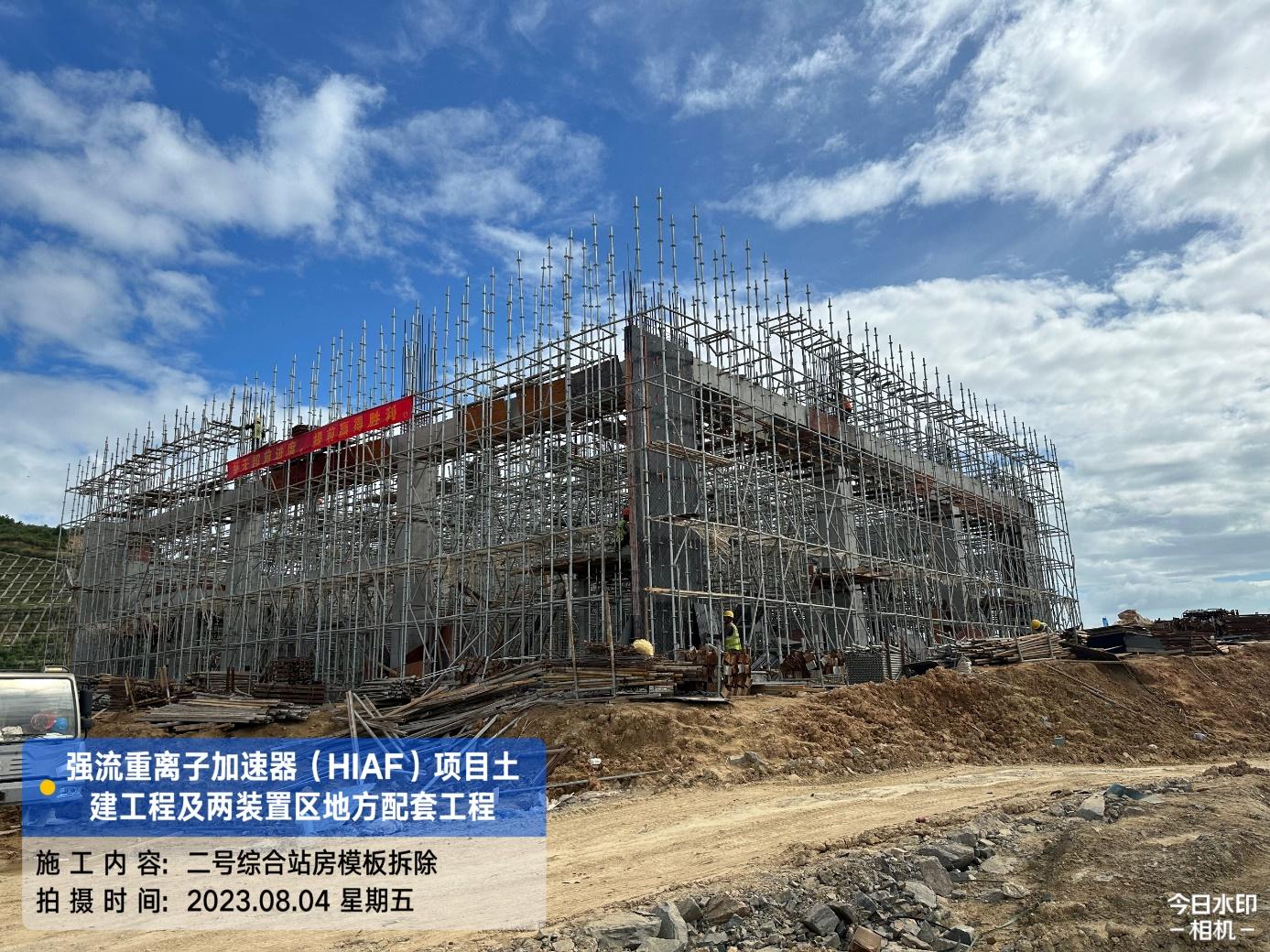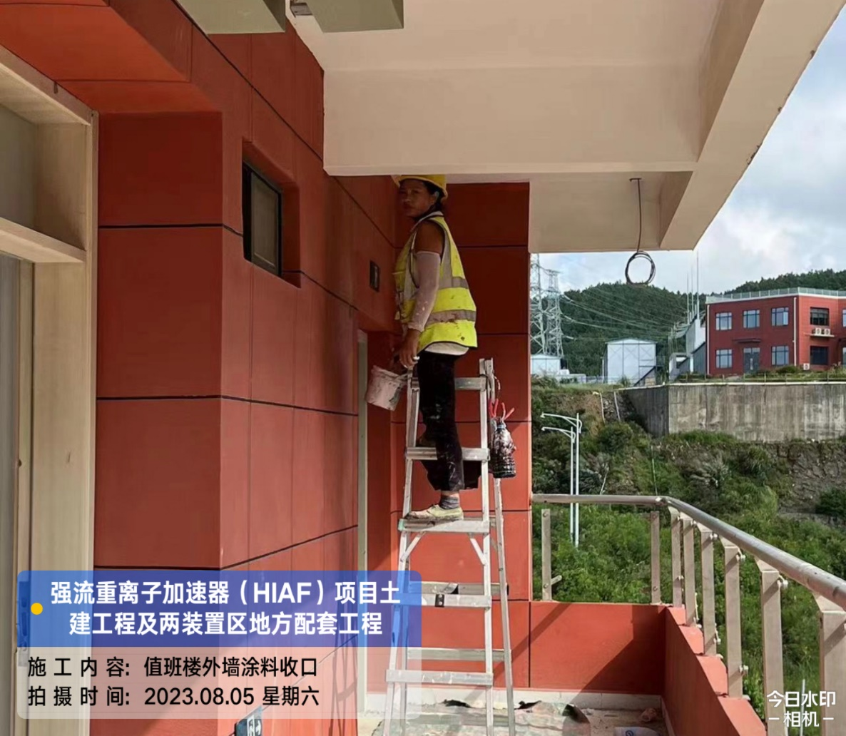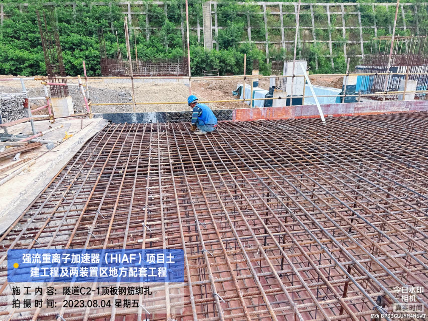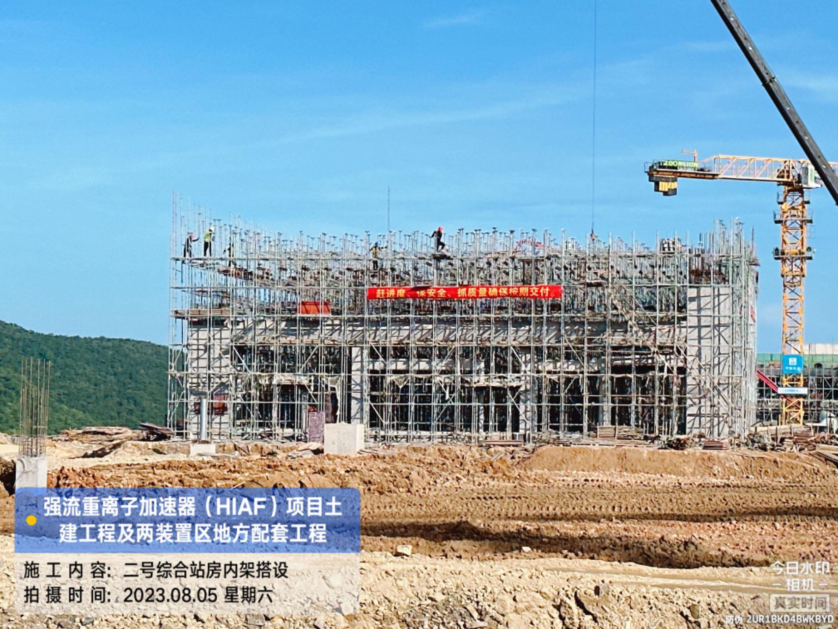二、HIAF区其它单体:室外综合管廊GL-AC轴、GL-W轴侧墙回填完成80%。一号制冷中心RC-F/H轴地坪施工完成80%。综合测试大厅室外道路混凝土浇筑完成60%;西侧电缆沟完成20%。一号测试大厅PC1-2段首层板混凝土浇筑完成;PC1-3段柱子钢筋绑扎完成;PC1-4段地梁钢筋绑扎完成;PC9-14轴地梁混凝土浇筑完成;PC1-5段内架搭设完成70%。二号测试大厅CB1-2段屋面挑板浇筑完成;CB1-3段屋面梁板柱混凝土浇筑完成;CB1-4首层(6.45至8.6)屋面梁板柱浇筑完成;CB1-4/5首层板(CB15轴-CB18轴)内架搭设完成;CB1-5段地梁(CB12轴-CB15轴)、首层板混凝土浇筑完成。二号综合站房首层至7.4梁柱混凝土浇筑完成。