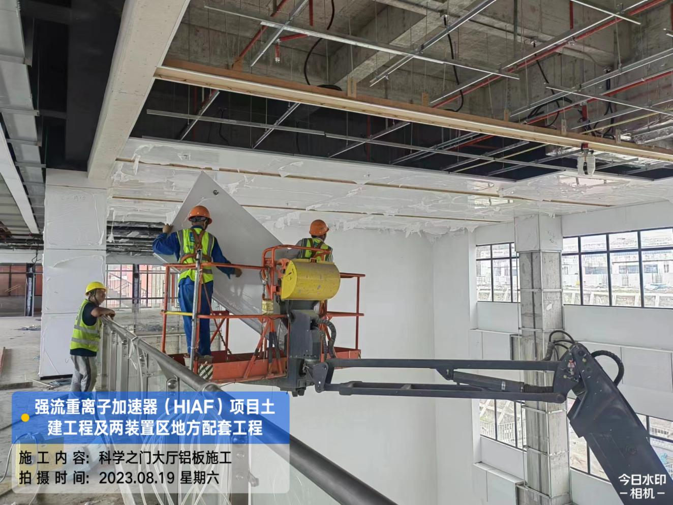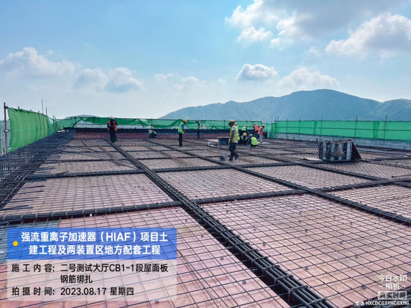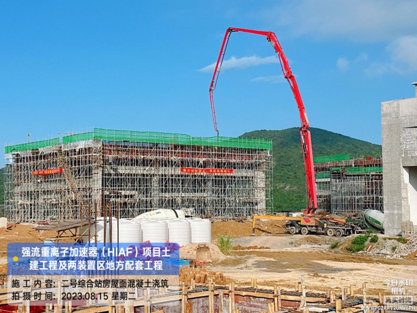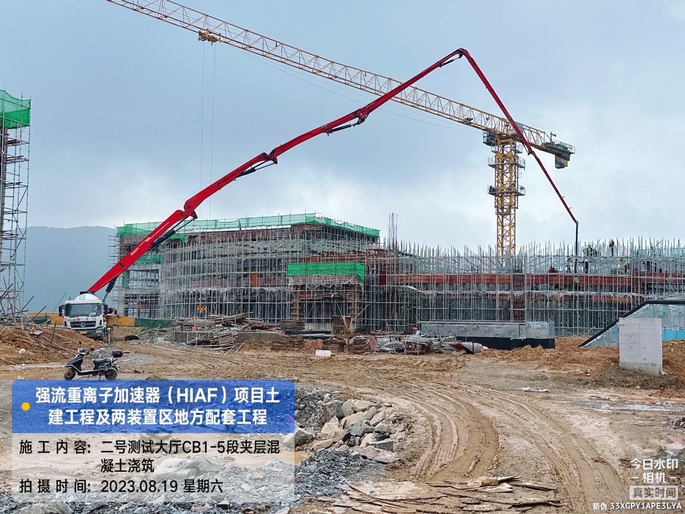 二、HIAF区其它单体:室外综合管廊GL-AC轴-GL-W轴侧墙回填完成80%。一号制冷中心纯水间砌筑完成50%。一号测试大厅PC1-2/5段夹层结构混凝土浇筑完成;PC1-3段屋面模板支设完成60%;PC1-4段夹层柱钢筋完成50%;PC1-6段地梁混凝土浇筑完成50%。二号测试大厅CB1-1段8.6至12.9屋面混凝土浇筑完成;CB1-5段夹层混凝土浇筑完成。二号综合站房屋面结构混凝土浇筑完成。室外D K0+740~820、M K0+000~080消防车道混凝土浇筑分别完成50%、20%;G K0+000~220、NX+020~120、NX+220~320消防车道碎石基层完成50%。