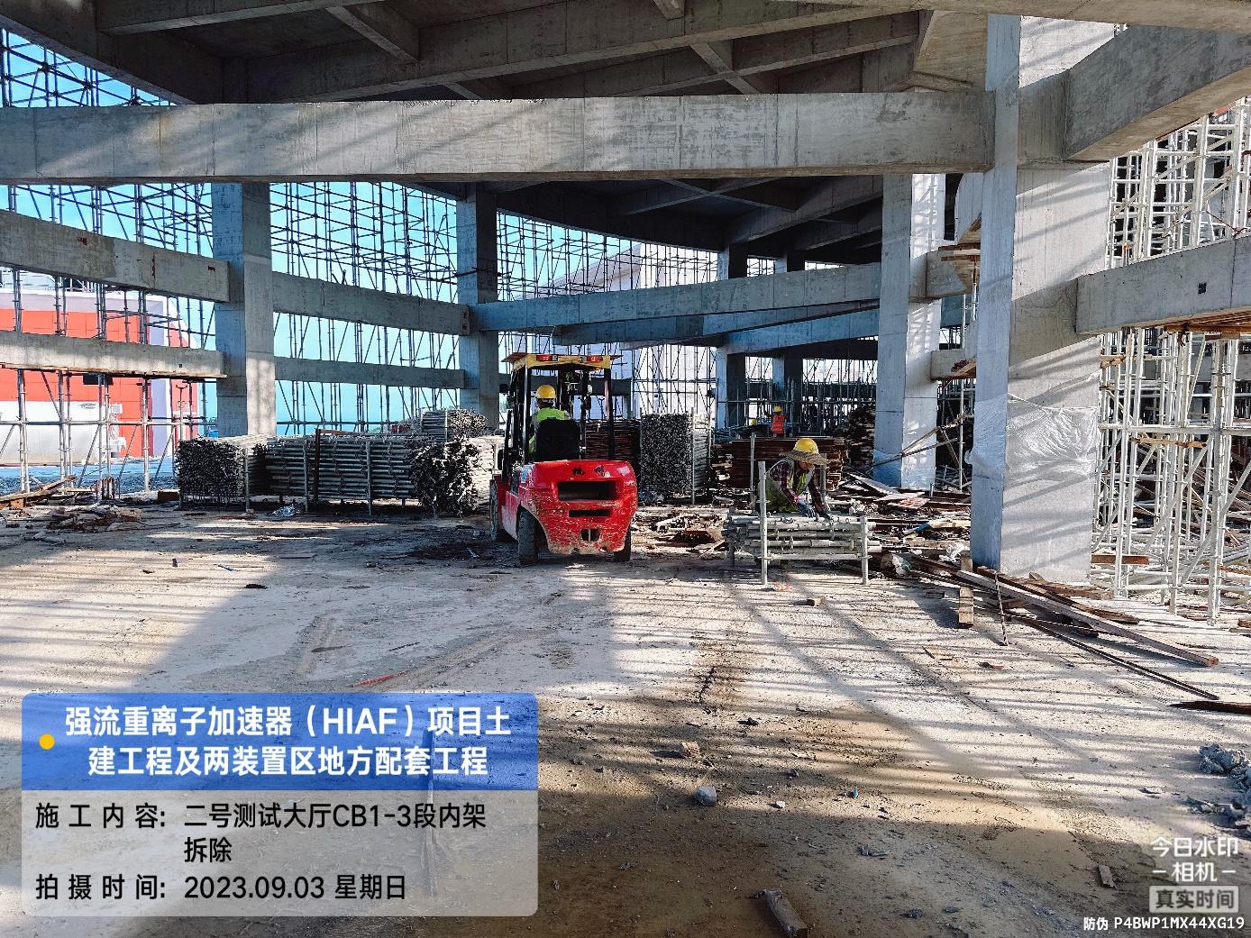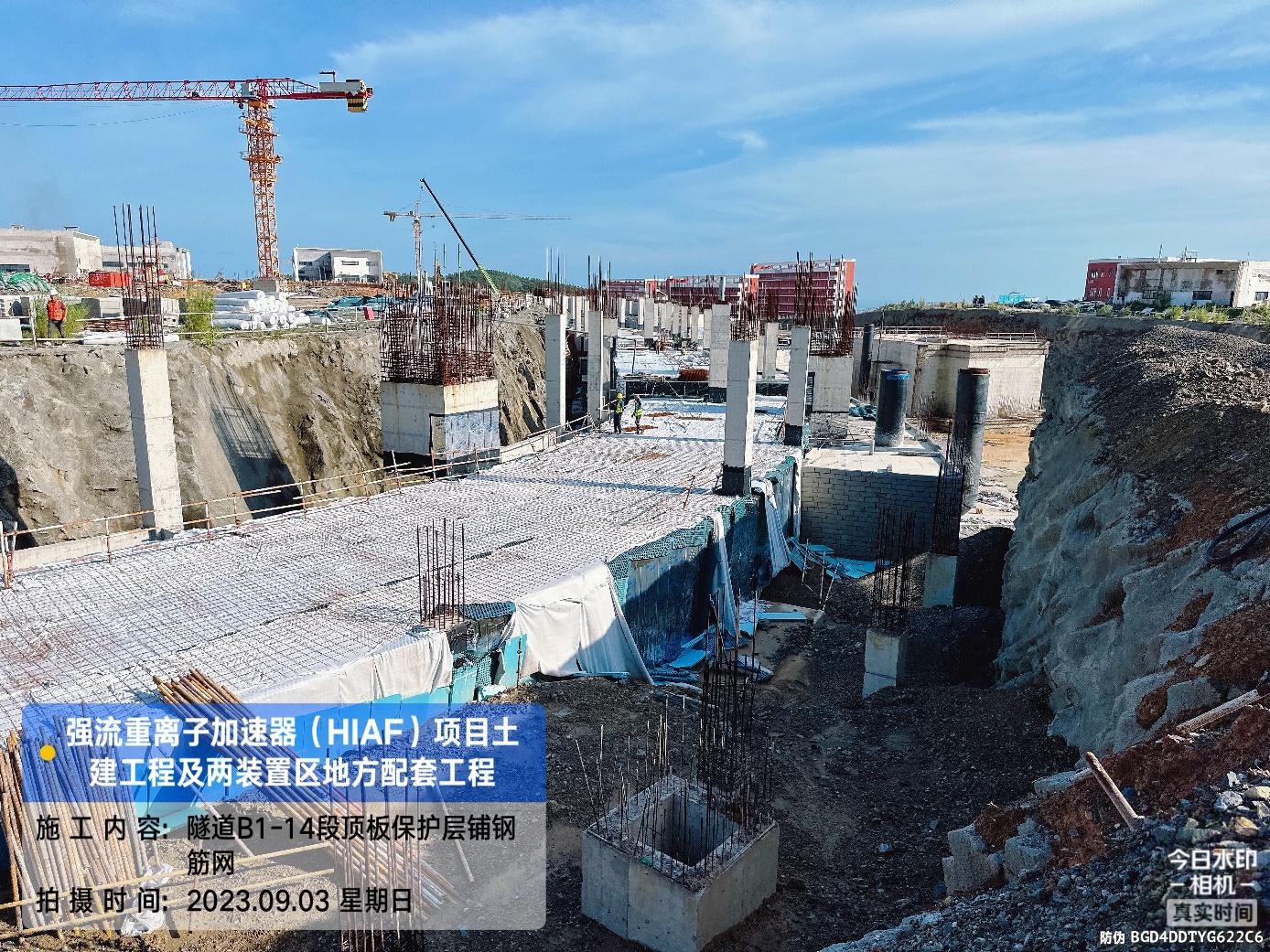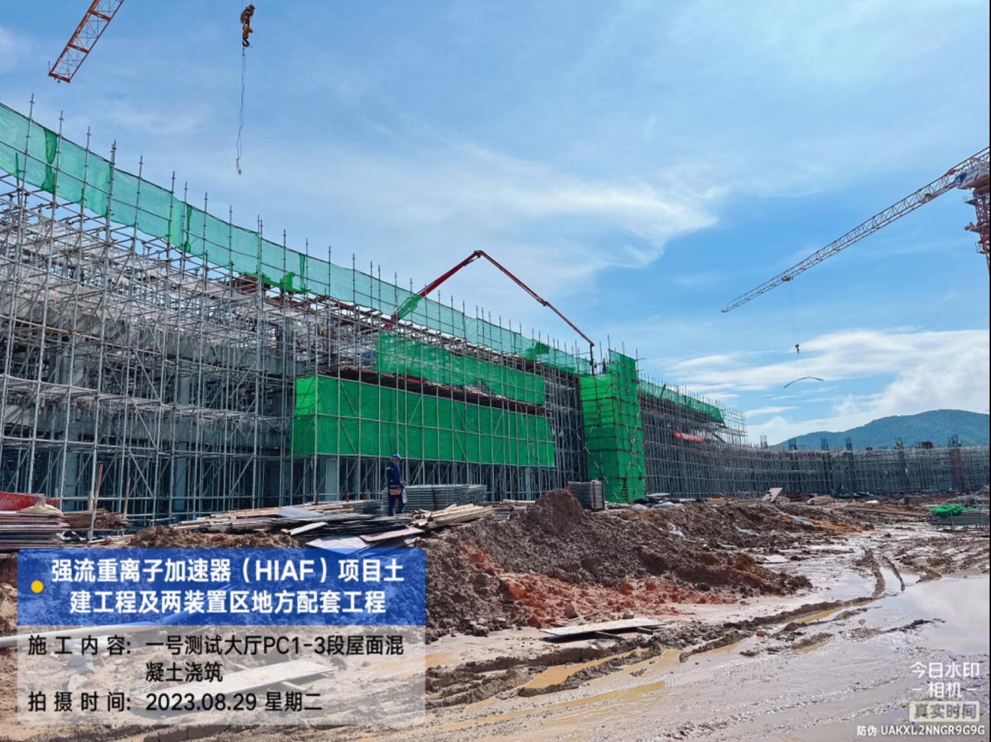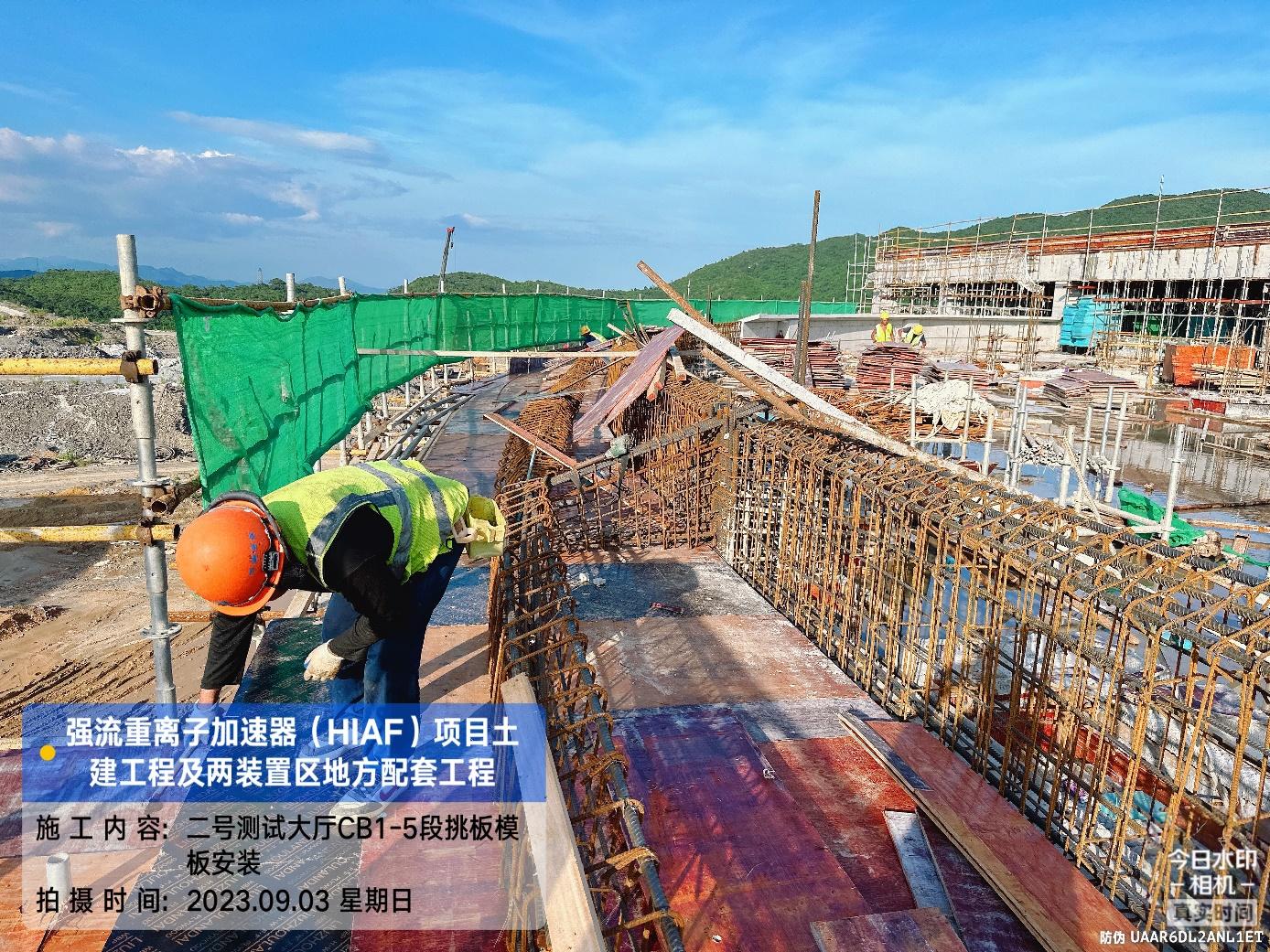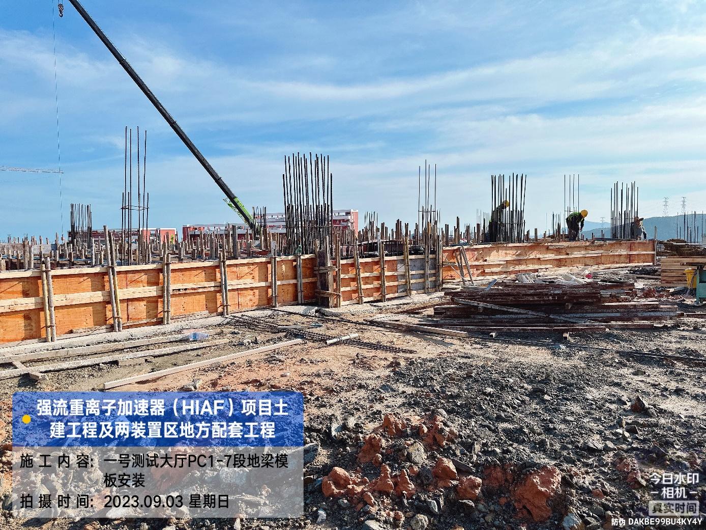二、HIAF区其它单体:一号制冷中心RC-3至RC-4轴交RC-H至RC-G轴圈梁浇筑完成。综合测试大厅首层内墙涂料完成40%。一号测试大厅PC1-2段屋面钢筋模板支设完成30%;PC1-3段屋面混凝土浇筑完成;PC1-4段夹层混凝土浇筑完成50%,夹层钢筋模板完成90%;PC1-5段屋面钢筋模板完成60%;PC1-6段首层板混凝土浇筑完成50%;PC1-7段地梁钢筋完成100%。二号测试大厅CB1-5段屋面混凝土浇筑完成;CB1-4段(18-19轴)夹层钢筋完成;CB1-2段内架拆除清理完成100%;CB1-5段屋面挑板钢筋完成80%。二号综合站房屋面女儿墙混凝土浇筑完成。