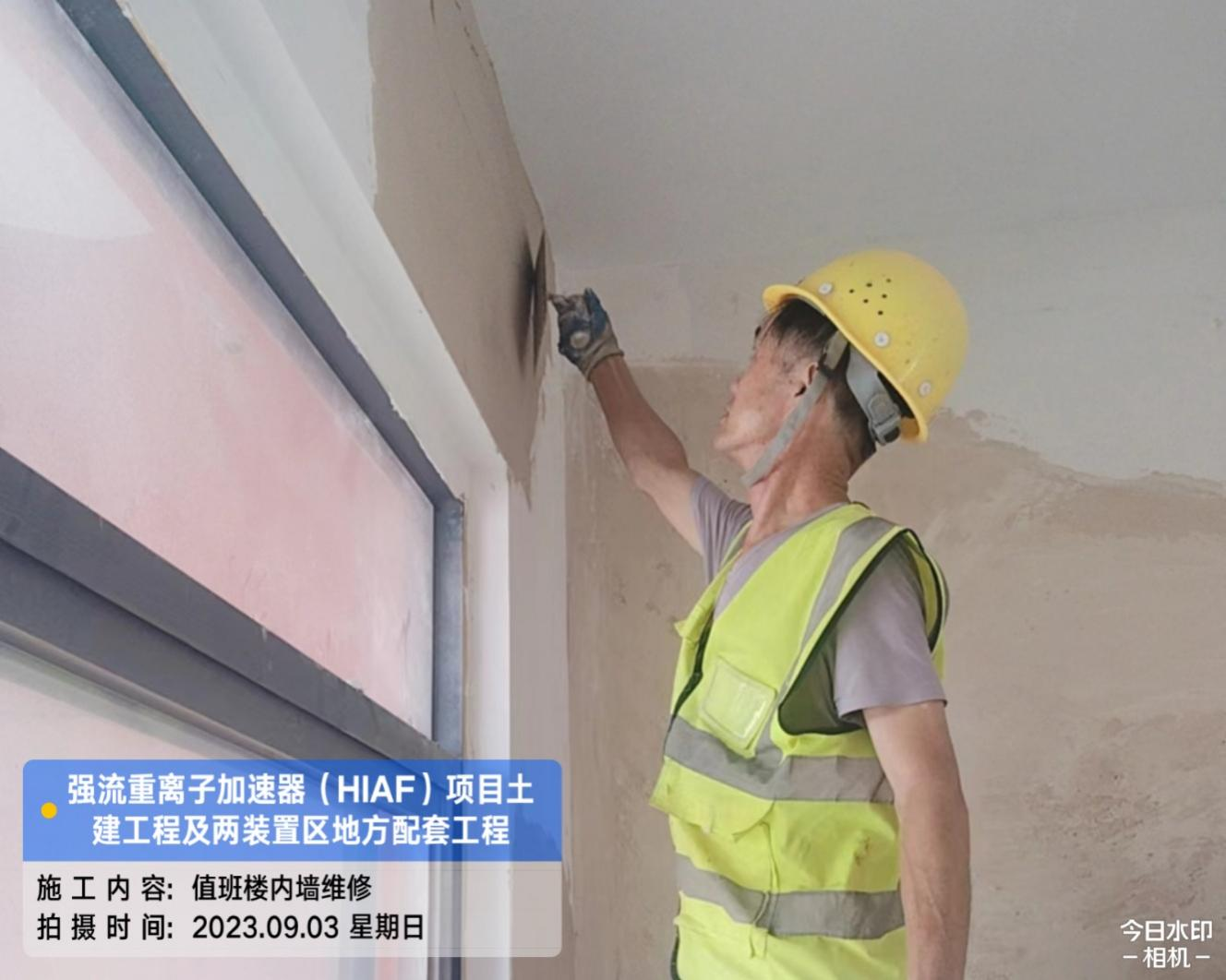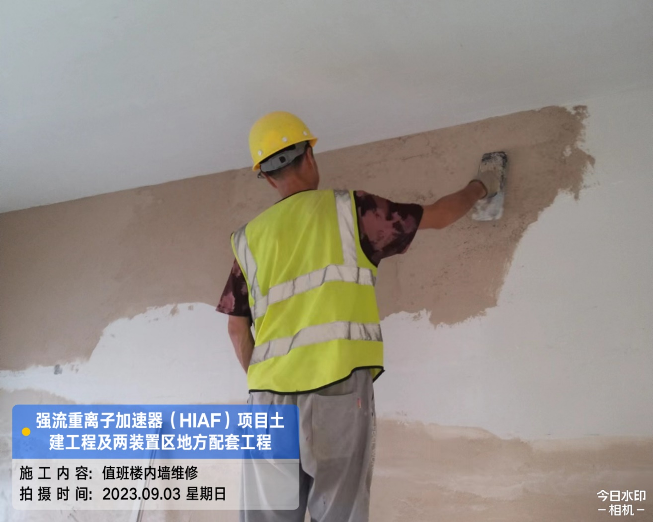 三、后勤区:科学之门大厅梁柱包板打胶完成。值班楼1号楼一层、二层内墙维修完成。