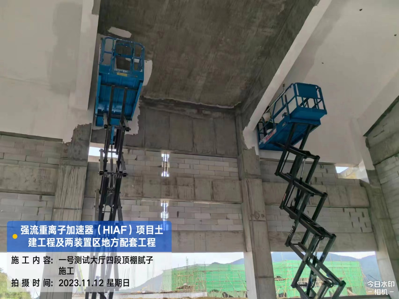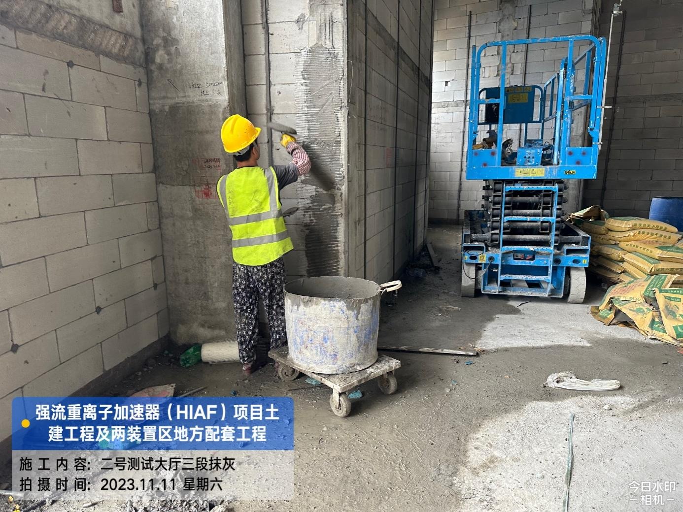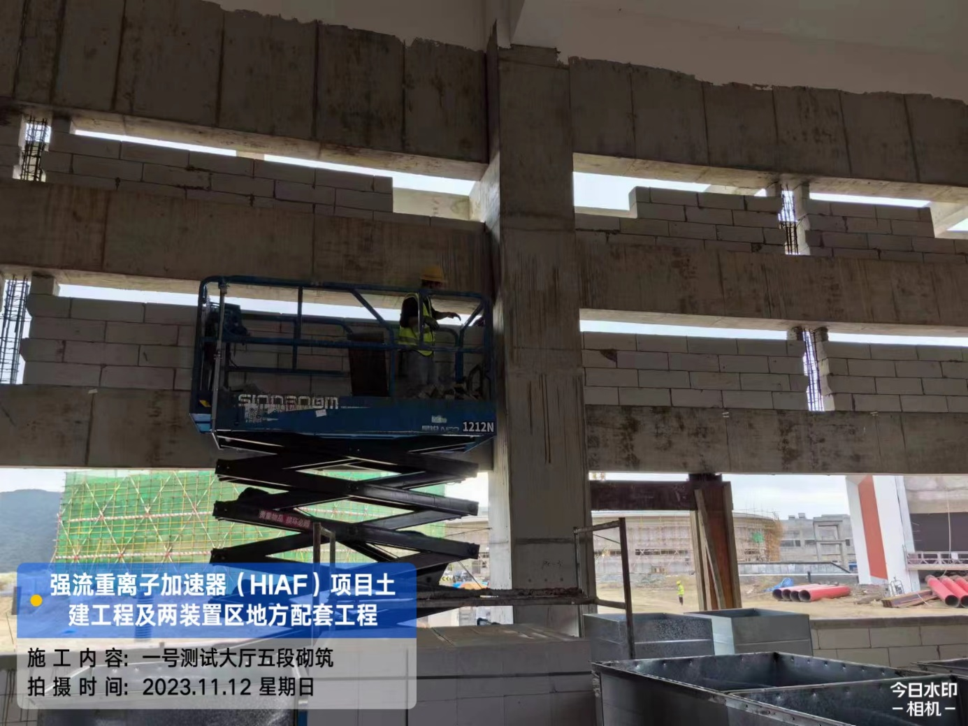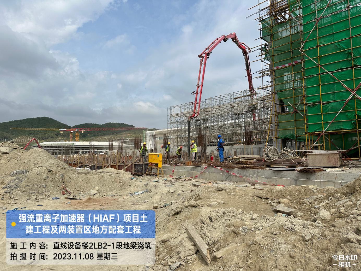 二、HIAF区其它单体:一号制冷中心RC-4轴外墙抹灰完成30%。综合测试大厅TH-3轴外墙抹灰完成。一号测试大厅PC1-1段屋面混凝土浇筑完成;PC1-8段(2/PC-42至PC-49轴)地梁混凝土浇筑完成;PC1-3段砌筑完成90%;PC1-4段砌筑完成40%;PC1-5段砌筑完成70%;PC1-6段砌筑完成30%。二号测试大厅屋面防水完成90%,屋面防水保护层完成30%;内墙抹灰完成40%,2.5以下构造柱浇筑完成90%。一号综合站房(2)内架拆除完成80%,(3)2.05m梁混凝土浇筑完成。二号综合站房内墙抹灰完成90%,顶棚腻子完成40%,窗框安装完成70%。直线设备楼2号楼LB2-3段(LB2-11至LB2-16轴)12.1m板混凝土浇筑完成,LB2-4段(LB2-16至LB2-19轴)8.6m板混凝土浇筑完成。室外综合管廊GL-A至GL-C轴牛脚、侧墙防水完成。室外E+420~520消防车道混凝土浇筑完成。