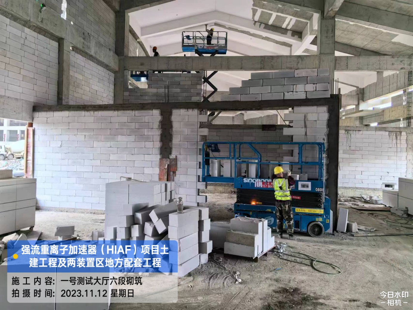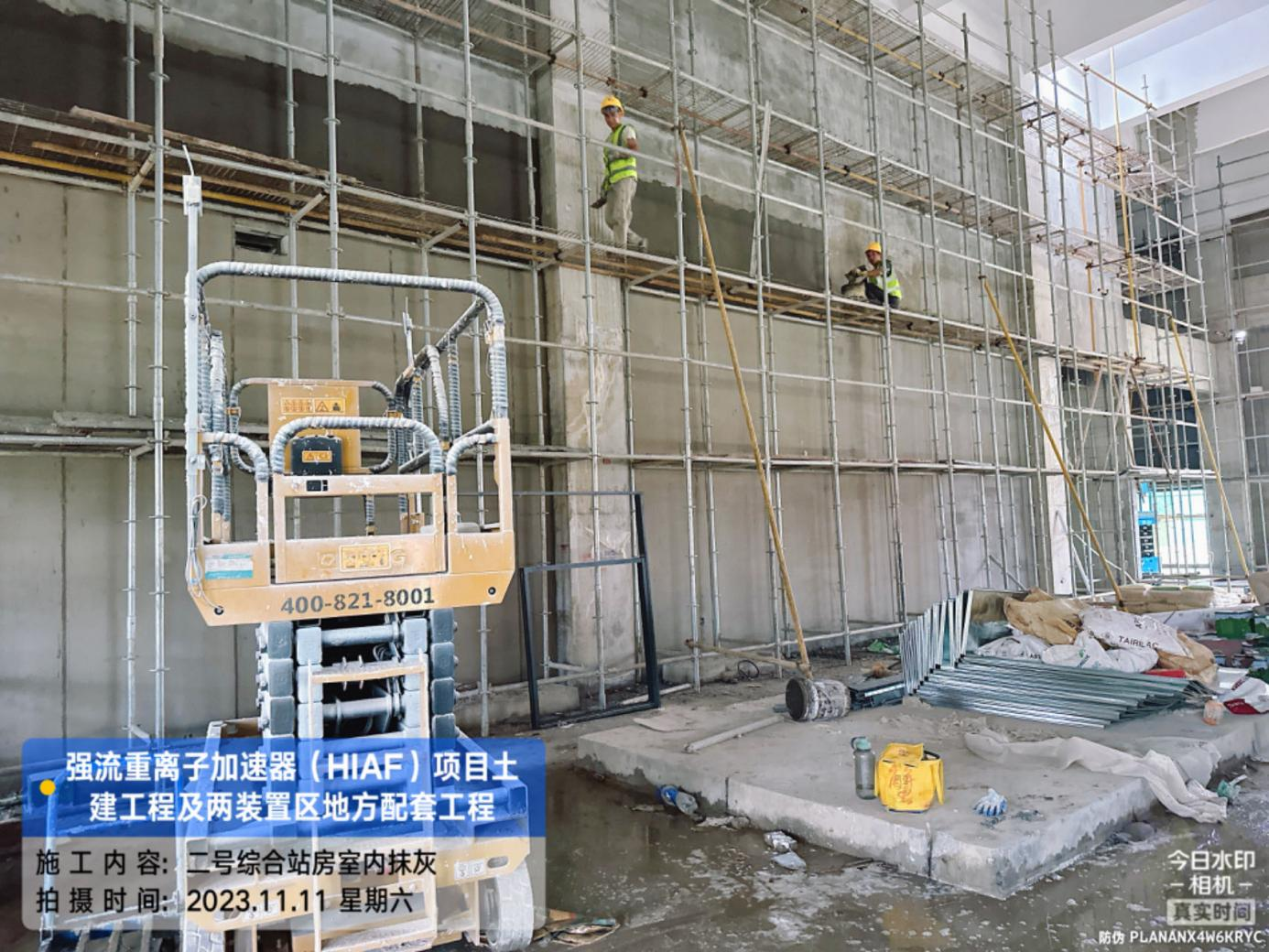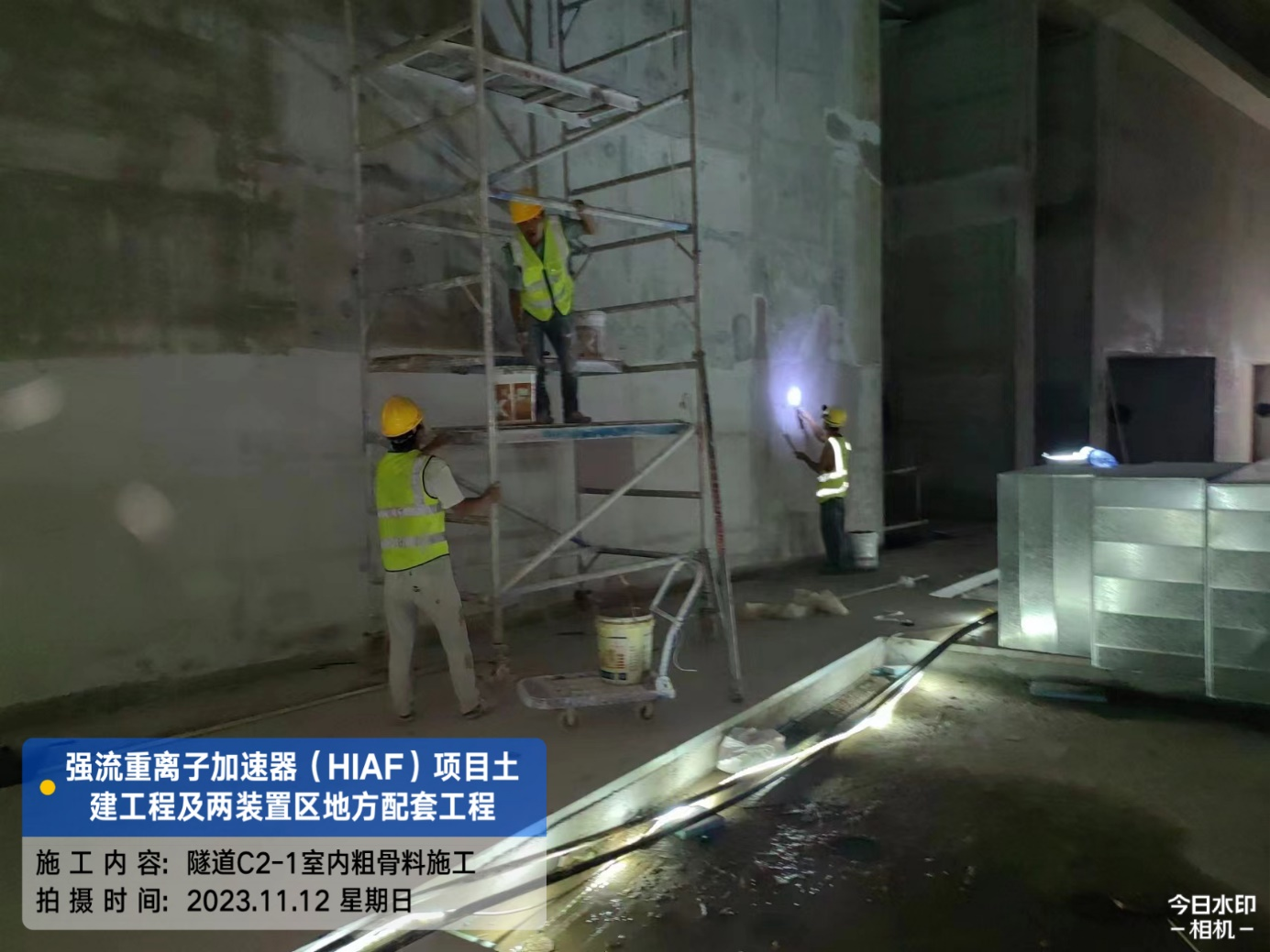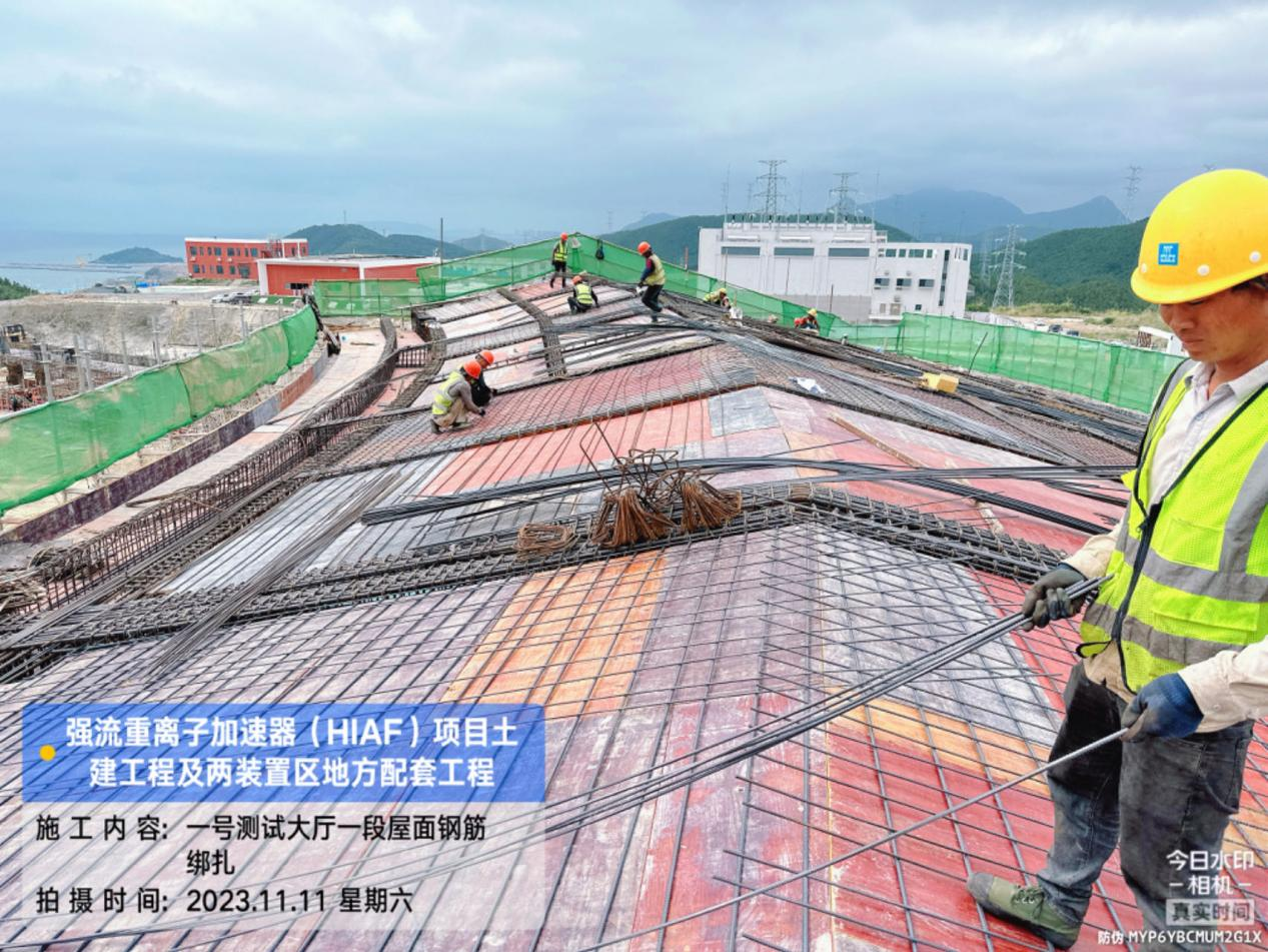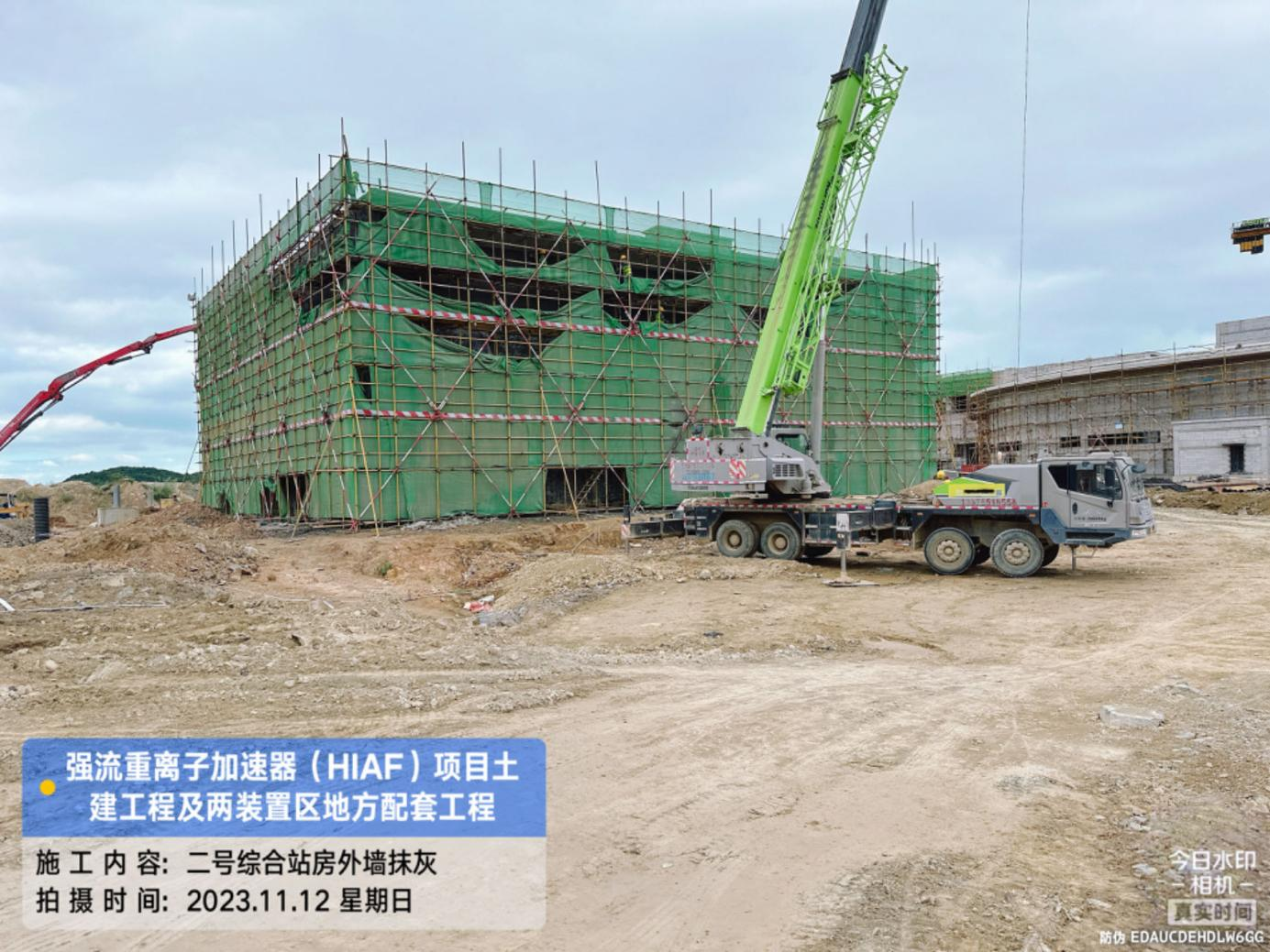 二、HIAF区其它单体:一号制冷中心RC-4轴外墙抹灰完成30%。综合测试大厅TH-3轴外墙抹灰完成。一号测试大厅PC1-1段屋面混凝土浇筑完成;PC1-8段(2/PC-42至PC-49轴)地梁混凝土浇筑完成;PC1-3段砌筑完成90%;PC1-4段砌筑完成40%;PC1-5段砌筑完成70%;PC1-6段砌筑完成30%。二号测试大厅屋面防水完成90%,屋面防水保护层完成30%;内墙抹灰完成40%,2.5以下构造柱浇筑完成90%。一号综合站房(2)内架拆除完成80%,(3)2.05m梁混凝土浇筑完成。二号综合站房内墙抹灰完成90%,顶棚腻子完成40%,窗框安装完成70%。直线设备楼2号楼LB2-3段(LB2-11至LB2-16轴)12.1m板混凝土浇筑完成,LB2-4段(LB2-16至LB2-19轴)8.6m板混凝土浇筑完成。室外综合管廊GL-A至GL-C轴牛脚、侧墙防水完成。室外E+420~520消防车道混凝土浇筑完成。