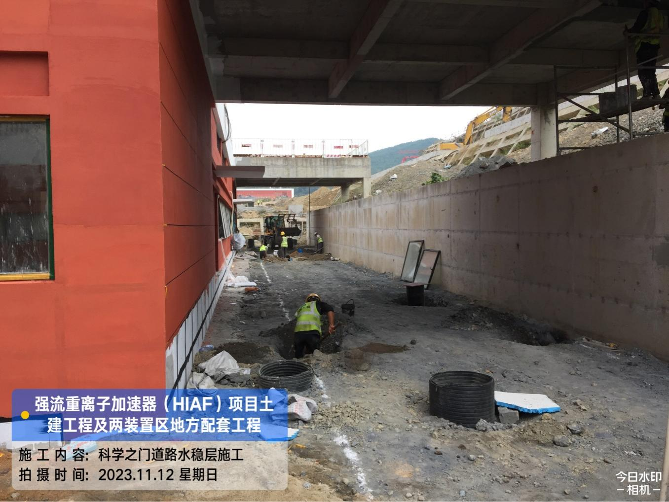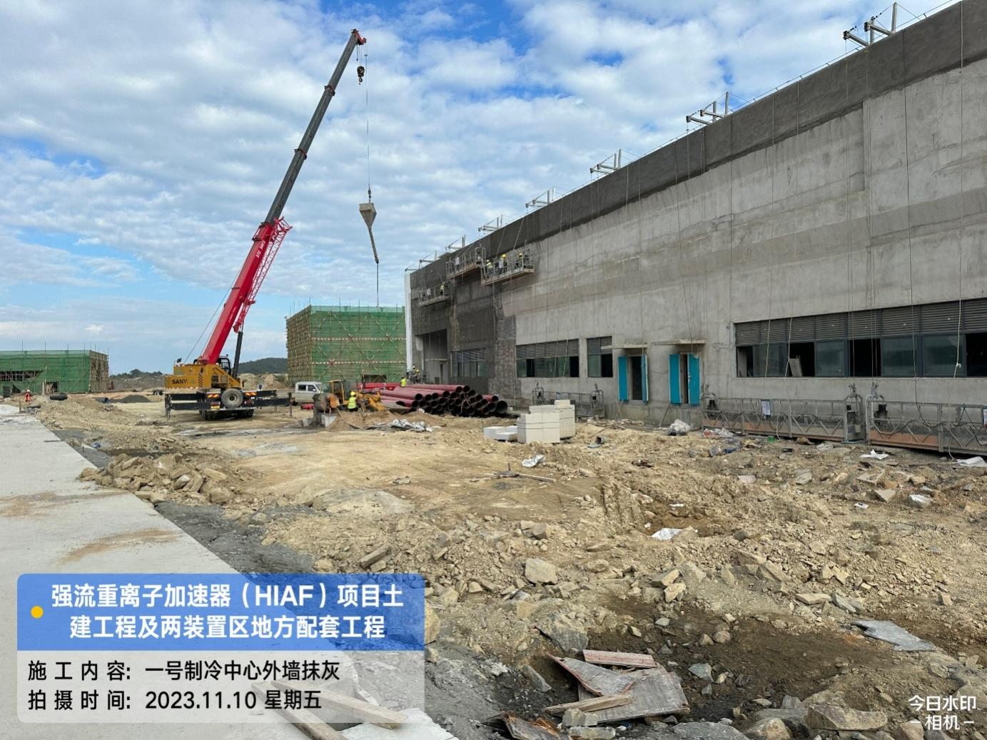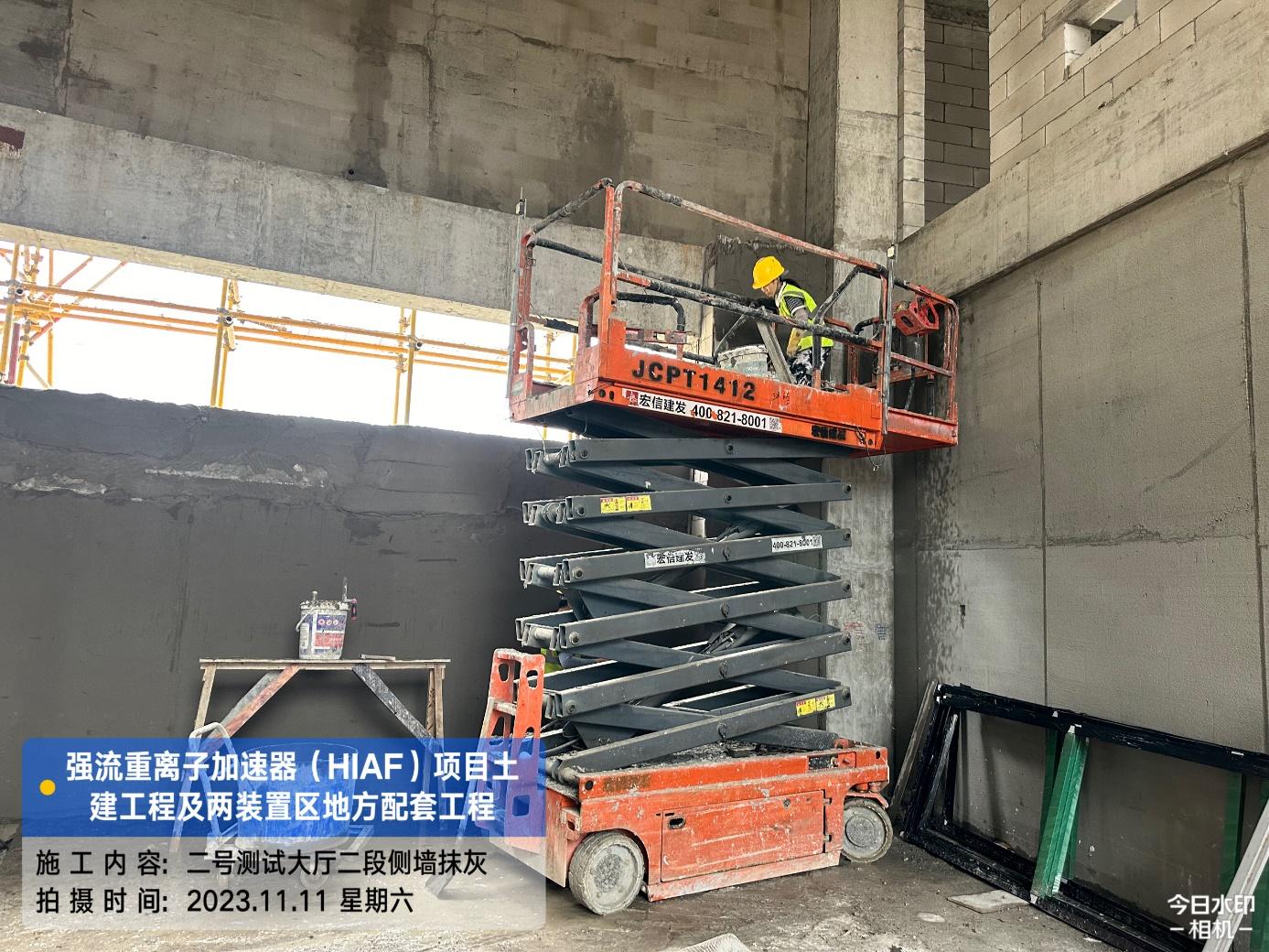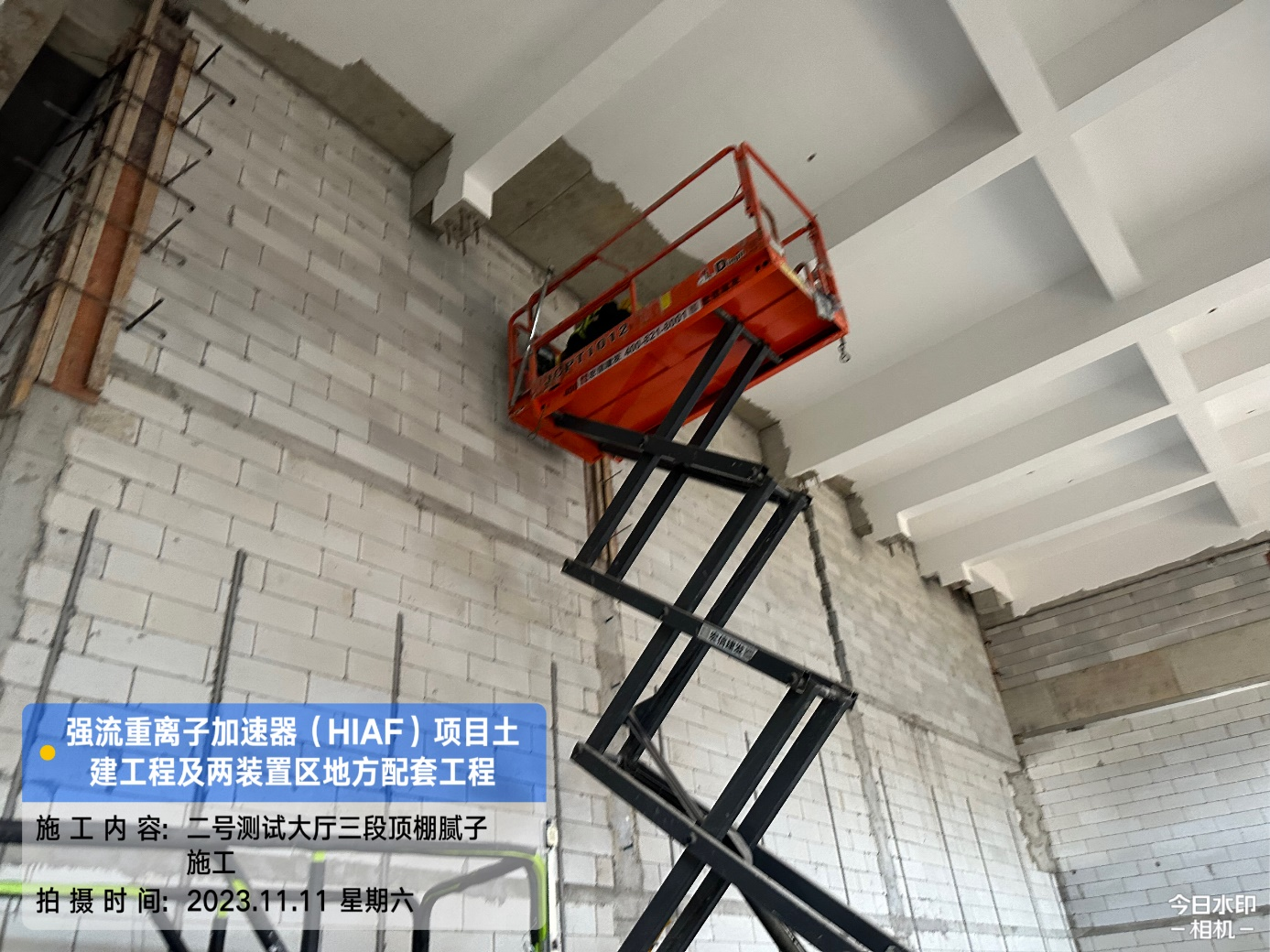 二、HIAF区其它单体:一号制冷中心RC-4轴外墙抹灰完成30%。综合测试大厅TH-3轴外墙抹灰完成。一号测试大厅PC1-1段屋面混凝土浇筑完成;PC1-8段(2/PC-42至PC-49轴)地梁混凝土浇筑完成;PC1-3段砌筑完成90%;PC1-4段砌筑完成40%;PC1-5段砌筑完成70%;PC1-6段砌筑完成30%。二号测试大厅屋面防水完成90%,屋面防水保护层完成30%;内墙抹灰完成40%,2.5以下构造柱浇筑完成90%。一号综合站房(2)内架拆除完成80%,(3)2.05m梁混凝土浇筑完成。二号综合站房内墙抹灰完成90%,顶棚腻子完成40%,窗框安装完成70%。直线设备楼2号楼LB2-3段(LB2-11至LB2-16轴)12.1m板混凝土浇筑完成,LB2-4段(LB2-16至LB2-19轴)8.6m板混凝土浇筑完成。室外综合管廊GL-A至GL-C轴牛脚、侧墙防水完成。室外E+420~520消防车道混凝土浇筑完成。