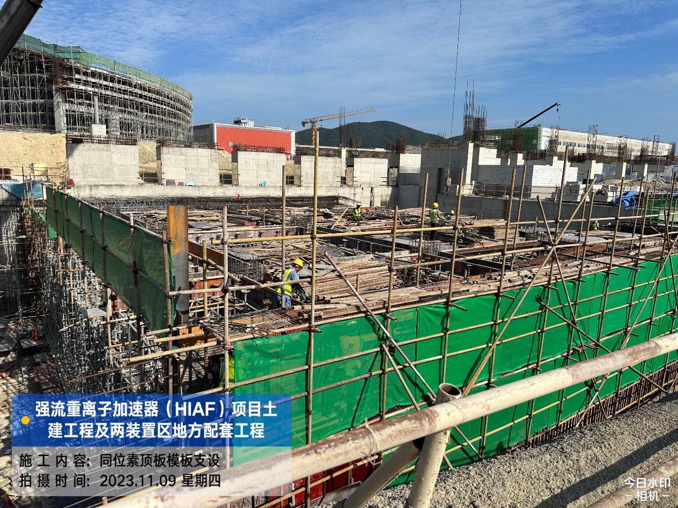 一、加速器隧道:直线隧道A1-3/4/5室内地面浇筑完成。同位素TW17-20轴交TWB-E轴侧墙混凝土浇筑完成,顶板模板完成60%。