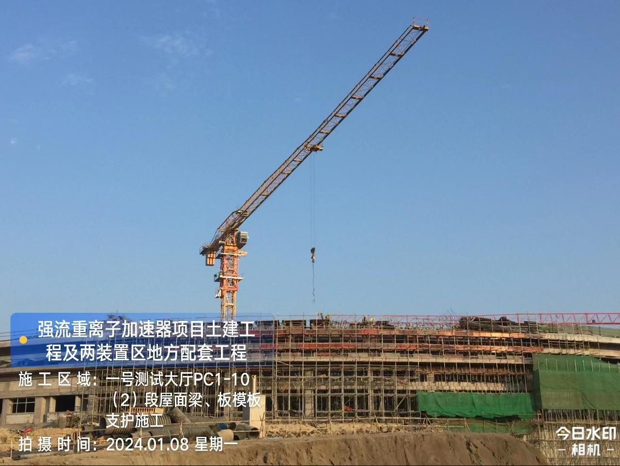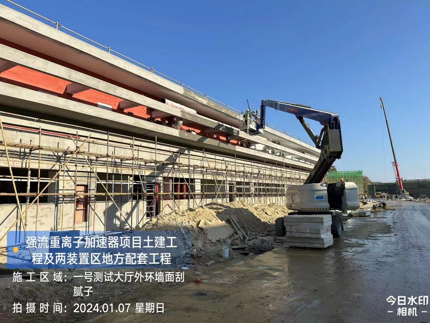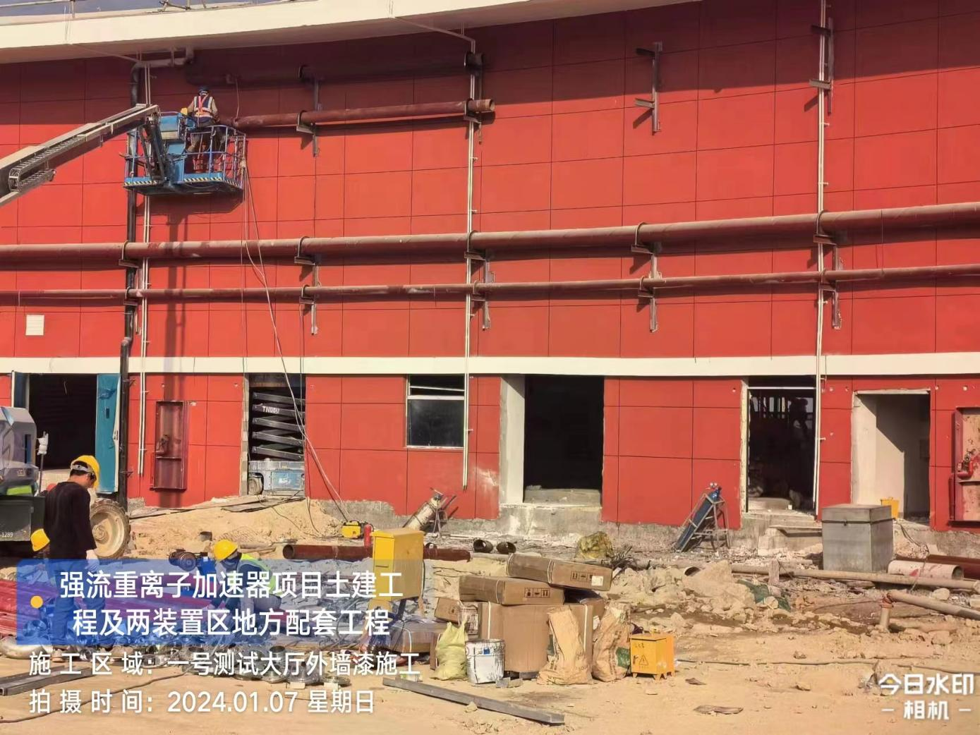 二、HIAF区其它单体:一号测试大厅PC1-2~4段外墙施工完成,外架拆除完成70%;PC1-9/10(1)段内架拆除完成;PC1-10(2)屋面梁、板模板支护完成80%。二号测试大厅室内地面浇筑完成90%,内环侧墙底漆完成90%。一号综合站房(1#)屋面钢筋绑扎完成,(2#)屋面防水保护层完成,内墙抹灰完成100%,(3#)墙体砌筑完成70%。直线设备楼(1#)13.15m标高屋面梁板模板完成100%,(2#)功率源设备间砌体完成60%。室外HIAF区路灯完成30个,后勤区路灯完成15个,消防车道D、J线水稳完成 100%,消防车道J线路缘石完成 80%,A线路缘石完成 30%。
